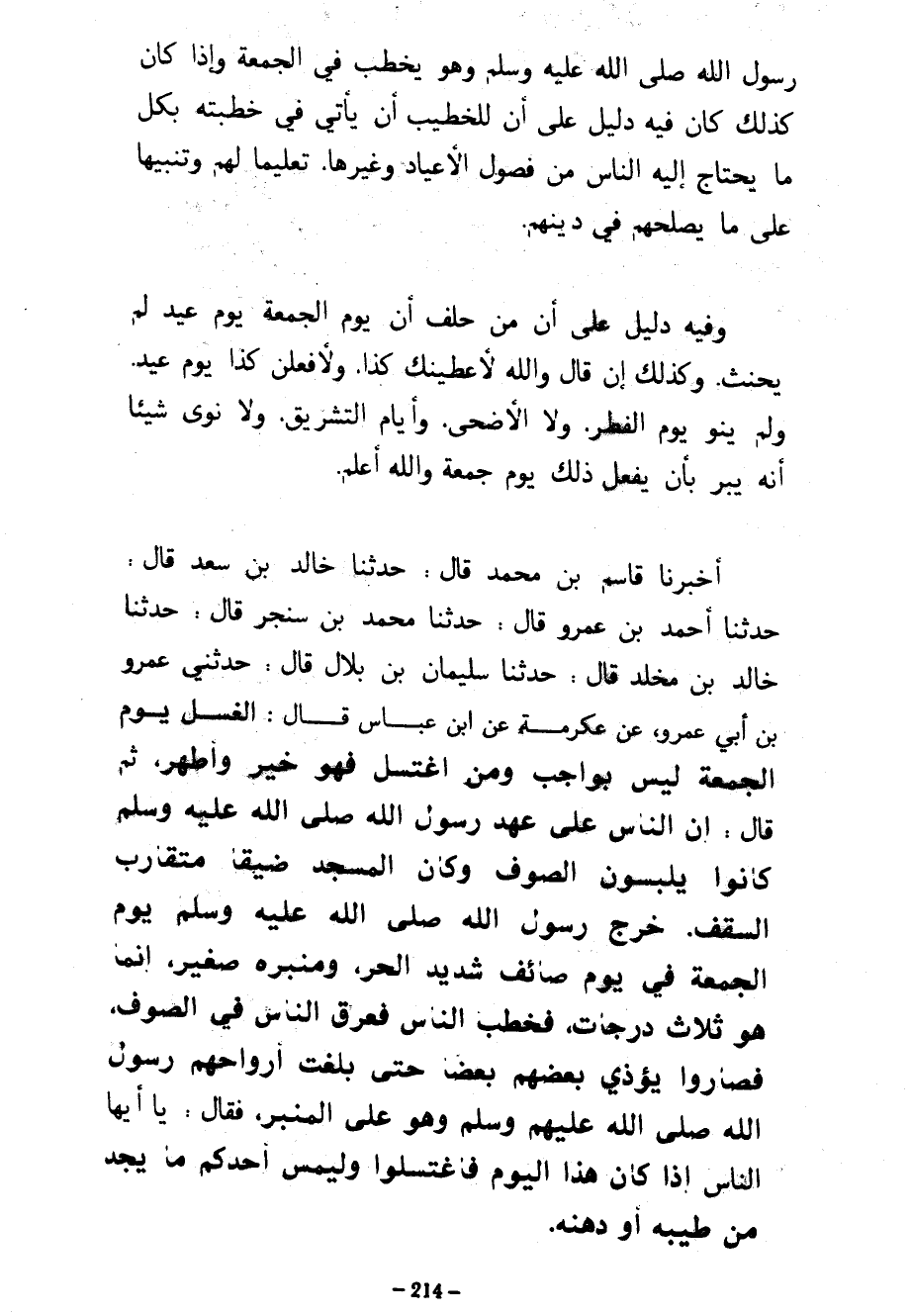 رسول الله صلى الله عليه وسلم وهو يَخْطُبُ فِي الْجُمْعَةِ وَإِذَا كَانَ كَذَلِكَ كَانَ فِيهِ دَلِيلٌ عَلَى أَنَّ لِلْخَطِيبِ أَنْ يَأْتِيَ فِي خُطْبَتِهِ بِكُلِّ مَا يَحْتَاجُ إِلَيْهِ النَّاسُ مِنْ فُصُولِ الْأَعْيَادِ وَغَيْرِهَا تَعْلِيمًا لَهُمْ وَتَنْبِيهًا عَلَى مَا يُصْلِحُهُمْ فِي دِينِهِمْ وَفِيهِ دَلِيلٌ عَلَى أَنَّ مَنْ حَلَفَ أَنَّ يَوْمَ الْجُمْعَةِ يَوْمُ عِيدٍ لَمْ يَحْنِثْ وَكَذَلِكَ إِنْ قَالَ وَاللَّهِ لَأُعْطِيَنَّكَ كَذَا وَلَأَفْعَلَنَّ كَذَا يَوْمَ عِيدٍ وَلَمْ يَنْوِ يَوْمَ الْفِطْرِ وَلَا الْأَضْحَى وَأَيَّامَ التَّشْرِيقِ وَلَا نَوَى شَيْئًا أَنَّهُ يَبِرُّ بِأَنْ يَفْعَلَ ذَلِكَ يَوْمَ جُمْعَةٍ وَاللَّهُ أَعْلَمُ أَخْبَرَنَا قَاسِمُ بْنُ مُحَمَّدٍ قَالَ حَدَّثَنَا خَالِدُ بْنُ سَعْدٍ قَالَ حَدَّثَنَا أَحْمَدُ بْنُ عَمْرٍو قَالَ حَدَّثَنَا محمد بن سنجر قال حدثنا خَالِدُ بْنُ مَخْلَدٍ قَالَ حَدَّثَنَا سُلَيْمَانُ بْنُ بِلَالٍ قَالَ حَدَّثَنِي عَمْرِو بْنِ أَبِي عَمْرٍو عَنْ عِكْرِمَةَ عَنِ ابن عباس قال الغسل يوم الجمعة ليس بواجب ومن اغتسل فهو خير وَأَطْهَرُ ثُمَّ قَالَ إِنَّ النَّاسُ عَلَى عَهْدِ رَسُولِ اللَّهِ صَلَّى اللَّهُ عَلَيْهِ وَسَلَّمَ كَانُوا يَلْبَسُونَ الصُّوفَ وَكَانَ الْمَسْجِدُ ضَيِّقًا مُتَقَارِبَ السَّقْفِ خَرَجَ رَسُولُ اللَّهِ صَلَّى اللَّهُ عَلَيْهِ وَسَلَّمَ يَوْمَ الْجُمْعَةِ فِي يَوْمٍ صَائِفٍ شَدِيدِ الْحَرِّ وَمِنْبَرُهُ صَغِيرٌ إِنَّمَا هُوَ ثَلَاثُ دَرَجَاتٍ فَخَطَبَ النَّاسَ فَعَرِقَ النَّاسُ فِي الصُّوفِ فَصَارُوا يُؤْذِي بَعْضُهُمْ بَعْضًا حَتَّى بَلَغَتْ أَرْوَاحُهُمْ رَسُولَ اللَّهِ صَلَّى اللَّهُ عَلَيْهِ وَسَلَّمَ وَهُوَ عَلَى الْمِنْبَرِ فَقَالَ يَا أَيُّهَا النَّاسُ إِذَا كَانَ هَذَا الْيَوْمُ فَاغْتَسِلُوا وَلْيَمَسَّ أَحَدُكُمْ مَا يَجِدُ مِنْ طِيبِهِ أَوْ دُهْنِهِ