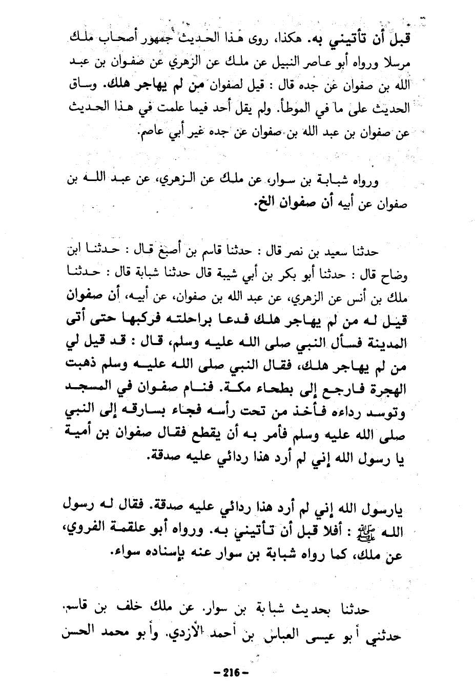 قَبْلَ أَنْ تَأْتِيَنِي بِهِ هَكَذَا رَوَى هَذَا الْحَدِيثَ جُمْهُورُ أَصْحَابِ مَالِكٍ مُرْسَلًا وَرَوَاهُ أَبُو عاصر النَّبِيلُ عَنْ مَالِكٍ عَنِ الزُّهْرِيِّ عَنْ صَفْوَانَ بْنِ عَبْدِ اللَّهِ بْنِ صَفْوَانَ عَنْ جَدِّهِ قَالَ قِيلَ لِصَفْوَانَ مَنْ لَمْ يُهَاجِرْ هَلَكَ وَسَاقَ الْحَدِيثَ عَلَى مَا فِي الْمُوَطَّأِ وَلَمْ يَقُلْ أَحَدٌ فِيمَا عَلِمْتُ فِي هَذَا الْحَدِيثِ عَنْ صَفْوَانَ بْنِ عَبْدِ اللَّهِ بْنِ صَفْوَانَ عَنْ جَدِّهِ غَيْرُ أَبِي عَاصِمٍ وَرَوَاهُ شَبَابَةُ بْنُ سَوَّارٍ عَنْ مَالِكٍ عَنِ الزُّهْرِيِّ عَنْ عَبْدِ اللَّهِ بْنِ صَفْوَانَ عَنْ أَبِيهِ أَنَّ صَفْوَانَ إِلَخْ حَدَّثَنَا سَعِيدُ بْنُ نَصْرٍ قَالَ حَدَّثَنَا قَاسِمُ بْنُ أَصْبَغَ قَالَ حَدَّثَنَا ابْنُ وَضَّاحٍ قَالَ حَدَّثَنَا أَبُو بَكْرِ بْنُ أَبِي شَيْبَةَ قَالَ حَدَّثَنَا شَبَابَةُ قَالَ حَدَّثَنَا مَالِكُ بْنُ أَنَسٍ عَنِ الزُّهْرِيِّ عَنْ عَبْدِ اللَّهِ بْنِ صَفْوَانَ عَنْ أَبِيهِ أَنَّ صَفْوَانَ قِيلَ لَهُ مَنْ لَمْ يُهَاجِرْ هَلَكَ فَدَعَا بِرَاحِلَتِهِ فَرَكِبَهَا حَتَّى أَتَى الْمَدِينَةَ فَسَأَلَ النَّبِيَّ صَلَّى اللَّهُ عَلَيْهِ وَسَلَّمَ قَالَ قَدْ قِيلَ لِي مَنْ لَمْ يُهَاجِرْ هَلَكَ فَقَالَ النَّبِيُّ صَلَّى اللَّهُ عَلَيْهِ وَسَلَّمَ ذَهَبَتِ الْهِجْرَةُ فَارْجِعْ إِلَى بَطْحَاءِ مَكَّةَ فَنَامَ صَفْوَانُ فِي الْمَسْجِدِ وَتَوَسَّدَ رِدَاءَهُ فَأُخِذَ مِنْ تَحْتِ رَأْسِهِ فَجَاءَ بِسَارِقِهِ إِلَى النَّبِيِّ صَلَّى اللَّهُ عَلَيْهِ وَسَلَّمَ فَأَمَرَ بِهِ أَنْ يُقْطَعَ فَقَالَ صَفْوَانُ بْنُ أُمَيَّةَ يَا رَسُولَ اللَّهِ إِنِّي لَمْ أُرِدْ هَذَا ردائي عليه صدقة يَا رَسُولَ اللَّهِ إِنِّي لَمْ أُرِدْ هَذَا رِدَائِي عَلَيْهِ صَدَقَةٌ فَقَالَ لَهُ رَسُولُ اللَّهِ صَلَّى اللَّهُ عَلَيْهِ وَسَلَّمَ أَفَلَا قَبْلَ أَنْ تَأْتِيَنِي بِهِ وَرَوَاهُ أَبُو عَلْقَمَةَ الْفَرَوِيُّ عَنْ مَالِكٍ كَمَا رَوَاهُ شَبَابَةُ بْنُ سَوَّارٍ عَنْهُ بِإِسْنَادِهِ سَوَاءً حَدَّثَنَا بِحَدِيثِ شَبَابَةَ بْنِ سَوَّارٍ عَنْ مَالِكٍ خَلَفُ بْنُ قَاسِمٍ حَدَّثَنِي أَبُو عِيسَى الْعَبَّاسُ بْنُ أَحْمَدَ الْأَزْدِيُّ وَأَبُو مُحَمَّدٍ الحسن
