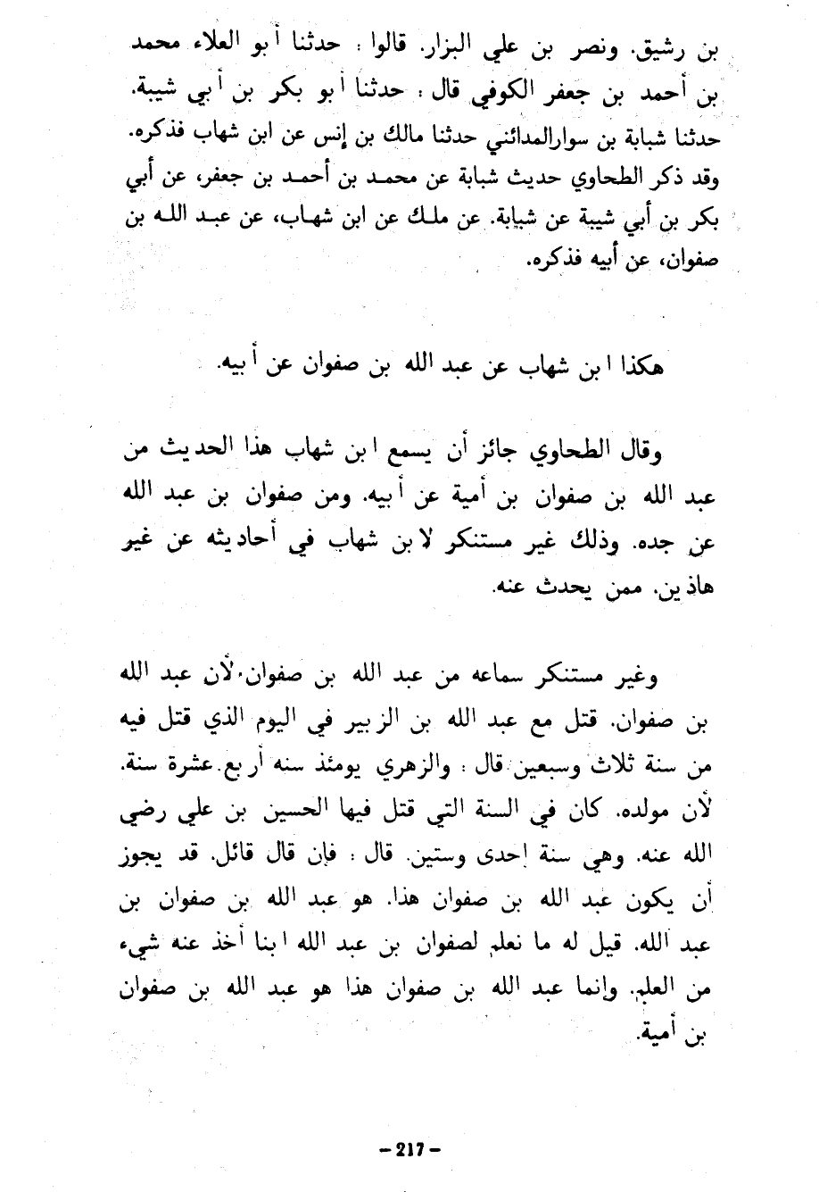 بْنُ رَشِيقٍ وَنَصْرُ بْنُ عَلِيٍّ الْبَزَّارُ قَالُوا حَدَّثَنَا أَبُو الْعَلَاءِ مُحَمَّدُ بْنُ أَحْمَدَ بْنِ جَعْفَرٍ الْكُوفِيُّ قَالَ حَدَّثَنَا أَبُو بَكْرِ بْنُ أَبِي شَيْبَةَ حَدَّثَنَا شَبَابَةُ بْنُ سَوَّارٍ الْمَدَائِنِيُّ حَدَّثَنَا مَالِكُ بْنُ أَنَسٍ عَنِ ابْنِ شِهَابٍ فَذَكَرَهُ وَقَدْ ذَكَرَ الطَّحَاوِيُّ حَدِيثَ شَبَابَةَ عَنْ مُحَمَّدِ بْنِ أَحْمَدَ بْنِ جَعْفَرٍ عَنْ أَبِي بَكْرِ بْنِ أَبِي شَيْبَةَ عَنْ شَبَابَةَ عَنْ مَالِكٌ عَنِ ابْنِ شِهَابٍ عَنْ عَبْدِ اللَّهِ بْنِ صَفْوَانَ عَنْ أَبِيهِ فَذَكَرَهُ هَكَذَا ابْنُ شِهَابٍ عَنْ عَبْدِ اللَّهِ بْنِ صَفْوَانَ عَنْ أَبِيهِ وَقَالَ الطَّحَاوِيُّ جَائِزٌ أَنْ يَسْمَعَ ابْنُ شِهَابٍ هَذَا الْحَدِيثَ مِنْ عَبْدِ اللَّهِ بْنِ صَفْوَانَ بْنِ أُمَيَّةَ عَنْ أَبِيهِ وَمِنْ صَفْوَانَ بْنِ عَبْدِ اللَّهِ عَنْ جَدِّهِ وَذَلِكَ غَيْرُ مُسْتَنْكَرٍ لِابْنِ شِهَابٍ فِي أَحَادِيثِهِ عَنْ غَيْرِ هاذين مِمَّنْ يُحَدِّثُ عَنْهُ وَغَيْرُ مُسْتَنْكَرٍ سَمَاعُهُ مِنْ عَبْدِ اللَّهِ بْنِ صَفْوَانَ لِأَنَّ عَبْدَ اللَّهِ بْنَ صَفْوَانَ قُتِلَ مَعَ عَبْدِ اللَّهِ بْنِ الزُّبَيْرِ فِي الْيَوْمِ الَّذِي قُتِلَ فِيهِ مِنْ سَنَةِ ثَلَاثٍ وَسَبْعِينَ قَالَ وَالزُّهْرِيُّ يَوْمَئِذٍ سِنُّهُ أَرْبَعَ عَشْرَةَ سَنَةً لِأَنَّ مَوْلِدَهُ كَانَ فِي السَّنَةِ الَّتِي قُتِلَ فِيهَا الْحُسَيْنُ بْنُ عَلِيٍّ رَضِيَ اللَّهُ عَنْهُ وَهِيَ سَنَةُ إِحْدَى وَسِتِّينَ قَالَ فَإِنْ قَالَ قَائِلٌ قَدْ يَجُوزُ أَنْ يَكُونَ عَبْدُ اللَّهِ بْنُ صَفْوَانَ هَذَا هُوَ عَبْدُ اللَّهِ بْنُ صَفْوَانَ بْنِ عَبْدِ اللَّهِ قِيلَ لَهُ مَا نَعْلَمُ لِصَفْوَانَ بْنِ عَبْدِ الله ابنا أخذ عنه شيء مِنَ الْعِلْمِ وَإِنَّمَا عَبْدُ اللَّهِ بْنُ صَفْوَانَ هَذَا هُوَ عَبْدُ اللَّهِ بْنُ صَفْوَانَ بْنِ أمية
