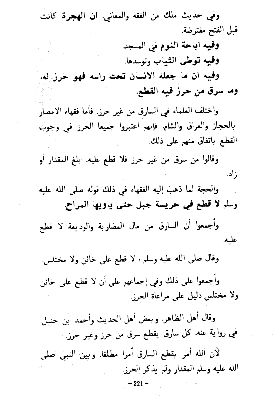 وَفِي حَدِيثِ مَالِكٍ مِنَ الْفِقْهِ وَالْمَعَانِي أَنَّ الْهِجْرَةَ كَانَتْ قَبْلَ الْفَتْحِ مُفْتَرَضَةً وَفِيهِ إِبَاحَةُ النَّوْمِ فِي الْمَسْجِدِ وَفِيهِ تَوَطِّي الثِّيَابِ وَتَوَسُّدُهَا وَفِيهِ أَنَّ مَا جَعَلَهُ الْإِنْسَانُ تَحْتَ رَأْسِهِ فَهُوَ حِرْزٌ لَهُ وَمَا سُرِقَ مِنْ حِرْزٍ فِيهِ الْقَطْعُ وَاخْتَلَفَ الْعُلَمَاءُ فِي السَّارِقِ مِنْ غير حِرْزٍ فَأَمَّا فُقَهَاءُ الْأَمْصَارِ بِالْحِجَازِ وَالْعِرَاقِ وَالشَّامِ فَإِنَّهُمُ اعْتَبَرُوا جَمِيعًا الْحِرْزَ فِي وُجُوبِ الْقَطْعِ بِاتِّفَاقٍ مِنْهُمْ عَلَى ذَلِكَ وَقَالُوا مَنْ سَرَقَ مِنْ غَيْرِ حِرْزٍ فَلَا قَطْعَ عَلَيْهِ بَلَغَ الْمِقْدَارَ أَوْ زَادَ وَالْحُجَّةُ لِمَا ذَهَبَ إِلَيْهِ الْفُقَهَاءُ فِي ذَلِكَ قَوْلُهُ صَلَّى اللَّهُ عَلَيْهِ وَسَلَّمَ لَا قَطْعَ فِي حَرِيسَةِ جَبَلٍ حَتَّى يَأْوِيَهَا الْمُرَاحُ وَأَجْمَعُوا أَنَّ السَّارِقَ مِنْ مَالِ الْمُضَارَبَةِ وَالْوَدِيعَةِ لَا قَطْعَ عَلَيْهِ وَقَالَ صَلَّى اللَّهُ عَلَيْهِ وَسَلَّمَ لَا قَطْعَ عَلَى خَائِنٍ وَلَا مُخْتَلِسٍ وَأَجْمَعُوا عَلَى ذَلِكَ وَفِي إِجْمَاعِهِمْ عَلَى أَنْ لَا قَطْعَ عَلَى خَائِنٍ وَلَا مُخْتَلِسٍ دَلِيلٌ عَلَى مُرَاعَاةِ الْحِرْزِ وَقَالَ أَهْلُ الظَّاهِرِ وَبَعْضُ أَهْلِ الْحَدِيثِ وَأَحْمَدُ بْنُ حَنْبَلٍ فِي رِوَايَةٍ عَنْهُ كُلُّ سَارِقٍ يُقْطَعُ سَرَقَ مِنْ حِرْزٍ وَغَيْرِ حِرْزٍ لِأَنَّ اللَّهَ أَمَرَ بِقَطْعِ السَّارِقِ أَمْرًا مُطْلَقًا وَبَيَّنَ النَّبِيُّ صَلَّى اللَّهُ عَلَيْهِ وَسَلَّمَ الْمِقْدَارَ وَلَمْ يَذْكُرِ الْحِرْزَ