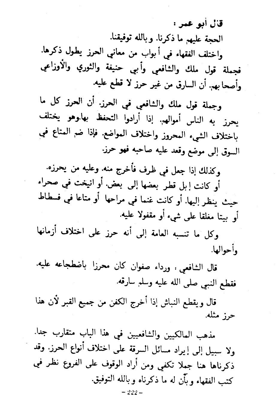 قَالَ أَبُو عُمَرَ الْحُجَّةُ عَلَيْهِمْ مَا ذَكَرْنَا وَبِاللَّهِ تَوْفِيقُنَا وَاخْتَلَفَ الْفُقَهَاءُ فِي أَبْوَابٍ مِنْ مَعَانِي الْحِرْزِ يَطُولُ ذِكْرُهَا فَجُمْلَةُ قَوْلُ مَالِكٍ وَالشَّافِعِيِّ وَأَبِي حَنِيفَةَ وَالثَّوْرِيِّ وَالْأَوْزَاعِيِّ وَأَصْحَابِهِمْ أَنَّ السَّارِقَ مِنْ غَيْرِ حِرْزٍ لَا قَطْعَ عَلَيْهِ وَجُمْلَةُ قَوْلِ مَالِكٍ وَالشَّافِعِيِّ فِي الْحِرْزِ أَنَّ الْحِرْزَ كُلُّ مَا يُحْرِزُ بِهِ النَّاسُ أَمْوَالَهُمْ إِذَا أَرَادُوا التَّحَفُّظَ بِهَا وَهُوَ يَخْتَلِفُ بِاخْتِلَافِ الشَّيْءِ الْمَحْرُوزِ وَاخْتِلَافِ الْمَوَاضِعِ فَإِذَا ضُمَّ الْمَتَاعُ فِي السُّوقِ إِلَى مَوْضِعٍ وَقَعَدَ عَلَيْهِ صَاحِبُهُ فَهُوَ حِرْزٌ وَكَذَلِكَ إِذَا جُعِلَ فِي ظَرْفٍ فَأُخْرِجَ مِنْهُ وَعَلَيْهِ مَنْ يُحْرِزُهُ أَوْ كَانَتْ إِبِلَ قُطْرٍ بَعْضُهَا إِلَى بَعْضٍ أَوْ أُنِيخَتْ فِي صَحْرَاءَ حَيْثُ يُنْظَرُ إِلَيْهَا أَوْ كَانَتْ غَنَمًا فِي مُرَاحِهَا أَوْ مَتَاعًا فِي فُسْطَاطٍ أَوْ بَيْتًا مُغْلَقًا عَلَى شَيْءٍ أَوْ مَقْفُولًا عَلَيْهِ وَكُلُّ مَا تَنْسُبُهُ الْعَامَّةُ إِلَى أَنَّهُ حِرْزٌ عَلَى اخْتِلَافِ أَزْمَانِهَا وَأَحْوَالِهَا قَالَ الشَّافِعِيُّ وَرِدَاءُ صَفْوَانَ كَانَ مُحْرَزًا بِاضْطِجَاعِهِ عَلَيْهِ فَقَطَعَ النَّبِيُّ صَلَّى اللَّهُ عَلَيْهِ وَسَلَّمَ سَارِقَهُ قَالَ وَيُقْطَعُ النَّبَّاشُ إِذَا أَخْرَجَ الْكَفَنَ مِنْ جَمِيعِ الْقَبْرِ لِأَنَّ هَذَا حِرْزُ مِثْلِهِ مَذْهَبُ الْمَالِكِيِّينَ وَالشَّافِعِيِّينَ فِي هَذَا الْبَابِ مُتَقَارِبٌ جِدًّا وَلَا سَبِيلَ إِلَى إِيرَادِ مَسَائِلِ السَّرِقَةِ عَلَى اخْتِلَافِ أنواع الحرز وقد ذكرناها هنا جُمَلًا تَكْفِي وَمَنْ أَرَادَ الْوُقُوفَ عَلَى الْفُرُوعِ نَظَرَ فِي كُتُبِ الْفُقَهَاءِ وَبَانَ لَهُ مَا ذَكَرْنَاهُ وَبِاللَّهِ التَّوْفِيقُ