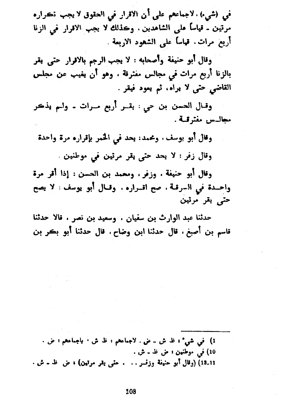 فِي (شَيْءٍ) لِإِجْمَاعِهِمْ عَلَى أَنَّ الْإِقْرَارَ فِي الْحُقُوقِ لَا يَجِبُ تَكْرَارُهُ مَرَّتَيْنِ قِيَاسًا عَلَى الشَّاهِدَيْنِ وَكَذَلِكَ لَا يَجِبُ الْإِقْرَارُ فِي الزِّنَا أَرْبَعَ مَرَّاتٍ قِيَاسًا عَلَى الشُّهُودِ الْأَرْبَعَةِ وَقَالَ أَبُو حَنِيفَةَ وَأَصْحَابُهُ لَا يَجِبُ الرَّجْمُ بِالْإِقْرَارِ حَتَّى يُقِرَّ بِالزِّنَا أَرْبَعَ مَرَّاتٍ فِي مَجَالِسَ مُفْتَرِقَةٍ وَهُوَ أَنْ يَغِيبَ عَنْ مَجْلِسِ الْقَاضِي حَتَّى لَا يَرَاهُ ثُمَّ يَعُودَ فَيُقِرَّ وَقَالَ الْحَسَنُ بْنُ حَيٍّ يُقِرُّ أَرْبَعَ مَرَّاتٍ وَلَمْ يَذْكُرْ مَجَالِسَ مُفْتَرِقَةً وَقَالَ أَبُو يُوسُفَ وَمُحَمَّدٌ يُحَدُّ فِي الْخَمْرِ بِإِقْرَارِهِ مَرَّةً وَاحِدَةً وَقَالَ زُفَرُ لَا يُحَدُّ حَتَّى يُقِرَّ مَرَّتَيْنِ فِي مَوْطِنَيْنِ وَقَالَ أَبُو حَنِيفَةَ وَزُفَرُ وَمُحَمَّدُ بْنُ الْحَسَنِ إِذَا أَقَرَّ مَرَّةً وَاحِدَةً فِي السَّرِقَةِ صَحَّ إِقْرَارُهُ وَقَالَ أَبُو يُوسُفَ لَا يَصِحُّ حَتَّى يُقِرَّ مَرَّتَيْنِ حَدَّثَنَا عَبْدُ الْوَارِثِ بْنُ سُفْيَانَ وَسَعِيدُ بْنُ نَصْرٍ قَالَا حَدَّثَنَا قَاسِمُ بْنُ أَصْبَغَ قَالَ حَدَّثَنَا ابْنُ وَضَّاحٍ قَالَ حَدَّثَنَا أَبُو بَكْرِ بْنُ