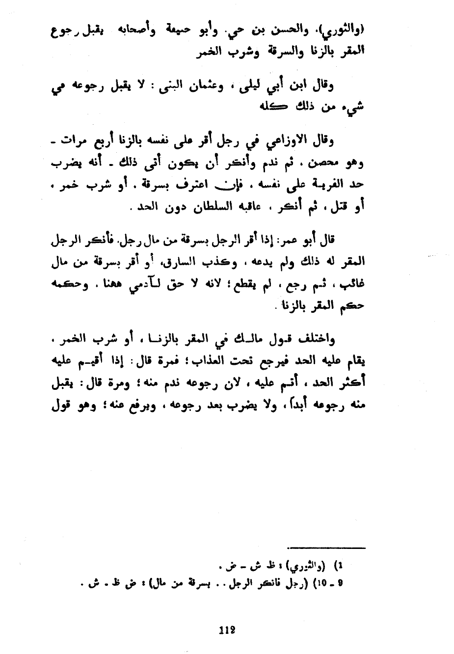 (وَالثَّوْرِيُّ) وَالْحَسَنُ بْنُ حَيٍّ وَأَبُو حَنِيفَةَ وَأَصْحَابُهُ يُقْبَلُ رُجُوعُ الْمُقِرِّ بِالزِّنَا وَالسَّرِقَةِ وَشُرْبِ الْخَمْرِ وَقَالَ ابْنُ أَبِي لَيْلَى وَعُثْمَانُ الْبَتِّيُّ لَا يُقْبَلُ رُجُوعُهُ فِي شَيْءٍ مِنْ ذَلِكَ كُلِّهِ وَقَالَ الْأَوْزَاعِيُّ فِي رَجُلٍ أَقَرَّ عَلَى نَفْسِهِ بِالزِّنَا أَرْبَعَ مَرَّاتٍ وَهُوَ مُحْصَنٌ ثُمَّ نَدِمَ وَأَنْكَرَ أَنْ يَكُونَ أَتَى ذَلِكَ أَنَّهُ يُضْرَبُ حَدَّ الْفِرْيَةِ عَلَى نَفْسِهِ فَإِنِ اعْتَرَفَ بِسَرِقَةٍ أَوْ شُرْبِ خَمْرٍ أَوْ قَتْلٍ ثُمَّ أَنْكَرَ عَاقَبَهُ السُّلْطَانُ دُونَ الْحَدِّ قَالَ أَبُو عُمَرَ إِذَا أَقَرَّ الرَّجُلُ بِسَرِقَةٍ مِنْ مَالِ رَجُلٍ فَأَنْكَرَ الرَّجُلُ الْمُقَرُّ لَهُ ذَلِكَ وَلَمْ يَدَّعِهِ وَكَذَّبَ السَّارِقَ أَوْ أَقَرَّ بِسَرِقَةٍ مِنْ مَالِ غَائِبٍ ثُمَّ رَجَعَ لَمْ يُقْطَعْ لِأَنَّهُ لَا حق لآدمي ههنا وَحُكْمُهُ حُكْمُ الْمُقِرِّ بِالزِّنَا وَاخْتَلَفَ قَوْلُ مَالِكٍ فِي الْمُقِرِّ بِالزِّنَا أَوْ شُرْبِ الْخَمْرِ يُقَامُ عَلَيْهِ الْحَدُّ فَيَرْجِعُ تَحْتَ الْعَذَابِ فَمَرَّةً قَالَ إِذَا أُقِيمَ عَلَيْهِ أَكْثَرُ الْحَدِّ أُتِمَّ عَلَيْهِ لِأَنَّ رُجُوعَهُ نَدَمٌ مِنْهُ وَمَرَّةً قَالَ يُقْبَلُ مِنْهُ رُجُوعُهُ أَبَدًا وَلَا يُضْرَبُ بَعْدَ رُجُوعِهِ وَيُرْفَعُ عَنْهُ وَهُوَ قَوْلُ