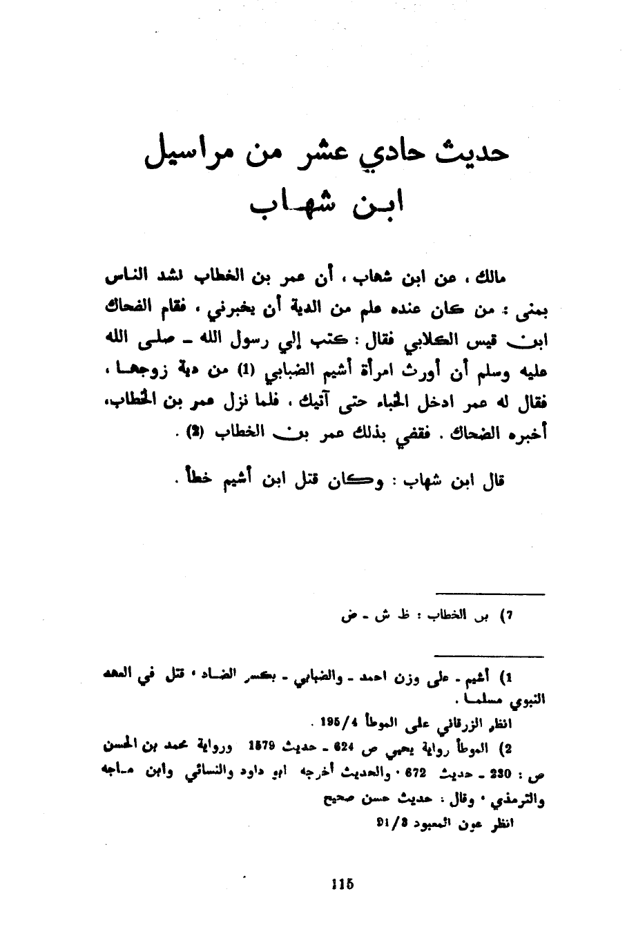 مَالِكٌ عَنِ ابْنِ شِهَابٍ أَنَّ عُمَرَ بْنَ الْخَطَّابِ نَشَدَ النَّاسَ بِمِنًى مَنْ كَانَ عِنْدَهُ عِلْمٌ مِنَ الدِّيَةِ أَنْ يُخْبِرَنِي فَقَامَ الضَّحَّاكُ بْنُ قَيْسٍ الْكِلَابِيُّ فَقَالَ كَتَبَ إِلَيَّ رَسُولُ اللَّهِ صَلَّى اللَّهُ عَلَيْهِ وَسَلَّمَ أو أَوْرِثِ امْرَأَةَ أَشْيَمَ الضِّبَابِيِّ مِنْ دِيَةِ زَوْجِهَا فَقَالَ لَهُ عُمَرُ ادْخُلِ الْخِبَاءَ حَتَّى آتِيَكَ فَلَمَّا نَزَلَ عُمَرُ بْنُ الْخَطَّابِ أَخْبَرَهُ الضَّحَّاكُ فَقَضَى بِذَلِكَ عُمَرُ بْنُ الْخَطَّابِ قَالَ ابْنُ شِهَابٍ وَكَانَ قَتْلُ ابْنِ أَشْيَمَ خَطَأً