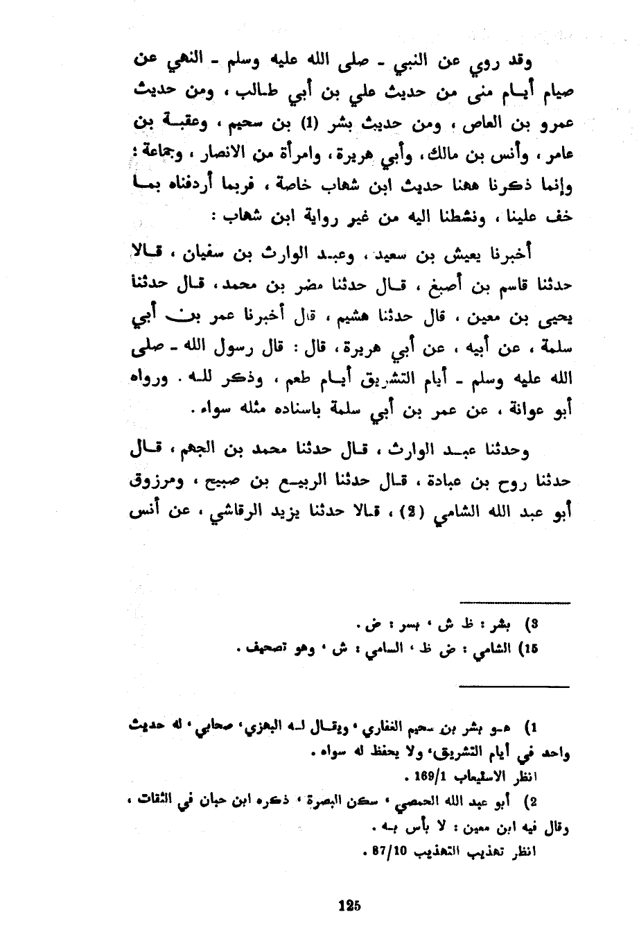 وَقَدْ رُوِيَ عَنِ النَّبِيِّ صَلَّى اللَّهُ عَلَيْهِ وَسَلَّمَ النَّهْيُ عَنْ صِيَامِ أَيَّامِ مِنًى مِنْ حَدِيثِ عَلِيِّ بْنِ أَبِي طَالِبٍ وَمِنْ حَدِيثِ عَمْرِو بْنِ الْعَاصِ وَمِنْ حَدِيثِ بِشْرِ بْنِ سُحَيْمٍ وَعُقْبَةَ بْنِ عَامِرٍ وَأَنَسِ بْنِ مَالِكٍ وَأَبِي هُرَيْرَةَ وَامْرَأَةٍ مِنَ الْأَنْصَارِ وَجَمَاعَةٍ وَإِنَّمَا ذكرنا ههنا حَدِيثَ ابْنِ شِهَابٍ خَاصَّةً فَرُبَّمَا أَرْدَفْنَاهُ بِمَا خَفَّ عَلَيْنَا وَنَشَطْنَا إِلَيْهِ مِنْ غَيْرِ رِوَايَةِ ابْنِ شِهَابٍ أَخْبَرَنَا يَعِيشُ بْنُ سَعِيدٍ وَعَبْدُ الْوَارِثِ بْنُ سُفْيَانَ قَالَا حَدَّثَنَا قَاسِمُ بْنُ أَصْبَغَ قَالَ حَدَّثَنَا مُضَرُ بْنُ مُحَمَّدٍ قَالَ حَدَّثَنَا يَحْيَى بْنُ مَعِينٍ قَالَ حَدَّثَنَا هُشَيْمٌ قَالَ أَخْبَرَنَا عُمَرُ بْنُ أَبِي سَلَمَةَ عَنْ أَبِيهِ عَنْ أَبِي هُرَيْرَةَ قَالَ قَالَ رَسُولُ اللَّهِ صَلَّى اللَّهُ عَلَيْهِ وَسَلَّمَ أَيَّامَ التَّشْرِيقِ أَيَّامُ طُعْمٍ وَذِكْرٍ لِلَّهِ وَرَوَاهُ أَبُو عَوَانَةَ عَنْ عُمَرَ بْنِ أَبِي سَلَمَةَ بِإِسْنَادِهِ مِثْلَهُ سَوَاءً وَحَدَّثَنَا عَبْدُ الْوَارِثِ قَالَ حَدَّثَنَا مُحَمَّدُ بْنُ الْجَهْمِ قَالَ حَدَّثَنَا رَوْحُ بْنُ عُبَادَةَ قَالَ حَدَّثَنَا الرَّبِيعُ بْنُ صُبَيْحٍ وَمَرْزُوقٌ أَبُو عَبْدِ اللَّهِ الشَّامِيُّ قَالَا حَدَّثَنَا يَزِيدُ الرَّقَاشِيُّ عن أنس