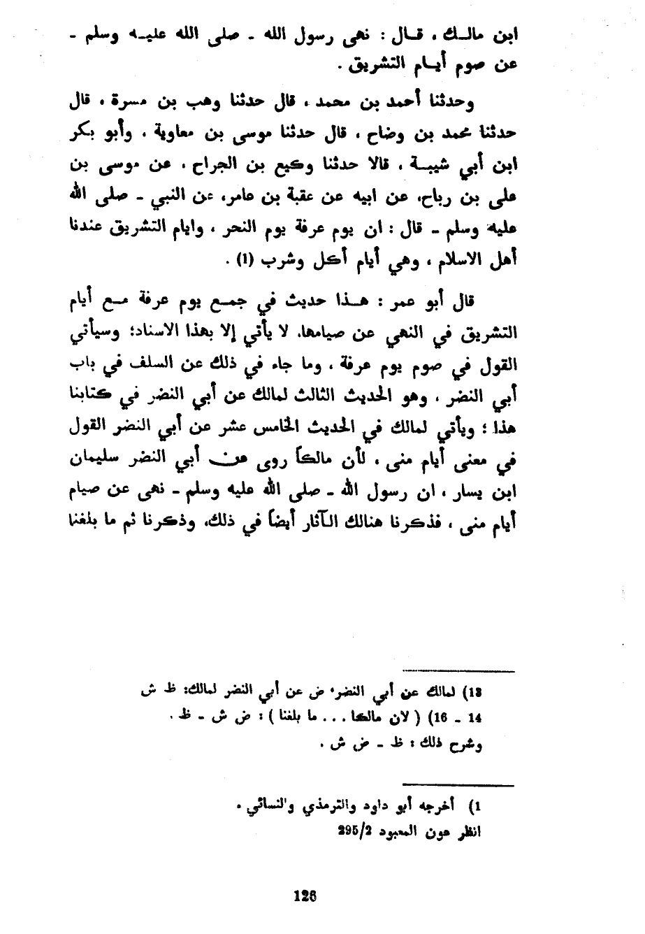 ابن مَالِكٍ قَالَ نَهَى رَسُولُ اللَّهِ صَلَّى اللَّهُ عَلَيْهِ وَسَلَّمَ عَنْ صَوْمِ أَيَّامِ التَّشْرِيقِ وَحَدَّثَنَا أَحْمَدُ بْنُ مُحَمَّدٍ قَالَ حَدَّثَنَا وَهْبُ بْنُ مَسَرَّةَ قَالَ حَدَّثَنَا مُحَمَّدُ بْنُ وَضَّاحٍ قَالَ حَدَّثَنَا مُوسَى بْنُ مُعَاوِيَةَ وَأَبُو بَكْرِ بْنُ أَبِي شَيْبَةَ قَالَا حَدَّثَنَا وَكِيعُ بْنُ الْجَرَّاحِ عَنْ مُوسَى بْنِ عَلِيِّ بْنِ رَبَاحٍ عَنْ أَبِيهِ عَنْ عُقْبَةَ بْنِ عَامِرٍ عَنِ النَّبِيِّ صَلَّى اللَّهُ عَلَيْهِ وَسَلَّمَ قَالَ إِنَّ يَوْمَ عَرَفَةَ يوم النَّحْرِ وَأَيَّامَ التَّشْرِيقِ عِنْدَنَا أَهْلَ الْإِسْلَامِ وَهِيَ أَيَّامُ أَكْلٍ وَشُرْبٍ قَالَ أَبُو عُمَرَ هَذَا حَدِيثٌ فِي جَمْعِ يَوْمِ عَرَفَةَ مَعَ أَيَّامِ التَّشْرِيقِ فِي النَّهْيِ عَنْ صِيَامِهَا لَا يَأْتِي إِلَّا بِهَذَا الْإِسْنَادِ وَسَيَأْتِي الْقَوْلُ فِي صَوْمِ يَوْمِ عَرَفَةَ وَمَا جَاءَ فِي ذَلِكَ عَنِ السَّلَفِ فِي بَابِ أَبِي النَّضْرِ وَهُوَ الْحَدِيثُ الثَّالِثُ لِمَالِكٍ عَنْ أَبِي النَّضْرِ فِي كِتَابِنَا هذا ويأتي لمالك فِي الْحَدِيثِ الْخَامِسِ عَشَرَ عَنْ أَبِي النَّضْرِ الْقَوْلُ فِي مَعْنَى أَيَّامِ مِنًى لِأَنَّ مَالِكًا رَوَى عَنْ أَبِي النَّضْرِ سُلَيْمَانَ بْنِ يَسَارٍ أَنَّ رَسُولَ اللَّهِ صَلَّى اللَّهُ عَلَيْهِ وَسَلَّمَ نَهَى عَنْ صِيَامِ أَيَّامِ مِنًى فَذَكَرْنَا هُنَالِكَ الْآثَارَ أَيْضًا فِي ذَلِكَ وَذَكَرْنَا ثَمَّ مَا بلغنا