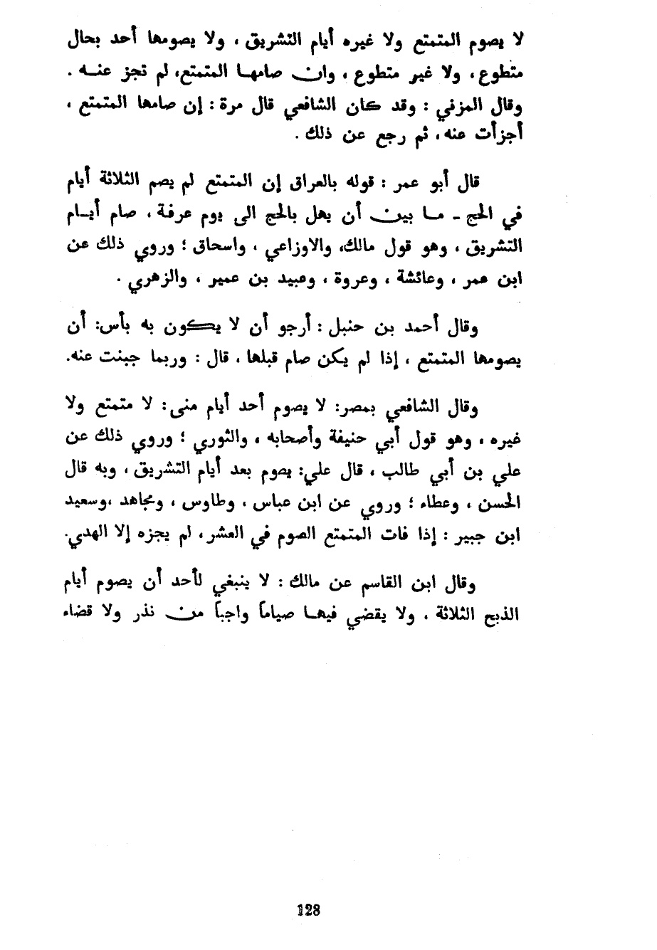 لَا يَصُومُ الْمُتَمَتِّعُ وَلَا غَيْرُهُ أَيَّامَ التَّشْرِيقِ وَلَا يَصُومُهَا أَحَدٌ بِحَالٍ مُتَطَوِّعٌ وَلَا غَيْرَ مُتَطَوِّعٍ وَإِنْ صَامَهَا الْمُتَمَتِّعُ لَمْ تُجْزِ عَنْهُ وَقَالَ الْمُزَنِيُّ وَقَدْ كَانَ الشَّافِعِيُّ قَالَ مَرَّةً إِنْ صَامَهَا الْمُتَمَتِّعُ أَجْزَأَتْ عَنْهُ ثُمَّ رَجَعَ عَنْ ذَلِكَ قَالَ أَبُو عُمَرَ قَوْلُهُ بِالْعِرَاقِ إِنَّ الْمُتَمَتِّعَ لَمْ يَصُمِ الثَّلَاثَةَ أَيَّامٍ فِي الْحَجِّ مَا بَيْنَ أَنْ يُهِلَّ بِالْحَجِّ إِلَى يَوْمِ عَرَفَةَ صَامَ أَيَّامَ التَّشْرِيقِ وَهُوَ قَوْلُ مَالِكٍ وَالْأَوْزَاعِيِّ وَإِسْحَاقَ وَرُوِيَ ذَلِكَ عَنِ ابْنِ عُمَرَ وَعَائِشَةَ وَعُرْوَةَ وَعُبَيْدِ بْنِ عُمَيْرٍ وَالزُّهْرِيِّ وَقَالَ أَحْمَدُ بْنُ حَنْبَلٍ أَرْجُو أَنْ لَا يَكُونَ بِهِ بَأْسٌ أَنْ يَصُومَهَا الْمُتَمَتِّعُ إِذَا لَمْ يَكُنْ صَامَ قَبْلَهَا قَالَ وَرُبَّمَا جَبُنَتْ عَنْهُ وَقَالَ الشَّافِعِيُّ بِمِصْرَ لَا يَصُومُ أَحَدٌ أَيَّامَ مِنًى لَا مُتَمَتِّعٌ وَلَا غَيْرُهُ وَهُوَ قَوْلُ أَبِي حَنِيفَةَ وَأَصْحَابُهُ وَالثَّوْرِيُّ وَرُوِيَ ذَلِكَ عَنْ عَلِيِّ بْنِ أَبِي طَالِبٍ قَالَ عَلِيٌّ يَصُومُ بَعْدَ أَيَّامِ التَّشْرِيقِ وَبِهِ قَالَ الْحَسَنُ وَعَطَاءٌ وَرُوِيَ عَنِ ابْنِ عَبَّاسٍ وَطَاوُسٍ وَمُجَاهِدٍ وَسَعِيدِ بْنِ جُبَيْرٍ إِذَا فَاتَ الْمُتَمَتِّعَ الصَّوْمُ فِي الْعَشْرِ لَمْ يُجْزِهِ إِلَّا الْهَدْيُ وَقَالَ ابْنُ الْقَاسِمِ عَنْ مَالِكٍ لَا يَنْبَغِي لِأَحَدٍ أَنْ يَصُومَ أَيَّامَ الذَّبْحِ الثَّلَاثَةَ وَلَا يَقْضِيَ فِيهَا صِيَامًا وَاجِبًا مِنْ نَذْرٍ وَلَا قَضَاءِ