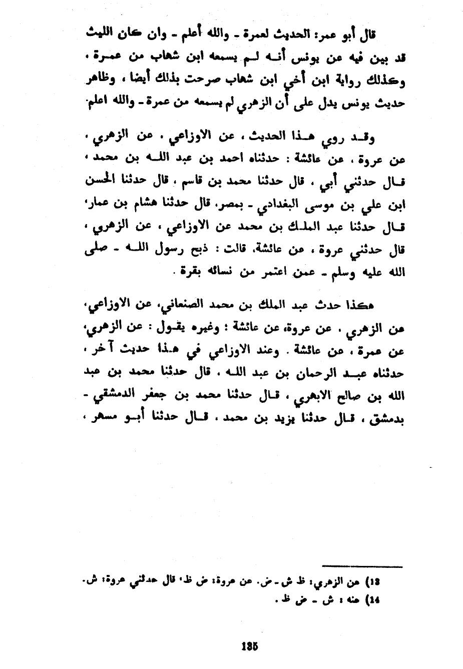 قَالَ أَبُو عُمَرَ الْحَدِيثُ لِعَمْرَةَ وَاللَّهُ أَعْلَمُ وَإِنْ كَانَ اللَّيْثُ قَدْ بَيَّنَ فِيهِ عَنْ يُونُسَ أَنَّهُ لَمْ يَسْمَعْهُ ابْنُ شِهَابٍ مِنْ عَمْرَةَ وَكَذَلِكَ رِوَايَةُ ابْنِ أَخِي ابْنِ شِهَابٍ صَرَّحَتْ بِذَلِكَ أَيْضًا وَظَاهِرُ حَدِيثِ يُونُسَ يَدُلُّ عَلَى أَنَّ الزُّهْرِيَّ لَمْ يَسْمَعْهُ مِنْ عَمْرَةَ وَاللَّهُ أَعْلَمُ وَقَدْ رَوَى هَذَا الْحَدِيثَ عَنْ الْأَوْزَاعِيِّ عَنِ الزُّهْرِيِّ عَنْ عُرْوَةَ عَنْ عَائِشَةَ حَدَّثَنَاهُ أَحْمَدُ بْنُ عَبْدِ اللَّهِ بْنِ مُحَمَّدٍ قَالَ حَدَّثَنِي أَبِي قَالَ حَدَّثَنَا مُحَمَّدُ بْنُ قَاسِمٍ قَالَ حَدَّثَنَا الْحَسَنُ بْنُ عَلِيِّ بْنِ موسى البغدادي بمصر قَالَ حَدَّثَنَا هِشَامُ بْنُ عَمَّارٍ قَالَ حَدَّثَنَا عَبْدُ الْمَلِكِ بْنُ مُحَمَّدٍ عَنِ الْأَوْزَاعِيِّ عَنِ الزُّهْرِيِّ قَالَ حَدَّثَنِي عُرْوَةُ عَنْ عَائِشَةَ قَالَتْ ذَبَحَ رَسُولُ اللَّهِ صَلَّى اللَّهُ عَلَيْهِ وَسَلَّمَ عَمَّنِ اعْتَمَرَ مِنْ نِسَائِهِ بَقَرَةً هَكَذَا حَدَّثَ عَبْدُ الْمَلِكِ بْنُ مُحَمَّدٍ الصَّنْعَانِيُّ عَنِ الْأَوْزَاعِيِّ عَنِ الزُّهْرِيِّ عَنْ عُرْوَةَ عَنْ عَائِشَةَ وَغَيْرُهُ يَقُولُ عَنِ الزُّهْرِيِّ عَنْ عَمْرَةَ عَنْ عَائِشَةَ وَعِنْدَ الْأَوْزَاعِيِّ فِي هَذَا حَدِيثٌ آخَرُ حَدَّثَنَاهُ عبد الرحمان بْنُ عَبْدِ اللَّهِ قَالَ حَدَّثَنَا مُحَمَّدُ بْنُ عَبْدِ اللَّهِ بْنِ صَالِحٍ الْأَبْهَرَيُّ قَالَ حَدَّثَنَا مُحَمَّدُ بْنُ جَعْفَرٍ الدِّمَشْقِيُّ بِدِمَشْقَ قَالَ حَدَّثَنَا يَزِيدُ بْنُ مُحَمَّدٍ قَالَ حَدَّثَنَا أَبُو مُسْهِرٍ