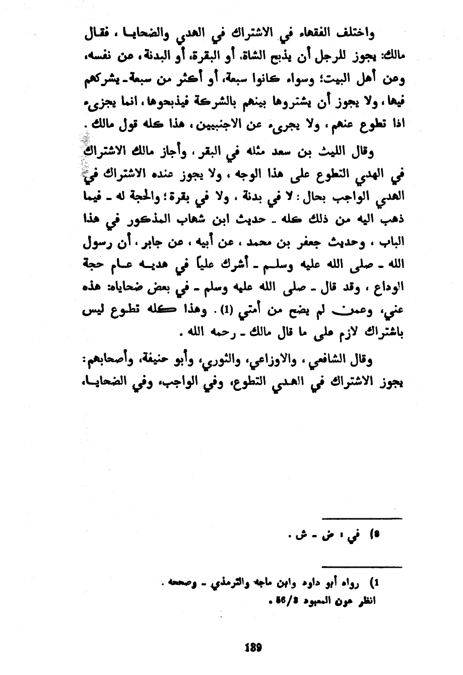 وَاخْتَلَفَ الْفُقَهَاءُ فِي الِاشْتِرَاكِ فِي الْهَدْيِ وَالضَّحَايَا فَقَالَ مَالِكٌ يَجُوزُ لِلرَّجُلِ أَنْ يَذْبَحَ الشَّاةَ أَوِ الْبَقَرَةَ أَوِ الْبَدَنَةَ عَنْ نَفْسِهِ وَعَنْ أَهْلِ الْبَيْتِ وَسَوَاءٌ كَانُوا سَبْعَةً أَوْ أَكْثَرَ مِنْ سَبْعَةٍ يُشْرِكُهُمْ فِيهَا وَلَا يَجُوزُ أَنْ يَشْتَرُوهَا بَيْنَهُمْ بِالشَّرِكَةِ فَيَذْبَحُوهَا إِنَّمَا يُجْزِئُ إِذَا تَطَوَّعَ عَنْهُمْ وَلَا يُجْزِئُ عَنِ الْأَجْنَبِيِّينَ هَذَا كُلُّهُ قَوْلُ مَالِكٍ وَقَالَ اللَّيْثُ بْنُ سَعْدٍ مِثْلَهُ فِي الْبَقَرِ وَأَجَازَ مَالِكٌ الِاشْتِرَاكَ فِي الْهَدْيِ التَّطَوُّعِ عَلَى هَذَا الْوَجْهِ وَلَا يَجُوزُ عِنْدَهُ الِاشْتِرَاكُ فِي الْهَدْيِ الْوَاجِبِ بِحَالٍ لَا فِي بَدَنَةٍ وَلَا فِي بَقَرَةٍ وَالْحُجَّةُ لَهُ فِيمَا ذَهَبَ إِلَيْهِ مِنْ ذَلِكَ كُلِّهِ حَدِيثُ ابْنِ شِهَابٍ الْمَذْكُورُ فِي هَذَا الْبَابِ وَحَدِيثُ جَعْفَرِ بْنِ مُحَمَّدٍ عَنْ أَبِيهِ عَنْ جَابِرٍ أَنَّ رَسُولَ اللَّهِ صَلَّى اللَّهُ عليه وسلم أَشْرَكَ عَلِيًّا فِي هَدْيِهِ عَامَ حَجَّةِ الْوَدَاعِ وَقَدْ قَالَ صَلَّى اللَّهُ عَلَيْهِ وَسَلَّمَ فِي بَعْضِ ضَحَايَاهُ هَذِهِ عَنِّي وَعَمَّنْ لَمْ يُضَحِّ مِنْ أُمَّتِي وَهَذَا كُلُّهُ تَطَوُّعٌ لَيْسَ بِاشْتِرَاكٍ لَازِمٍ عَلَى مَا قَالَ مَالِكٌ رَحِمَهُ اللَّهُ وَقَالَ الشَّافِعِيُّ وَالْأَوْزَاعِيُّ وَالثَّوْرِيُّ وَأَبُو حَنِيفَةَ وَأَصْحَابُهُمْ يَجُوزُ الِاشْتِرَاكُ فِي الْهَدْيِ التَّطَوُّعِ وَفِي الْوَاجِبِ وفي الضحايا
