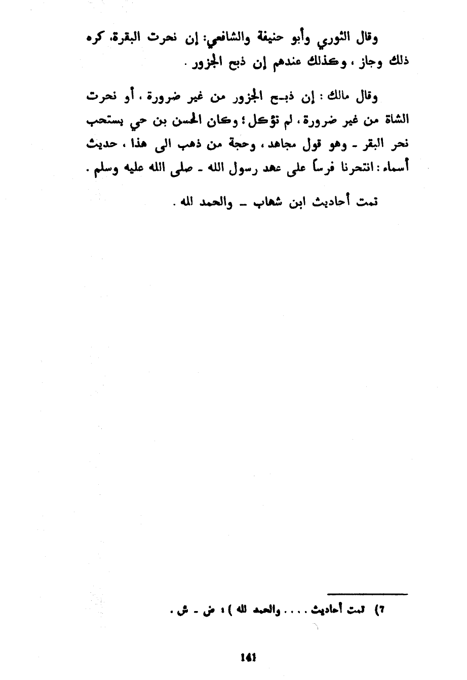 وَقَالَ الثَّوْرِيُّ وَأَبُو حَنِيفَةَ وَالشَّافِعِيُّ إِنْ نُحِرَتِ الْبَقَرَةُ كُرِهَ ذَلِكَ وَجَازَ وَكَذَلِكَ عِنْدَهُمْ إِنْ ذُبِحَ الْجَزُورُ وَقَالَ مَالِكٌ إِنْ ذُبِحَ الْجَزُورُ مِنْ غَيْرِ ضَرُورَةٍ أَوْ نُحِرَتِ الشَّاةُ مِنْ غَيْرِ ضَرُورَةٍ لَمْ تُؤْكَلْ وَكَانَ الْحَسَنُ بْنُ حَيٍّ يَسْتَحِبُّ نَحْرَ الْبَقَرِ وَهُوَ قَوْلُ مُجَاهِدٍ وَحُجَّةُ مَنْ ذَهَبَ إِلَى هَذَا حَدِيثُ أَسْمَاءَ انْتَحَرْنَا فَرَسًا عَلَى عَهْدِ رَسُولِ اللَّهِ صَلَّى اللَّهُ عَلَيْهِ وَسَلَّمَ تَمَّتْ أَحَادِيثُ ابْنِ شِهَابٍ والحمد لله