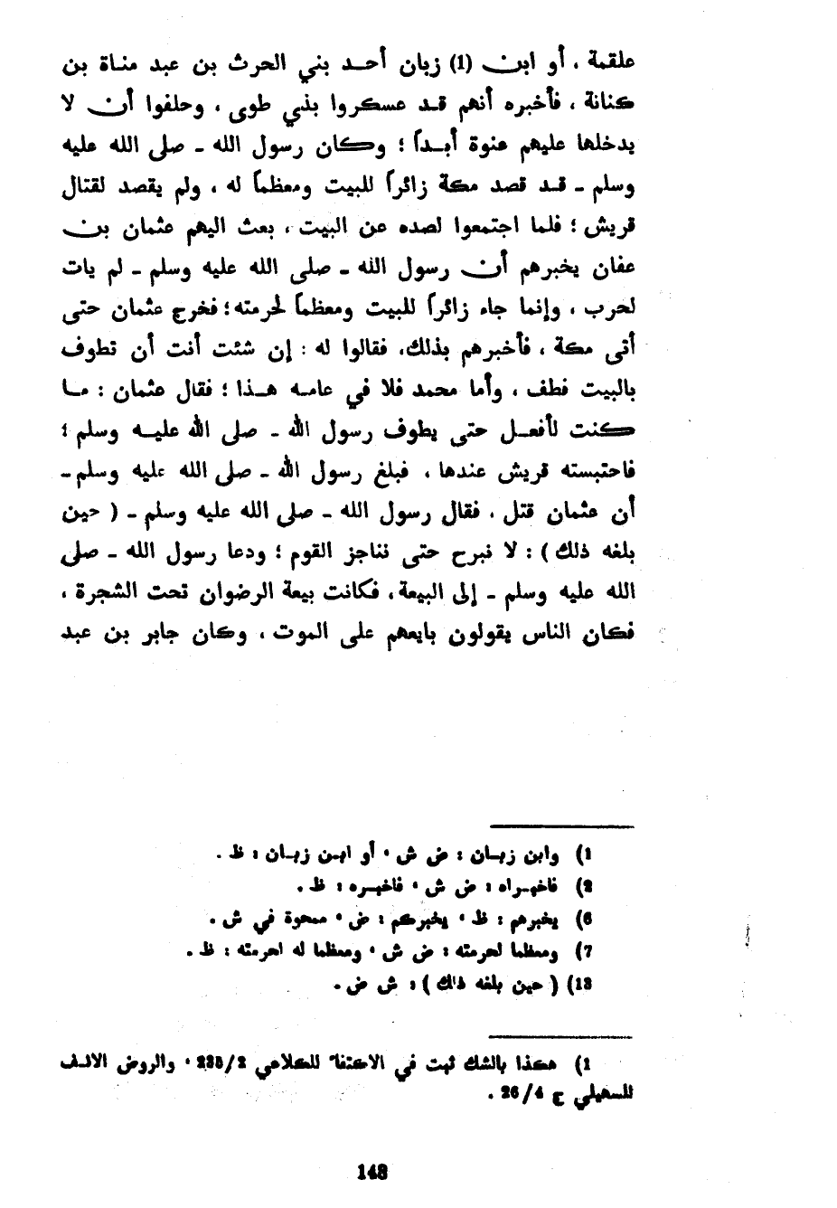 عَلْقَمَةَ أَوِ ابْنُ زَبَّانَ أَحَدُ بَنِي الْحَرْثِ بْنِ عَبْدِ مَنَاةِ بْنِ كِنَانَةَ فَأَخْبَرَهُ أَنَّهُمْ قَدْ عَسْكَرُوا بِذِي طُوًى وَحَلَفُوا أَنْ لَا يَدْخُلَهَا عَلَيْهِمْ عَنْوَةً أَبَدًا وَكَانَ رَسُولُ اللَّهِ صَلَّى اللَّهُ عَلَيْهِ وَسَلَّمَ قَدْ قَصَدَ مَكَّةَ زَائِرًا لِلْبَيْتِ وَمُعَظِّمًا لَهُ وَلَمْ يَقْصِدْ لِقِتَالِ قُرَيْشٍ فَلَمَّا اجْتَمَعُوا لِصَدِّهِ عَنِ الْبَيْتِ بَعَثَ إِلَيْهِمْ عُثْمَانَ بْنَ عَفَّانَ يُخْبِرُهُمْ أَنَّ رَسُولَ اللَّهِ صَلَّى اللَّهُ عَلَيْهِ وَسَلَّمَ لَمْ يَأْتِ لِحَرْبٍ وَإِنَّمَا جَاءَ زَائِرًا لِلْبَيْتِ وَمُعَظِّمًا لِحُرْمَتِهِ فَخَرَجَ عُثْمَانُ حَتَّى أَتَى مَكَّةَ فَأَخْبَرَهُمْ بِذَلِكَ فَقَالُوا لَهُ إِنْ شِئْتَ أَنْتَ أَنْ تَطُوفَ بِالْبَيْتِ فَطُفْ وَأَمَّا مُحَمَّدٌ فَلَا فِي عَامِهِ هَذَا فَقَالَ عُثْمَانُ مَا كُنْتُ لِأَفْعَلَ حَتَّى يَطُوفَ رَسُولُ اللَّهِ صَلَّى اللَّهُ عَلَيْهِ وَسَلَّمَ فَاحْتَبَسَتْهُ قُرَيْشٌ عِنْدَهَا فَبَلَغَ رَسُولَ اللَّهِ صَلَّى اللَّهُ عَلَيْهِ وَسَلَّمَ أَنَّ عُثْمَانَ قُتِلَ فَقَالَ رَسُولُ اللَّهِ صَلَّى اللَّهُ عَلَيْهِ وَسَلَّمَ (حين بَلَغَهُ ذَلِكَ) لَا نَبْرَحُ حَتَّى نُنَاجِزَ الْقَوْمَ وَدَعَا رَسُولُ اللَّهِ صَلَّى اللَّهُ عَلَيْهِ وَسَلَّمَ إِلَى الْبَيْعَةِ فَكَانَتْ بَيْعَةُ الرِّضْوَانِ تَحْتَ الشَّجَرَةِ فَكَانَ النَّاسُ يَقُولُونَ بَايَعَهُمْ عَلَى الْمَوْتِ وَكَانَ جَابِرُ بْنُ عَبْدِ