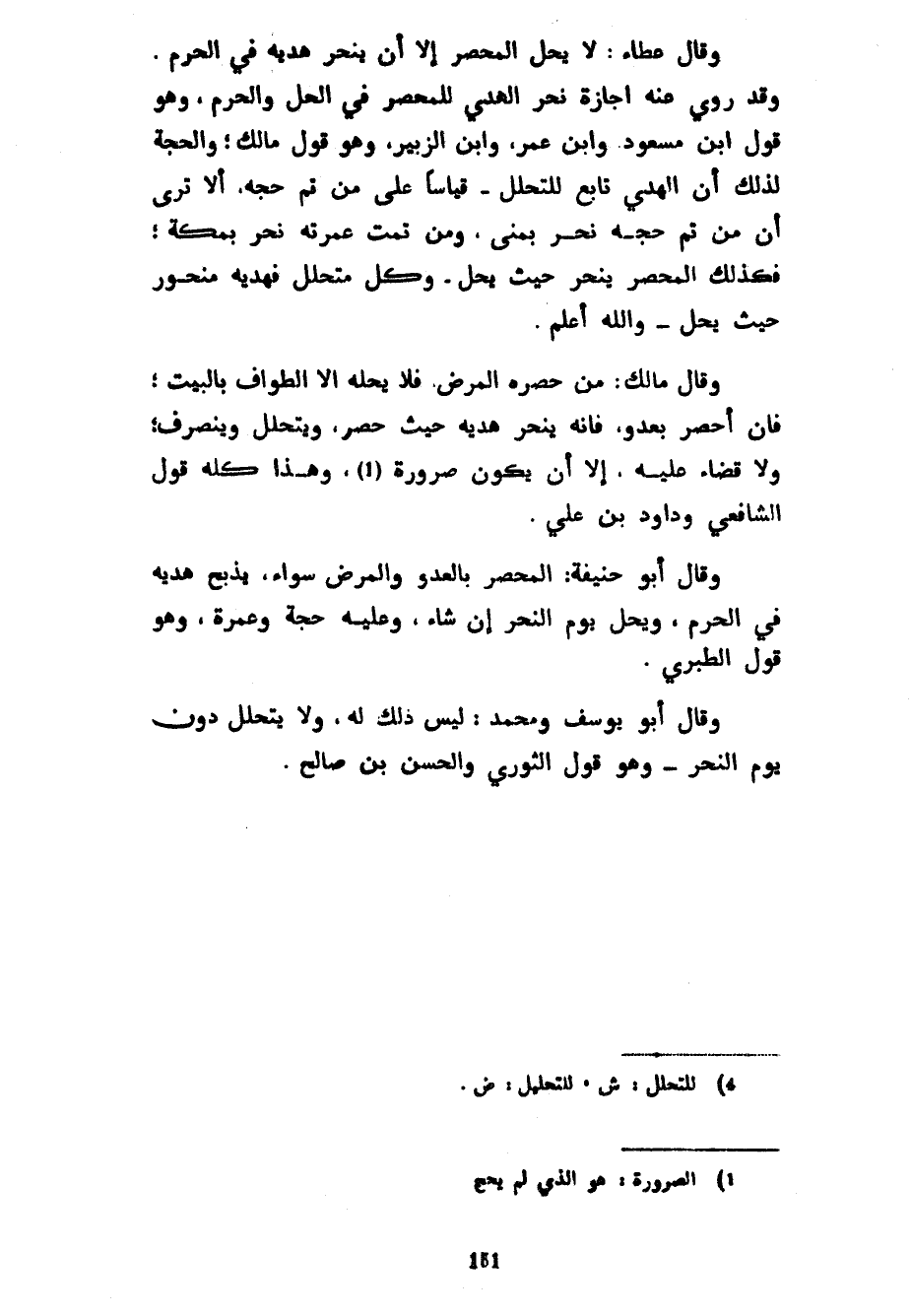 وَقَالَ عَطَاءٌ لَا يَحِلُّ الْمُحْصَرُ إِلَّا أَنْ يَنْحَرَ هَدْيَهُ فِي الْحَرَمِ وَقَدْ رُوِيَ عَنْهُ إِجَازَةُ نَحْرِ الْهَدْيِ لِلْمُحْصَرِ فِي الْحِلِّ وَالْحَرَمِ وَهُوَ قَوْلُ ابْنِ مَسْعُودٍ وَابْنِ عُمَرَ وَابْنِ الزُّبَيْرِ وَهُوَ قَوْلُ مَالِكٍ وَالْحُجَّةُ لِذَلِكَ أَنَّ الْهَدْيَ تَابِعٌ لِلتَّحَلُّلِ قِيَاسًا عَلَى مَنْ تَمَّ حَجُّهُ أَلَا تَرَى أَنَّ مَنْ تَمَّ حَجُّهُ نَحَرَ بِمِنًى وَمَنْ تَمَّتْ عُمْرَتُهُ نَحَرَ بِمَكَّةَ فَكَذَلِكَ الْمُحْصَرُ يَنْحَرُ حَيْثُ يَحِلُّ وَكُلُّ مُتَحَلِّلٍ فَهَدْيُهُ مَنْحُورٌ حَيْثُ يَحِلُّ وَاللَّهُ أَعْلَمُ وَقَالَ مَالِكٌ مَنْ حَصَرَهُ الْمَرَضُ فَلَا يُحِلُّهُ إِلَّا الطَّوَافُ بِالْبَيْتِ فَإِنْ أُحْصِرَ بِعَدُوٍّ فَإِنَّهُ يَنْحَرُ هَدْيَهُ حَيْثُ حُصِرَ وَيَتَحَلَّلُ وَيَنْصَرِفُ وَلَا قَضَاءَ عليه إلا أن يكون صرورة وَهَذَا كُلُّهُ قَوْلُ الشَّافِعِيِّ وَدَاوُدَ بْنِ عَلِيٍّ وَقَالَ أَبُو حَنِيفَةَ الْمُحْصَرُ بِالْعَدُوِّ وَالْمَرَضِ سَوَاءٌ يَذْبَحُ هَدْيَهُ فِي الْحَرَمِ وَيَحِلُّ يَوْمَ النَّحْرِ إِنْ شَاءَ وَعَلَيْهِ حُجَّةٌ وَعُمْرَةٌ وَهُوَ قَوْلُ الطبري وقال أبو يوسف ومحمد ليس ذلك لَهُ وَلَا يَتَحَلَّلُ دُونَ يَوْمِ النَّحْرِ وَهُوَ قَوْلُ الثَّوْرِيِّ وَالْحَسَنِ بْنِ صَالِحٍ
