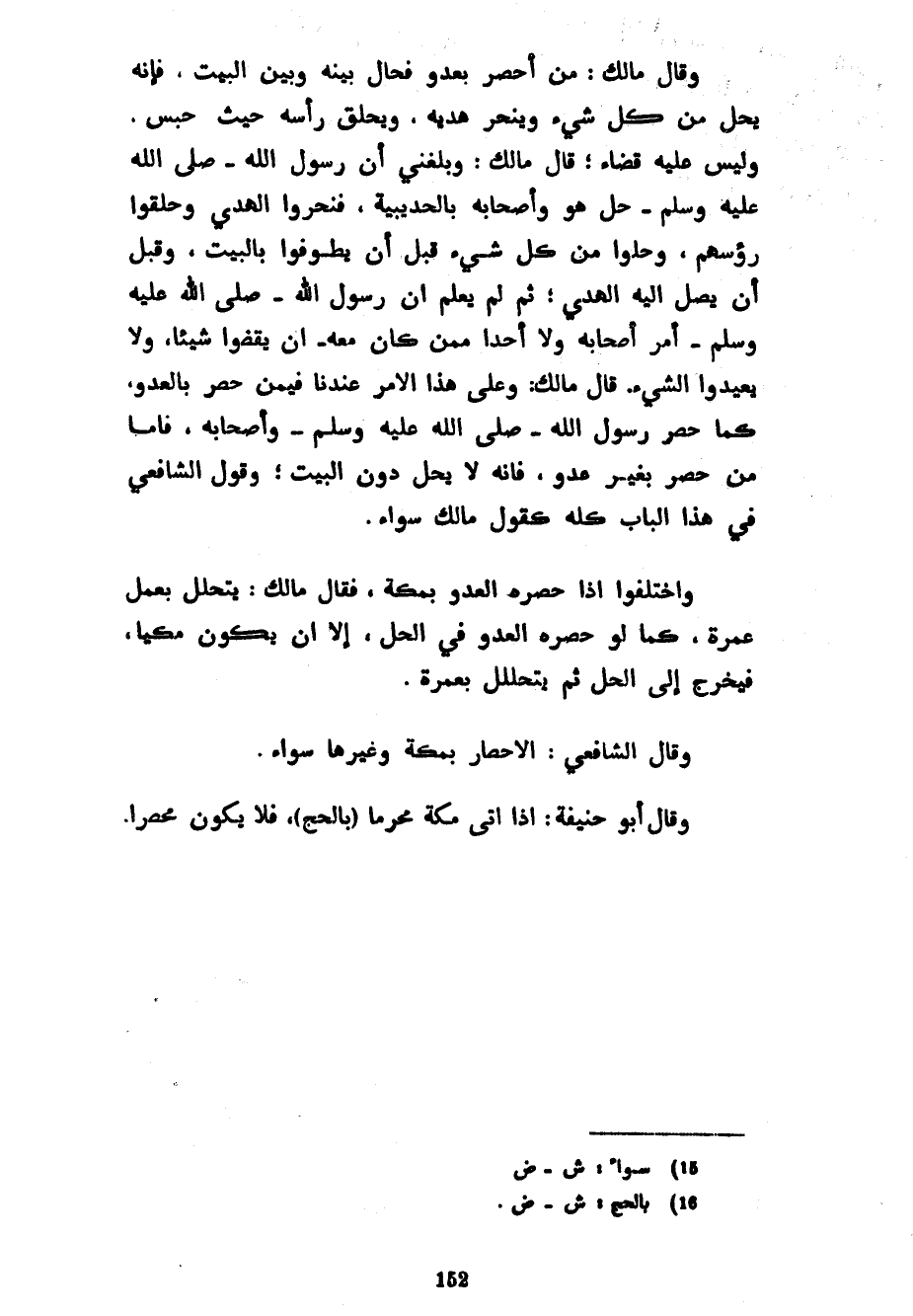 وَقَالَ مَالِكٌ مَنْ أُحْصِرَ بِعَدُوٍّ فَحَالَ بَيْنَهُ وَبَيْنَ الْبَيْتِ فَإِنَّهُ يَحِلُّ مِنْ كُلِّ شَيْءٍ وَيَنْحَرُ هَدْيَهُ وَيَحْلِقُ رَأْسَهُ حَيْثُ حُبِسَ وَلَيْسَ عَلَيْهِ قَضَاءٌ قَالَ مَالِكٌ وَبَلَغَنِي أَنَّ رَسُولَ اللَّهِ صَلَّى اللَّهُ عَلَيْهِ وَسَلَّمَ حَلَّ هُوَ وأصحابه بالحديبية فنحروا الهدي وحلقوا رؤوسهم وَحَلُّوا مِنْ كُلِّ شَيْءٍ قَبْلَ أَنْ يَطُوفُوا بِالْبَيْتِ وَقَبْلَ أَنْ يَصِلَ إِلَيْهِ الْهَدْيُ ثُمَّ لَمْ يُعْلَمْ أَنَّ رَسُولَ اللَّهِ صَلَّى اللَّهُ عَلَيْهِ وَسَلَّمَ أَمَرَ أَصْحَابَهُ وَلَا أَحَدًا مِمَّنْ كَانَ مَعَهُ أَنْ يَقْضُوا شَيْئًا وَلَا يُعِيدُوا الشَّيْءَ قَالَ مَالِكٌ وَعَلَى هَذَا الْأَمْرُ عِنْدَنَا فِيمَنْ حُصِرَ بِالْعَدُوِّ كَمَا حُصِرَ رَسُولُ اللَّهِ صَلَّى اللَّهُ عَلَيْهِ وَسَلَّمَ وَأَصْحَابُهُ فَأَمَّا مَنْ حُصِرَ بِغَيْرِ عَدُوٍّ فَإِنَّهُ لَا يَحِلُّ دُونَ الْبَيْتِ وَقَوْلُ الشَّافِعِيِّ فِي هَذَا الْبَابِ كُلِّهِ كَقَوْلِ مَالِكٍ سَوَاءٌ وَاخْتَلَفُوا إِذَا حَصَرَهُ الْعَدُوُّ بِمَكَّةَ فَقَالَ مَالِكٌ يَتَحَلَّلُ بِعَمَلِ عُمْرَةٍ كَمَا لَوْ حَصَرَهُ الْعَدُوُّ فِي الْحِلِّ إِلَّا أَنْ يكون مكيا فيخرج إلى الحل ثم يتحلل بِعُمْرَةٍ وَقَالَ الشَّافِعِيُّ الْإِحْصَارُ بِمَكَّةَ وَغَيْرِهَا سَوَاءٌ وَقَالَ أَبُو حَنِيفَةَ إِذَا أَتَى مَكَّةَ مُحْرِمًا (بِالْحَجِّ) فَلَا يَكُونُ مُحْصَرًا