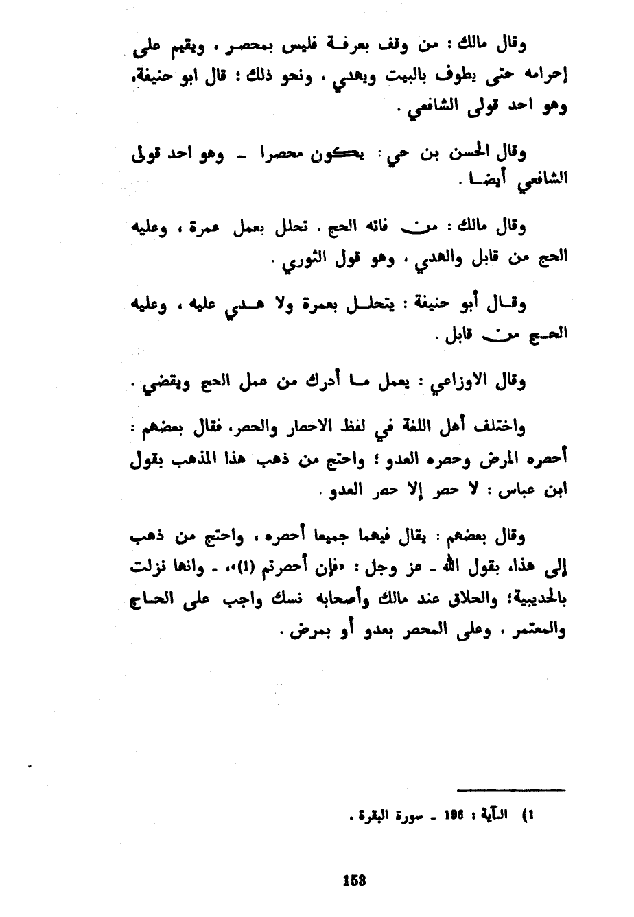 وَقَالَ مَالِكٌ مَنْ وَقَفَ بِعَرَفَةَ فَلَيْسَ بِمُحْصَرٍ وَيُقِيمُ عَلَى إِحْرَامِهِ حَتَّى يَطُوفَ بِالْبَيْتِ وَيَهْدِيَ وَنَحْوَ ذَلِكَ قَالَ أَبُو حَنِيفَةَ وَهُوَ أَحَدُ قَوْلَيِ الشَّافِعِيِّ وَقَالَ الْحَسَنُ بْنُ حَيٍّ يَكُونُ مُحْصَرًا وَهُوَ أَحَدُ قَوْلَيِ الشَّافِعِيِّ أَيْضًا وَقَالَ مَالِكٌ مَنْ فَاتَهُ الْحَجُّ تَحَلَّلَ بِعَمَلِ عُمْرَةٍ وَعَلَيْهِ الْحَجُّ مِنْ قَابَلٍ وَالْهَدْيُ وَهُوَ قَوْلُ الثَّوْرِيِّ وَقَالَ أَبُو حَنِيفَةَ يَتَحَلَّلُ بِعُمْرَةٍ وَلَا هَدْيَ عَلَيْهِ وَعَلَيْهِ الْحَجُّ مِنْ قَابَلٍ وَقَالَ الْأَوْزَاعِيُّ يَعْمَلُ مَا أَدْرَكَ مِنْ عَمَلِ الْحَجِّ وَيَقْضِي وَاخْتَلَفَ أَهْلُ اللُّغَةِ فِي لَفْظِ الْإِحْصَارِ وَالْحَصْرِ فَقَالَ بَعْضُهُمْ أَحْصَرَهُ الْمَرَضُ وَحَصَرَهُ الْعَدُوُّ وَاحْتَجَّ مَنْ ذَهَبَ هَذَا الْمَذْهَبَ بِقَوْلِ ابْنِ عَبَّاسٍ لَا حَصْرَ إِلَّا حَصْرُ الْعَدُوِّ وَقَالَ بَعْضُهُمْ يُقَالُ فِيهِمَا جَمِيعًا أَحْصَرَهُ وَاحْتَجَّ مَنْ ذَهَبَ إِلَى هَذَا بِقَوْلِ اللَّهِ عَزَّ وَجَلَّ فَإِنْ أُحْصِرْتُمْ وَأَنَّهَا نَزَلَتْ بِالْحُدَيْبِيَةِ وَالْحِلَاقُ عِنْدَ مَالِكٍ وَأَصْحَابِهِ نُسُكٌ وَاجِبٌ عَلَى الْحَاجِّ وَالْمُعْتَمِرِ وَعَلَى الْمُحْصَرِ بِعَدُوٍّ أَوْ بِمَرَضٍ