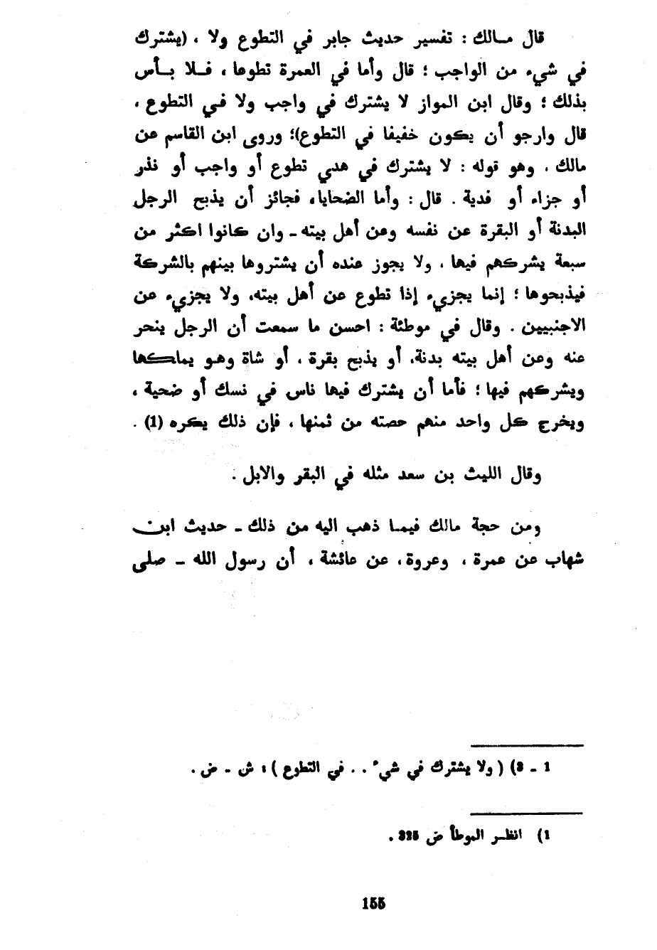 قَالَ مَالِكٌ تَفْسِيرُ حَدِيثِ جَابِرٍ فِي التَّطَوُّعِ وَلَا (يُشْتَرَكُ فِي شَيْءٍ مِنَ الْوَاجِبِ قَالَ وَأَمَّا فِي الْعُمْرَةِ تَطَوُّعًا فَلَا بَأْسَ بِذَلِكَ وَقَالَ ابْنُ الْمَوَّازِ لَا يُشْتَرَكُ فِي وَاجِبٍ وَلَا فِي التَّطَوُّعِ قَالَ وَأَرْجُو أَنْ يَكُونَ خَفِيفًا فِي التَّطَوُّعِ) وَرَوَى ابْنُ الْقَاسِمِ عَنْ مَالِكٍ وَهُوَ قَوْلُهُ لَا يُشْتَرَكُ فِي هَدْيٍ تَطَوُّعٍ أَوْ وَاجِبٍ أَوْ نَذْرٍ أَوْ جَزَاءٍ أَوْ فِدْيَةٍ قَالَ وَأَمَّا الضَّحَايَا فَجَائِزٌ أَنْ يَذْبَحَ الرَّجُلُ الْبَدَنَةَ أَوِ الْبَقَرَةَ عَنْ نَفْسِهِ وَعَنْ أَهْلِ بَيْتِهِ وَإِنْ كَانُوا أَكْثَرَ مِنْ سَبْعَةٍ يُشْرِكُهُمْ فِيهَا وَلَا يَجُوزُ عِنْدَهُ أَنْ يَشْتَرُوهَا بَيْنَهُمْ بِالشَّرِكَةِ فَيَذْبَحُوهَا إِنَّمَا يُجْزِئُ إِذَا تَطَوَّعَ عَنْ أَهْلِ بَيْتِهِ وَلَا يُجْزِئُ عَنِ الْأَجْنَبِيَّيْنِ وَقَالَ فِي مُوَطَّئِهِ أَحْسَنُ مَا سَمِعْتُ أَنَّ الرَّجُلَ يَنْحَرُ عَنْهُ وَعَنْ أَهْلِ بَيْتِهِ بدنة أَوْ يَذْبَحُ بَقَرَةً أَوْ شَاةً وَهُوَ يَمْلِكُهَا وَيُشْرِكُهُمْ فِيهَا فَأَمَّا أَنْ يَشْتَرِكَ فِيهَا نَاسٌ فِي نُسُكٍ أَوْ ضَحِيَّةٍ وَيُخْرِجُ كُلُّ وَاحِدٍ مِنْهُمْ حِصَّتَهُ مِنْ ثَمَنِهَا فَإِنَّ ذَلِكَ يُكْرَهُ وَقَالَ اللَّيْثُ بْنُ سَعْدٍ مِثْلَهُ فِي الْبَقَرِ وَالْإِبِلِ وَمِنْ حُجَّةِ مَالِكٍ فِيمَا ذَهَبَ إِلَيْهِ مِنْ ذَلِكَ حَدِيثُ ابْنِ شِهَابٍ عَنْ عَمْرَةَ وَعُرْوَةَ عَنْ عَائِشَةَ أَنَّ رَسُولَ اللَّهِ