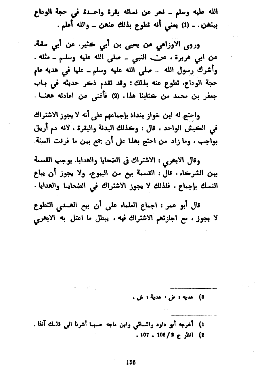 صَلَّى اللَّهُ عَلَيْهِ وَسَلَّمَ نَحَرَ عَنْ نِسَائِهِ بَقَرَةً وَاحِدَةً فِي حَجَّةِ الْوَدَاعِ بَيْنَهُنَّ يَعْنِي أَنَّهُ تَطَوَّعَ بِذَلِكَ عَنْهُنَّ وَاللَّهُ أَعْلَمُ وَرَوَى الْأَوْزَاعِيِّ عَنْ يَحْيَى بْنِ أَبِي كَثِيرٍ عَنْ أَبِي سَلَمَةَ عَنْ أَبِي هُرَيْرَةَ عَنِ النَّبِيِّ صَلَّى اللَّهُ عَلَيْهِ وَسَلَّمَ مِثْلَهُ وَأَشْرَكَ رَسُولُ اللَّهِ صَلَّى اللَّهُ عَلَيْهِ وَسَلَّمَ عَلِيًّا فِي هديه عام حجة الوداع تطوع عَنْهُ بِذَلِكَ وَقَدْ تَقَدَّمَ ذِكْرُ حَدِيثِهِ فِي بَابِ جَعْفَرِ بْنِ مُحَمَّدٍ مِنْ كِتَابِنَا هَذَا فَأَغْنَى عَنْ إِعَادَتِهِ هَهُنَا واحتج له ابن خواز بنداد بِإِجْمَاعِهِمْ عَلَى أَنَّهُ لَا يَجُوزُ الِاشْتِرَاكُ فِي الْكَبْشِ الْوَاحِدِ قَالَ وَكَذَلِكَ الْبَدَنَةُ وَالْبَقَرَةُ لِأَنَّهُ دَمٌ أُرِيقَ بِوَاجِبٍ وَمَا زَادَ مَنِ احْتَجَّ بِهَذَا عَلَى أَنْ جَمَعَ بَيْنَ مَا فَرَّقَتِ السُّنَّةُ وَقَالَ الْأَبْهَرِيُّ الِاشْتِرَاكُ فِي الضَّحَايَا وَالْهَدَايَا يُوجِبُ الْقِسْمَةَ بَيْنَ الشُّرَكَاءِ قَالَ الْقِسْمَةُ بَيْعٌ مِنَ الْبُيُوعِ وَلَا يَجُوزُ أَنْ يُبَاعَ النُّسُكُ بِإِجْمَاعٍ فَلِذَلِكَ لَا يَجُوزُ الِاشْتِرَاكُ فِي الضَّحَايَا وَالْهَدَايَا قَالَ أَبُو عُمَرَ إِجْمَاعُ الْعُلَمَاءِ عَلَى أَنَّ بَيْعَ الْهَدْيِ التَّطَوُّعِ لَا يَجُوزُ مَعَ إِجَازَتِهِمُ الِاشْتِرَاكَ فِيهِ يُبْطِلُ مَا اعْتَلَّ بِهِ الأبهري