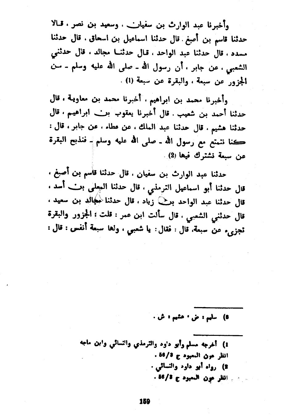 وَأَخْبَرَنَا عَبْدُ الْوَارِثِ بْنُ سُفْيَانَ وَسَعِيدُ بْنُ نَصْرٍ قَالَا حَدَّثَنَا قَاسِمُ بْنُ أَصْبَغَ قَالَ حَدَّثَنَا إِسْمَاعِيلُ بْنُ إِسْحَاقَ قَالَ حَدَّثَنَا مُسَدَّدٌ قَالَ حَدَّثَنَا عَبْدُ الْوَاحِدِ قَالَ حَدَّثَنَا مُجَالِدٌ قَالَ حَدَّثَنِي الشَّعْبِيُّ عَنْ جَابِرٍ أَنَّ رَسُولَ اللَّهِ صَلَّى اللَّهُ عَلَيْهِ وَسَلَّمَ سَنَّ الْجَزُورَ عَنْ سَبْعَةٍ وَالْبَقَرَةَ عَنْ سَبْعَةٍ وَأَخْبَرَنَا مُحَمَّدُ بْنُ إِبْرَاهِيمَ أَخْبَرَنَا مُحَمَّدُ بْنُ مُعَاوِيَةَ قَالَ حَدَّثَنَا أَحْمَدُ بْنُ شُعَيْبٍ قَالَ أَخْبَرَنَا يَعْقُوبُ بْنُ إِبْرَاهِيمَ قَالَ حَدَّثَنَا هُشَيْمٌ قَالَ حَدَّثَنَا عَبْدِ الْمَلِكِ عَنْ عَطَاءٍ عَنْ جَابِرٍ قَالَ كُنَّا نَتَمَتَّعُ مَعَ رَسُولِ اللَّهِ صَلَّى اللَّهُ عَلَيْهِ وَسَلَّمَ فَنَذْبَحُ الْبَقَرَةَ عَنْ سَبْعَةٍ نَشْتَرِكُ فِيهَا حَدَّثَنَا عَبْدُ الْوَارِثِ بْنُ سُفْيَانَ قَالَ حَدَّثَنَا قَاسِمُ بْنُ أَصْبَغَ قَالَ حَدَّثَنَا أَبُو إِسْمَاعِيلَ التِّرْمِذِيُّ قَالَ حَدَّثَنَا الْمُعَلَّى بْنُ أَسَدٍ قَالَ حَدَّثَنَا عَبْدُ الْوَاحِدِ بْنُ زِيَادٍ قَالَ حَدَّثَنَا مُجَالِدُ بْنُ سَعِيدٍ قَالَ حَدَّثَنِي الشَّعْبِيُّ قَالَ سَأَلْتُ ابْنَ عُمَرَ قُلْتُ الْجَزُورُ وَالْبَقَرَةُ تُجْزِئُ عَنْ سَبْعَةٍ قَالَ فَقَالَ يَا شَعْبِيُّ وَلَهَا سَبْعَةُ أَنْفُسٍ قَالَ