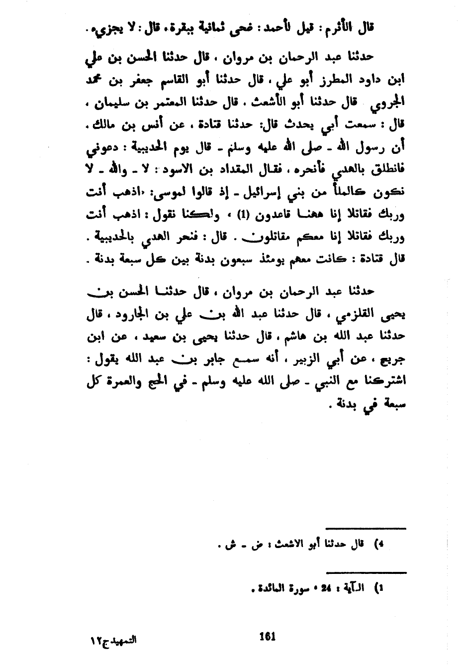 قَالَ الْأَثْرَمُ قِيلَ لِأَحْمَدَ ضَحَّى ثَمَانِيَةٌ بِبَقَرَةٍ قال لا يجزئ حدثنا عبد الرحمان بْنُ مَرْوَانَ قَالَ حَدَّثَنَا الْحَسَنُ بْنُ عَلِيِّ بْنِ دَاوُدَ الْمُطَرِّزُ أَبُو عَلِيٍّ قَالَ حَدَّثَنَا أَبُو الْقَاسِمِ جَعْفَرُ بْنُ مُحَمَّدٍ الْجَرَوِيُّ قَالَ حَدَّثَنَا أَبُو الْأَشْعَثِ قَالَ حَدَّثَنَا الْمُعْتَمِرُ بْنُ سُلَيْمَانَ قَالَ سَمِعْتُ أَبِي يُحَدِّثُ قَالَ حَدَّثَنَا قَتَادَةُ عَنْ أَنَسِ بْنِ مَالِكٍ قَالَ سَمِعْتُ أَبِي يُحَدِّثُ قَالَ حَدَّثَنَا قَتَادَةُ عَنْ أَنَسِ بْنِ مَالِكٍ أَنَّ رَسُولَ اللَّهِ صَلَّى اللَّهُ عَلَيْهِ وَسَلَّمَ قَالَ يَوْمَ الْحُدَيْبِيَةِ دَعُونِي فَأَنْطَلِقَ بِالْهَدْيِ فَأَنْحَرَهُ فَقَالَ الْمِقْدَادُ بْنُ الْأَسْوَدِ لَا وَاللَّهِ لَا نَكُونُ كَالْمَلَأِ مِنْ بَنِي إِسْرَائِيلَ إِذْ قَالُوا لِمُوسَى اذْهَبْ أَنْتَ وربك فقاتلا إنا ههنا قَاعِدُونَ وَلَكِنَّا نَقُولُ اذْهَبْ أَنْتَ وَرَبُّكَ فَقَاتِلَا إِنَّا مَعَكُمْ مُقَاتِلُونَ قَالَ فَنَحَرَ الْهَدْيَ بِالْحُدَيْبِيَةِ قَالَ قَتَادَةُ كَانَتْ مَعَهُمْ يَوْمَئِذٍ سَبْعُونَ بَدَنَةً بين كل سبعة بدنة حدثنا عبد الرحمان بْنُ مَرْوَانَ قَالَ حَدَّثَنَا الْحَسَنُ بْنُ يَحْيَى الْقَلْزُمِيُّ قَالَ حَدَّثَنَا عَبْدُ اللَّهِ بْنُ عَلِيِّ بْنِ الْجَارُودِ قَالَ حَدَّثَنَا عَبْدُ اللَّهِ بْنُ هَاشِمٍ قَالَ حَدَّثَنَا يَحْيَى بْنُ سَعِيدٍ عَنْ ابْنِ جُرَيْجٍ عَنْ أَبِي الزُّبَيْرِ أَنَّهُ سَمِعَ جَابِرَ بْنَ عَبْدِ اللَّهِ يَقُولُ اشْتَرَكْنَا مَعَ النَّبِيِّ صَلَّى اللَّهُ عَلَيْهِ وَسَلَّمَ فِي الْحَجِّ والعمرة كل سبعة في بدنة
