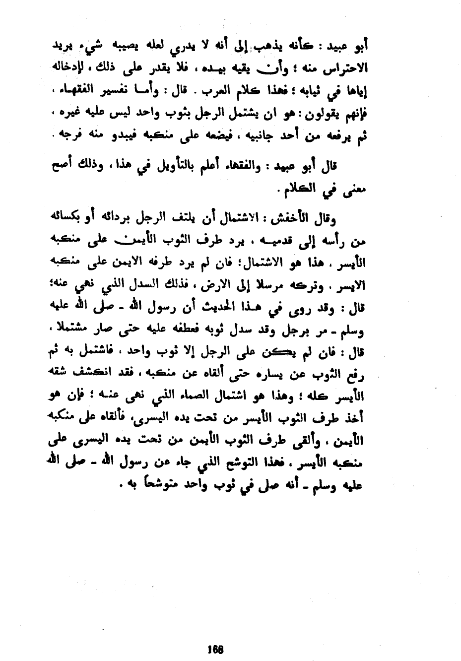 أَبُو عُبَيْدٍ كَأَنَّهُ يَذْهَبُ إِلَى أَنَّهُ لَا يَدْرِي لَعَلَّهُ يُصِيبُهُ شَيْءٌ يُرِيدُ الِاحْتِرَاسَ مِنْهُ وَأَنْ يَقِيَهُ بِيَدِهِ فَلَا يَقْدِرَ عَلَى ذَلِكَ لِإِدْخَالِهِ إِيَّاهَا فِي ثِيَابِهِ فَهَذَا كَلَامُ الْعَرَبِ قَالَ وَأَمَّا تَفْسِيرُ الْفُقَهَاءِ فَإِنَّهُمْ يَقُولُونَ هُوَ أَنْ يَشْتَمِلَ الرَّجُلُ بِثَوْبٍ وَاحِدٍ لَيْسَ عَلَيْهِ غَيْرُهُ ثُمَّ يَرْفَعَهُ مِنْ أَحَدِ جَانِبَيْهِ فَيَضَعَهُ عَلَى مَنْكِبِهِ فَيَبْدُوَ مِنْهُ فَرْجُهُ قَالَ أَبُو عَبِيدٍ وَالْفُقَهَاءُ أَعْلَمُ بِالتَّأْوِيلِ فِي هَذَا وَذَلِكَ أَصَحُّ مَعْنًى فِي الْكَلَامِ وَقَالَ الْأَخْفَشُ الِاشْتِمَالُ أَنْ يَلْتَفَّ الرَّجُلُ بِرِدَائِهِ أَوْ بِكِسَائِهِ مِنْ رَأْسِهِ إِلَى قَدَمَيْهِ يَرُدُّ طَرَفَ الثَّوْبِ الْأَيْمَنِ عَلَى مَنْكِبِهِ الْأَيْسَرِ هَذَا هُوَ الِاشْتِمَالُ فَإِنْ لَمْ يَرُدَّ طَرَفَهُ الْأَيْمَنَ عَلَى مَنْكِبِهِ الْأَيْسَرِ وَتَرَكَهُ مُرْسَلًا إِلَى الْأَرْضِ فَذَلِكَ السَّدْلُ الَّذِي نُهِيَ عَنْهُ قَالَ وَقَدْ رُوِيَ فِي هَذَا الْحَدِيثِ أَنَّ رَسُولَ اللَّهِ صَلَّى اللَّهُ عَلَيْهِ وَسَلَّمَ مَرَّ بِرَجُلٍ وَقَدْ سَدَلَ ثَوْبَهُ فَعَطَفَهُ عَلَيْهِ حَتَّى صَارَ مُشْتَمِلًا قَالَ فَإِنْ لَمْ يَكُنْ عَلَى الرَّجُلِ إِلَّا ثَوْبٌ وَاحِدٌ فَاشْتَمَلَ بِهِ ثُمَّ رَفَعَ الثَّوْبَ عَنْ يَسَارِهِ حَتَّى أَلْقَاهُ عَنْ مَنْكِبِهِ فَقَدِ انْكَشَفَ شِقُّهُ الْأَيْسَرُ كُلُّهُ وَهَذَا هُوَ اشْتِمَالُ الصَّمَّاءِ الَّذِي نُهِيَ عَنْهُ فَإِنْ هُوَ أَخَذَ طَرَفَ الثَّوْبِ الْأَيْسَرِ مِنْ تَحْتِ يَدِهِ الْيُسْرَى فَأَلْقَاهُ عَلَى مَنْكِبِهِ الْأَيْمَنِ وَأَلْقَى طَرَفَ الثَّوْبِ الْأَيْمَنِ مِنْ تَحْتِ يَدِهِ الْيُسْرَى عَلَى مَنْكِبِهِ الْأَيْسَرِ فَهَذَا التَّوَشُّحُ الَّذِي جَاءَ عَنْ رَسُولِ اللَّهِ صَلَّى اللَّهُ عَلَيْهِ وَسَلَّمَ أَنَّهُ صَلَّى فِي ثَوْبٍ وَاحِدٍ متوشحا به