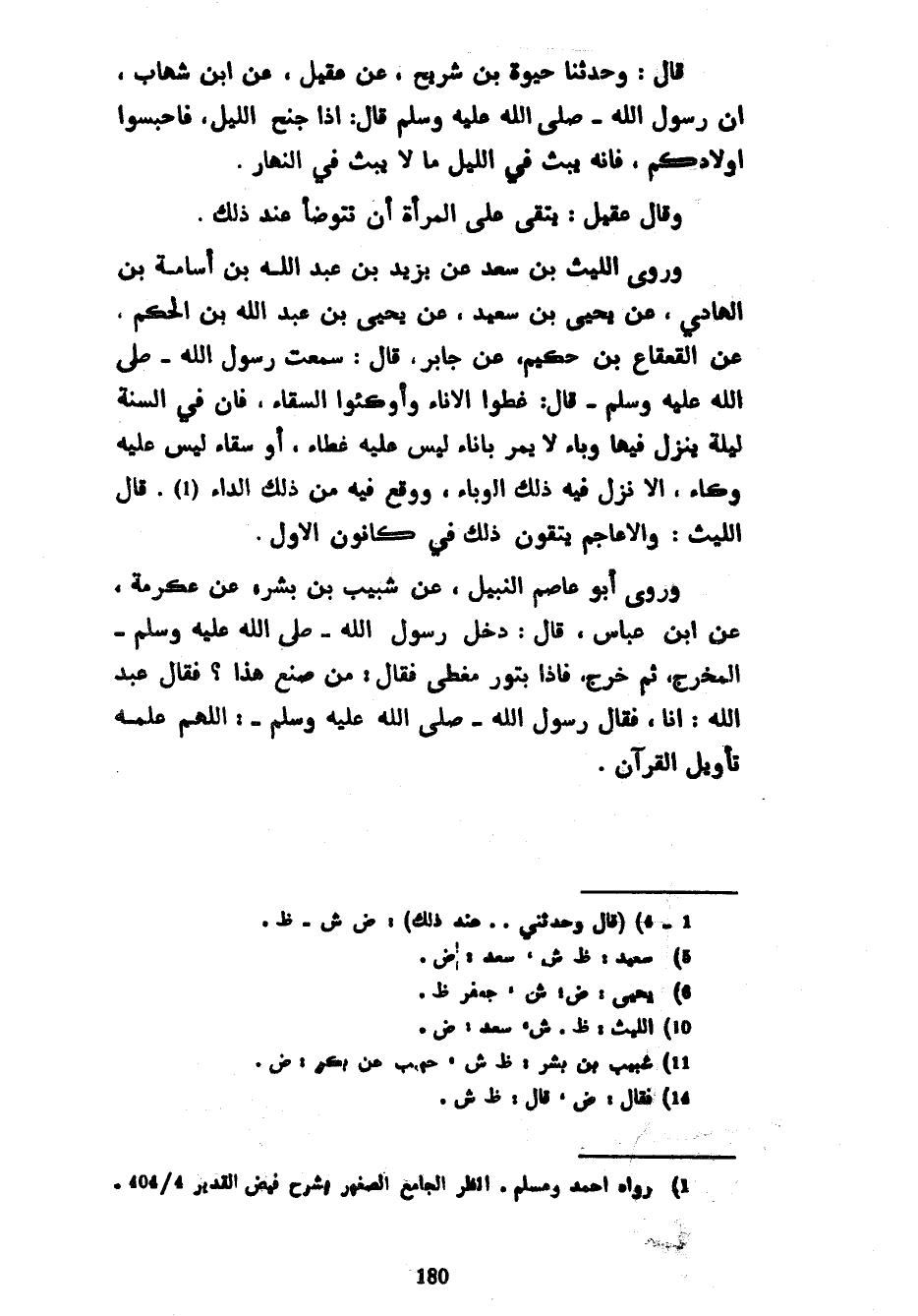 قَالَ وَحَدَّثَنَا حَيْوَةُ بْنُ شُرَيْحٍ عَنْ عُقَيْلٍ عَنِ ابْنِ شِهَابٍ أَنَّ رَسُولَ اللَّهِ صَلَّى اللَّهُ عَلَيْهِ وَسَلَّمَ قَالَ إِذَا جَنَحَ اللَّيْلُ فَاحْبِسُوا أَوْلَادَكُمْ فَإِنَّهُ يُبَثُّ فِي اللَّيْلِ مَا لَا يُبَثُّ فِي النَّهَارِ وَقَالَ عُقَيْلٌ يُتَّقَى عَلَى الْمَرْأَةِ أَنْ تَتَوَضَّأَ عِنْدَ ذَلِكَ وَرَوَى اللَّيْثُ بْنُ سَعْدٍ عَنْ يَزِيدَ بْنِ عَبْدِ اللَّهِ بْنِ أُسَامَةَ بْنِ الْهَادِي عَنْ يَحْيَى بْنِ سَعِيدٍ عَنْ يَحْيَى بْنِ عَبْدِ اللَّهِ بْنِ الْحَكَمِ عَنِ الْقَعْقَاعِ بْنِ حَكِيمٍ عَنْ جَابِرٍ قَالَ سَمِعْتُ رَسُولَ اللَّهِ صَلَّى اللَّهُ عَلَيْهِ وَسَلَّمَ قَالَ غَطُّوُا الْإِنَاءَ وَأَوْكِئُوا السِّقَاءَ فَإِنَّ فِي السَّنَةِ لَيْلَةً يَنْزِلُ فِيهَا وَبَاءٌ لَا يَمُرُّ بِإِنَاءٍ لَيْسَ عَلَيْهِ غِطَاءٌ أَوْ سِقَاءٍ لَيْسَ عَلَيْهِ وِكَاءٌ إِلَّا نَزَلَ فِيهِ ذَلِكَ الْوَبَاءُ وَوَقَعَ فِيهِ مِنْ ذَلِكَ الدَّاءِ قَالَ اللَّيْثُ وَالْأَعَاجِمُ يَتَّقُونَ ذَلِكَ فِي كَانُونَ الْأَوَّلِ وَرَوَى أَبُو عَاصِمٍ النَّبِيلُ عَنْ شَبِيبُ بْنُ بِشْرٍ عَنْ عِكْرِمَةَ عَنِ ابْنِ عَبَّاسٍ قَالَ دَخَلَ رَسُولُ اللَّهِ صَلَّى اللَّهُ عَلَيْهِ وَسَلَّمَ الْمَخْرَجَ ثُمَّ خَرَجَ فَإِذَا بِتَوْرٍ مُغَطًّى فَقَالَ مَنْ صَنَعَ هَذَا فَقَالَ عَبْدُ اللَّهِ أَنَا فَقَالَ رَسُولُ اللَّهِ صَلَّى اللَّهُ عَلَيْهِ وَسَلَّمَ اللَّهُمَّ عَلِّمْهُ تَأْوِيلَ الْقُرْآنِ