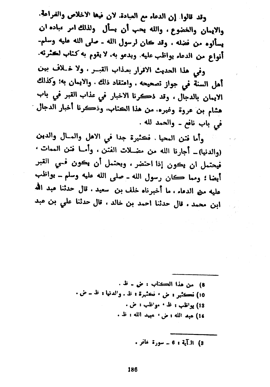 وَقَدْ قَالُوا إِنَّ الدُّعَاءَ مَعَ الْعِبَادَةِ لِأَنَّ فِيهَا الْإِخْلَاصَ وَالضَّرَاعَةَ وَالْإِيمَانَ وَالْخُضُوعَ وَاللَّهُ يُحِبُّ أَنْ يُسْأَلَ وَلِذَلِكَ أَمَرَ عِبَادَهُ أَنْ يَسْأَلُوهُ مِنْ فَضْلِهِ وَقَدْ كَانَ لِرَسُولِ اللَّهِ صَلَّى اللَّهُ عَلَيْهِ وَسَلَّمَ أَنْوَاعٌ مِنَ الدُّعَاءِ يُوَاظِبُ عَلَيْهِ وَيَدْعُو بِهِ لَا يَقُومُ بِهِ كِتَابٌ لِكَثْرَتِهِ وَفِي هَذَا الْحَدِيثِ الْإِقْرَارُ بِعَذَابِ الْقَبْرِ وَلَا خِلَافَ بَيْنَ أَهْلِ السُّنَّةِ فِي جَوَازِ تَصْحِيحِهِ وَاعْتِقَادِ ذَلِكَ وَالْإِيمَانِ بِهِ وَكَذَلِكَ الْإِيمَانُ بِالدَّجَّالِ وَقَدْ ذَكَرْنَا الْأَخْبَارَ فِي عَذَابِ الْقَبْرِ فِي بَابِ هِشَامِ بْنِ عُرْوَةَ وَغَيْرِهِ مِنْ هَذَا الْكِتَابِ وَذَكَرْنَا أَخْبَارَ الدَّجَّالِ فِي بَابِ نَافِعٍ وَالْحَمْدُ لِلَّهِ وَأَمَّا فِتَنُ الْمَحْيَا فَكَثِيرَةٌ جِدًّا فِي الْأَهْلِ وَالْمَالِ وَالدِّينِ (وَالدُّنْيَا) أَجَارَنَا اللَّهُ مِنْ مُضِلَّاتِ الْفِتَنِ وَأَمَّا فِتَنُ الْمَمَاتِ فَيُحْتَمَلُ أَنْ يَكُونَ إِذَا احْتُضِرَ وَيُحْتَمَلُ أَنْ يَكُونَ فِي الْقَبْرِ أَيْضًا وَمِمَّا كَانَ رَسُولُ اللَّهِ صَلَّى اللَّهُ عَلَيْهِ وَسَلَّمَ يُوَاظِبُ عَلَيْهِ مِنَ الدُّعَاءِ مَا أَخْبَرَنَاهُ خَلَفُ بْنُ سَعِيدٍ قَالَ حَدَّثَنَا عَبْدُ اللَّهِ بْنُ مُحَمَّدٍ قَالَ حَدَّثَنَا أَحْمَدُ بْنُ خَالِدٍ قَالَ حَدَّثَنَا عَلِيُّ بْنُ عَبْدِ