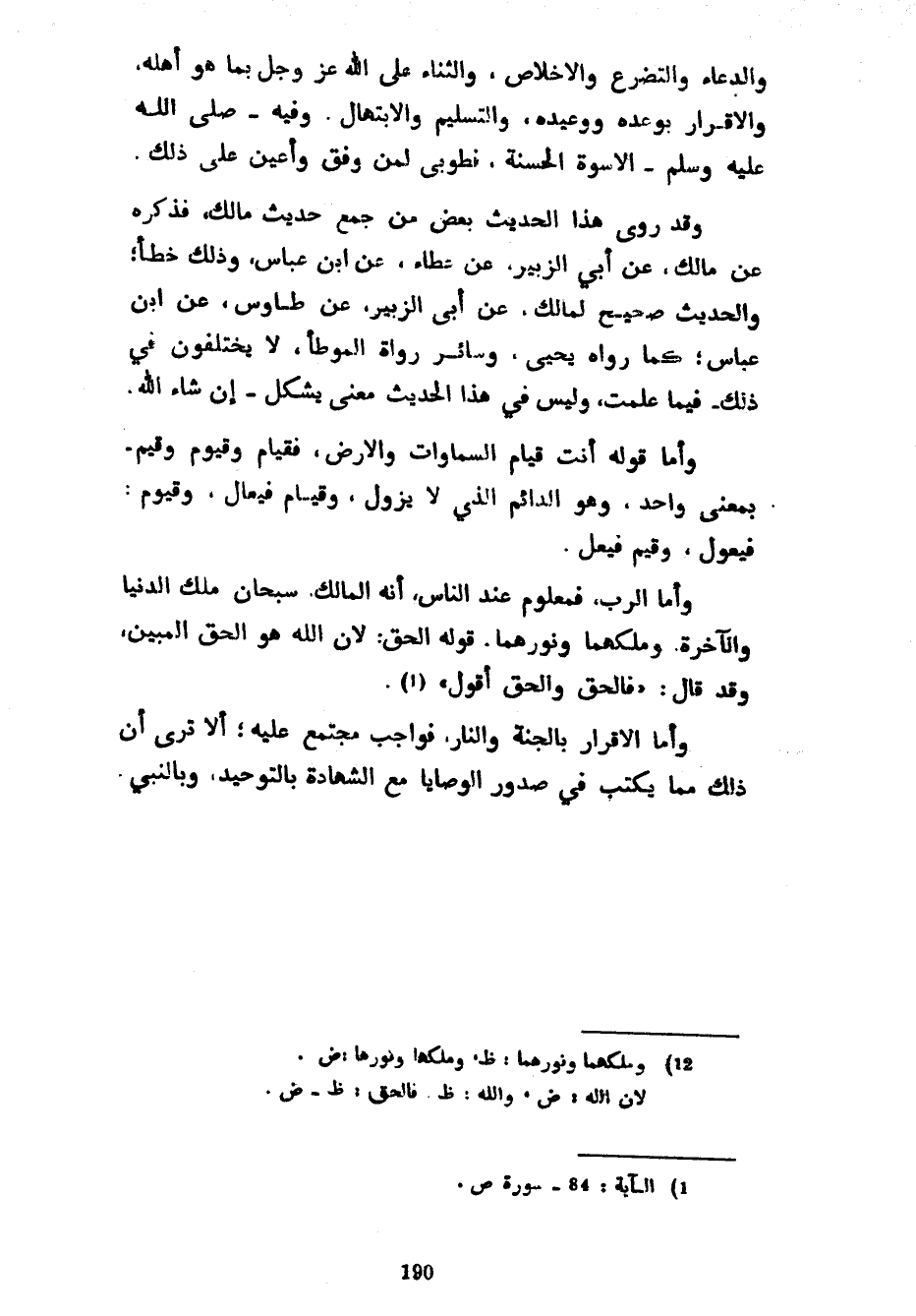 وَالدُّعَاءِ وَالتَّضَرُّعِ وَالْإِخْلَاصِ وَالثَّنَاءِ عَلَى اللَّهِ عَزَّ وَجَلَّ بِمَا هُوَ أَهْلُهُ وَالْإِقْرَارِ بِوَعْدِهِ وَوَعِيدِهِ وَالتَّسْلِيمِ وَالِابْتِهَالِ وَفِيهِ صَلَّى اللَّهُ عَلَيْهِ وَسَلَّمَ الْأُسْوَةُ الْحَسَنَةُ فَطُوبَى لِمَنْ وُفِّقَ وَأُعِينَ عَلَى ذَلِكَ وَقَدْ رَوَى هَذَا الْحَدِيثَ بَعْضُ مَنْ جَمَعَ حَدِيثَ مَالِكٍ فَذَكَرَهُ عَنْ مَالِكٌ عَنْ أَبِي الزُّبَيْرِ عَنْ عَطَاءٍ عَنِ ابْنِ عَبَّاسٍ وَذَلِكَ خَطَأٌ وَالْحَدِيثُ صَحِيحٌ لِمَالِكٍ عَنْ أَبِي الزُّبَيْرِ عَنْ طَاوُسٍ عَنِ ابْنِ عَبَّاسٍ كَمَا رَوَاهُ يَحْيَى وَسَائِرُ رُوَاةِ الْمُوَطَّأِ لَا يَخْتَلِفُونَ فِي ذَلِكَ فِيمَا عَلِمْتُ وَلَيْسَ فِي هَذَا الْحَدِيثِ مَعْنًى يُشْكَلُ إِنْ شَاءَ اللَّهُ وَأَمَّا قَوْلُهُ أَنْتَ قَيَّامُ السَّمَاوَاتِ وَالْأَرْضِ فَقَيَّامُ وَقَيُّومُ وَقَيِّمُ بِمَعْنًى وَاحِدٍ وَهُوَ الدَّائِمُ الَّذِي لَا يَزُولُ وَقَيَّامُ فَيْعَالُ وَقَيُّومُ فَيْعُولُ وَقَيِّمُ فَيْعِلُ وَأَمَّا الرَّبُّ فَمَعْلُومٌ عِنْدَ النَّاسِ أَنَّهُ الْمَالِكُ سُبْحَانَ مَلِكِ الدُّنْيَا وَالْآخِرَةِ وَمَلِكِهِمَا وَنُورِهِمَا قَوْلُهُ الْحَقُّ لِأَنَّ اللَّهَ هُوَ الْحَقُّ الْمُبِينُ وَقَدْ قَالَ فَالْحَقُّ وَالْحَقَّ أَقُولُ وَأَمَّا الْإِقْرَارُ بِالْجَنَّةِ وَالنَّارِ فَوَاجِبٌ مُجْتَمَعٌ عَلَيْهِ أَلَا تَرَى أَنَّ ذَلِكَ مِمَّا يُكْتَبُ فِي صُدُورِ الْوَصَايَا مَعَ الشَّهَادَةِ بِالتَّوْحِيدِ وَبِالنَّبِيِّ