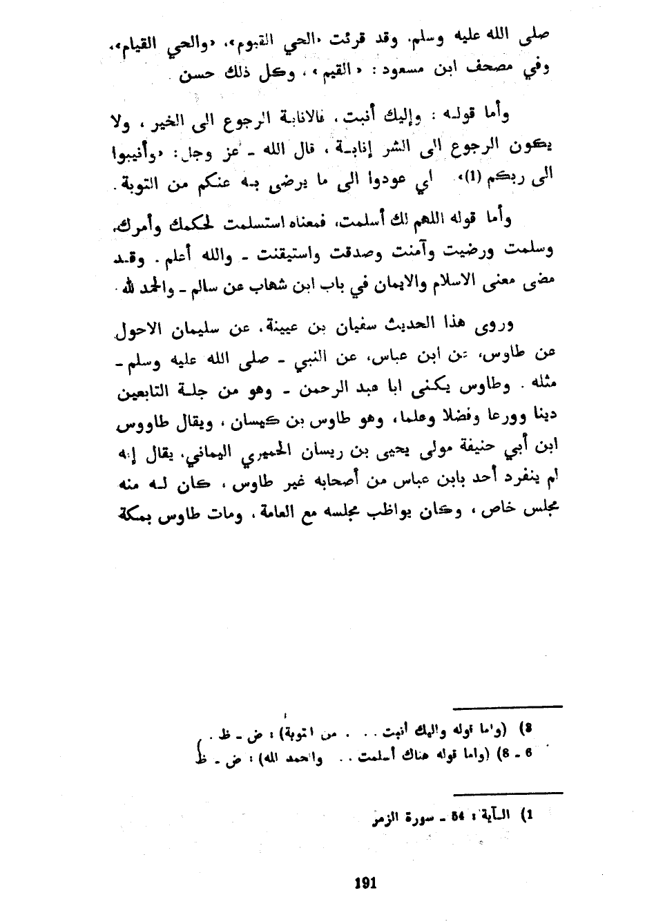 صَلَّى اللَّهُ عَلَيْهِ وَسَلَّمَ وَقَدْ قُرِئَتِ الْحَيُّ الْقَيُّومُ وَالْحَيُّ الْقَيَّامُ وَفِي مُصْحَفِ ابْنِ مَسْعُودٍ الْقَيِّمُ وَكُلُّ ذَلِكَ حَسَنٌ وَأَمَّا قَوْلُهُ وَإِلَيْكَ أَنَبْتُ فَالْإِنَابَةُ الرُّجُوعُ إِلَى الْخَيْرِ وَلَا يَكُونُ الرُّجُوعُ إِلَى الشَّرِّ إِنَابَةً قَالَ اللَّهُ عَزَّ وَجَلَّ وَأَنِيبُوا إِلَى رَبِّكُمْ أَيْ عُودُوا إِلَى مَا يَرْضَى بِهِ عَنْكُمْ مِنَ التَّوْبَةِ وَأَمَّا قَوْلُهُ اللَّهُمَّ لَكَ أَسْلَمْتُ فَمَعْنَاهُ اسْتَسْلَمْتُ لِحُكْمِكَ وَأَمْرِكَ وَسَلَّمْتُ وَرَضِيتُ وَآمَنْتُ وَصَدَّقْتُ وَاسْتَيْقَنْتُ وَاللَّهُ أَعْلَمُ وَقَدْ مَضَى مَعْنَى الْإِسْلَامِ وَالْإِيمَانِ فِي بَابِ ابْنِ شِهَابٍ عَنْ سَالِمٍ وَالْحَمْدُ لِلَّهِ وَرَوَى هَذَا الْحَدِيثَ سُفْيَانُ بْنُ عُيَيْنَةَ عَنْ سُلَيْمَانَ الْأَحْوَلِ عَنِ طَاوُسٍ عَنِ ابْنِ عَبَّاسٍ عَنِ النَّبِيِّ صَلَّى اللَّهُ عليه وسلم مثله وَطَاوُسُ يُكَنَّى أَبَا عَبْدِ الرَّحْمَنِ وَهُوَ مِنْ جُلَّةِ التَّابِعِينَ دِينًا وَوَرَعًا وَفَضْلًا وَعِلْمًا وَهُوَ طاوس بن كيسان ويقال طاووس بْنُ أَبِي حَنِيفَةَ مَوْلَى يَحْيَى بْنِ رِيسَانَ الحميري اليماني يقال إنه لم ينفرد أحاد بِابْنِ عَبَّاسٍ مِنْ أَصْحَابِهِ غَيْرُ طَاوُسَ كَانَ لَهُ مِنْهُ مَجْلِسٌ خَاصٌّ وَكَانَ يُوَاظِبُ مَجْلِسَهُ مَعَ الْعَامَّةِ وَمَاتَ طَاوُسُ بِمَكَّةَ