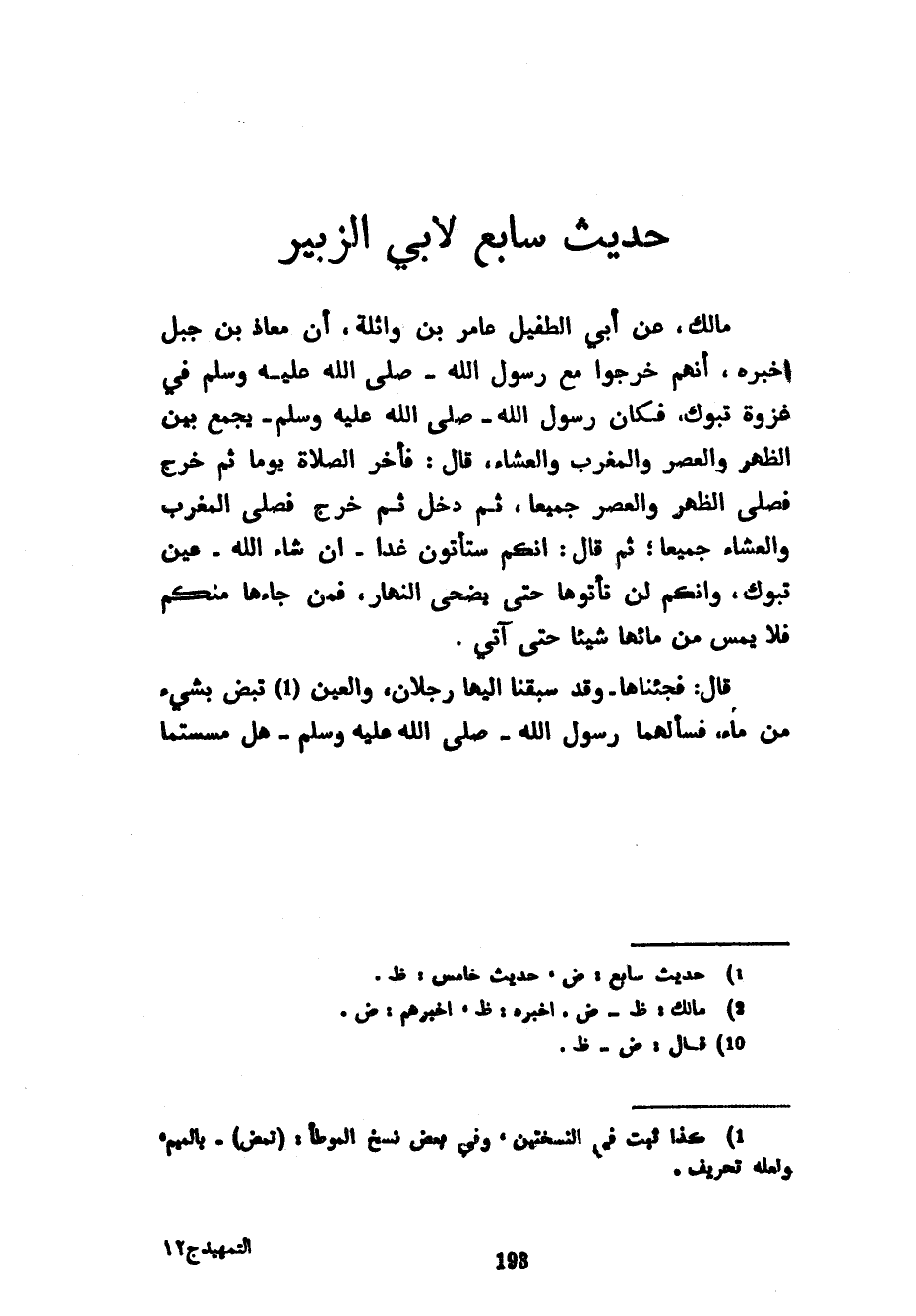 حَدِيثٌ سَابِعٌ لِأَبِي الزُّبَيْرِ مَالِكٌ عَنْ أَبِي الطُّفَيْلِ عَامِرِ بْنِ وَاثِلَةَ أَنَّ مُعَاذَ بْنَ جَبَلٍ أَخْبَرَهُ أَنَّهُمْ خَرَجُوا مَعَ رَسُولِ اللَّهِ صَلَّى اللَّهُ عَلَيْهِ وَسَلَّمَ فِي غَزْوَةِ تَبُوكَ فَكَانَ رَسُولُ اللَّهِ صَلَّى اللَّهُ عَلَيْهِ وَسَلَّمَ يَجْمَعُ بَيْنَ الظُّهْرِ وَالْعَصْرِ وَالْمَغْرِبِ وَالْعَشَاءِ قَالَ فَأَخَّرَ الصَّلَاةَ يَوْمًا ثُمَّ خَرَجَ فَصَلَّى الظُّهْرَ وَالْعَصْرَ جَمِيعًا ثُمَّ دَخَلَ ثُمَّ خَرَجَ فَصَلَّى الْمَغْرِبَ وَالْعَشَاءَ جَمِيعًا ثُمَّ قَالَ إِنَّكُمْ سَتَأْتُونَ غَدًا إِنْ شَاءَ اللَّهُ عَيْنَ تَبُوكَ وَإِنَّكُمْ لَنْ تَأْتُوهَا حَتَّى يَضْحَى النَّهَارُ فَمَنْ جَاءَهَا مِنْكُمْ فَلَا يَمَسَّ مِنْ مَائِهَا شَيْئًا حَتَّى آتِيَ قَالَ فَجِئْنَاهَا وَقَدْ سَبَقَنَا إِلَيْهَا رَجُلَانِ وَالْعَيْنُ تَبُضُّ بِشَيْءٍ مِنْ مَاءٍ فَسَأَلَهُمَا رَسُولُ اللَّهِ صَلَّى اللَّهُ عَلَيْهِ وَسَلَّمَ هَلْ مَسَسْتُمَا