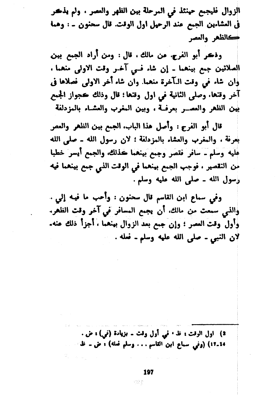 الزَّوَالِ فَلْيَجْمَعْ حِينَئِذٍ فِي الْمَرْحَلَةِ بَيْنَ الظُّهْرِ وَالْعَصْرِ وَلَمْ يَذْكُرْ فِي الْعِشَاءَيْنِ الْجَمْعَ عِنْدَ الرَّحِيلِ أَوَّلَ الْوَقْتِ قَالَ سَحْنُونٌ وَهُمَا كَالظُّهْرِ وَالْعَصْرِ وَذَكَرَ أَبُو الْفَرَجِ عَنْ مَالِكٍ قَالَ وَمَنْ أَرَادَ الْجَمْعَ بَيْنَ الصَّلَاتَيْنِ جَمَعَ بَيْنَهُمَا إِنْ شَاءَ فِي آخِرِ وَقْتِ الْأُولَى مِنْهُمَا وَإِنْ شَاءَ فِي وَقْتِ الْآخِرَةِ مِنْهُمَا وَإِنْ شَاءَ أَخَّرَ الْأُولَى فَصَلَّاهَا فِي آخِرِ وَقْتِهَا وَصَلَّى الثَّانِيَةِ فِي أَوَّلِ وَقْتِهَا قَالَ وَذَلِكَ كَجَوَازِ الْجَمْعِ بَيْنَ الظُّهْرِ وَالْعَصْرِ بِعَرَفَةَ وَبَيْنَ الْمَغْرِبِ وَالْعِشَاءِ بِالْمُزْدَلِفَةِ قَالَ أَبُو الْفَرَجِ وَأَصْلُ هَذَا الْبَابِ الْجَمْعُ بَيْنَ الظُّهْرِ وَالْعَصْرِ بِعَرَفَةَ وَالْمَغْرِبِ وَالْعَشَاءِ بِالْمُزْدَلِفَةِ لِأَنَّ رَسُولَ اللَّهِ صَلَّى اللَّهُ عَلَيْهِ وَسَلَّمَ سَافَرَ فَقَصَرَ وَجَمَعَ بَيْنَهُمَا كَذَلِكَ وَالْجَمْعُ أَيْسَرُ خَطْبًا مِنَ التَّقْصِيرِ فَوَجَبَ الْجَمْعُ بَيْنَهُمَا فِي الْوَقْتِ الَّذِي جَمَعَ بَيْنَهُمَا فِيهِ رَسُولُ اللَّهِ صَلَّى اللَّهُ عَلَيْهِ وَسَلَّمَ وَفِي سَمَاعِ ابْنِ الْقَاسِمِ قَالَ سَحْنُونُ وَأَحَبُّ مَا فِيهِ إِلَيَّ وَالَّذِي سَمِعْتُ مِنْ مَالِكٍ أَنْ يَجْمَعَ الْمُسَافِرُ فِي آخِرِ وَقْتِ الظُّهْرِ وَأَوَّلِ وَقْتِ الْعَصْرِ وَإِنْ جَمَعَ بَعْدَ الزَّوَالِ بَيْنَهُمَا أَجْزَأَ ذَلِكَ عَنْهُ لِأَنَّ النَّبِيَّ صَلَّى اللَّهُ عَلَيْهِ وَسَلَّمَ فَعَلَهُ