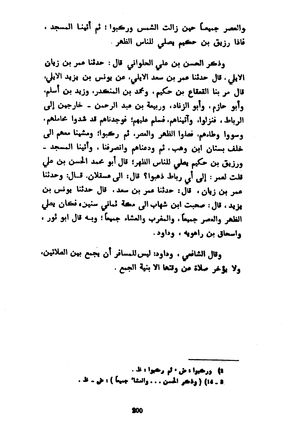 وَالْعَصْرَ جَمِيعًا حِينَ زَالَتِ الشَّمْسُ وَرَكِبُوا ثُمَّ أَتَيْنَا الْمَسْجِدَ فَإِذَا رُزَيْقُ بْنُ حَكِيمٍ يُصَلِّي لِلنَّاسِ الظُّهَرَ وَذَكَرَ الْحَسَنُ بْنُ عَلِيٍّ الْحُلْوَانِيُّ قَالَ حَدَّثَنَا عمر بن ريان الْأَيْلِيُّ قَالَ حَدَّثَنَا عُمَرُ بْنُ سَعْدٍ الْأَيْلِيُّ عَنْ يُونُسَ بْنِ يَزِيدَ الْأَيْلِيِّ قَالَ مَرَّ بِنَا الْقَعْقَاعُ بْنُ حَكِيمٍ وَمُحَمَّدُ بْنُ الْمُنْكَدِرِ زيد بْنُ أَسْلَمَ وَأَبُو حَازِمٍ وَأَبُو الزِّنَادِ وَرَبِيعَةُ بْنُ عَبْدِ الرَّحْمَنِ خَارِجِينَ إِلَى الرِّبَاطِ فَنَزَلُوا وآتيناهم فسلم عَلَيْهِمْ فَوَجَدْنَاهُمْ قَدْ شَدُّوا مَحَامِلَهُمْ وَسَوَّوْا وِطَاءَهُمْ فَصَلُّوا الظُّهْرَ وَالْعَصْرَ ثُمَّ رَكِبُوا وَمَشَيْنَا مَعَهُمْ إِلَى خَلْفِ بُسْتَانِ ابْنِ وَهْبٍ ثُمَّ وَدَّعْنَاهُمْ وَانْصَرَفْنَا وَأَتَيْنَا الْمَسْجِدَ وَرُزَيْقُ بْنُ حَكِيمٍ يُصَلِّي لِلنَّاسِ الظُّهْرَ قَالَ أَبُو مُحَمَّدٍ الْحَسَنُ بْنُ عَلِيٍّ قُلْتُ لِعُمَرَ إِلَى أَيِّ رِبَاطٍ ذَهَبُوا قَالَ إِلَى عَسْقَلَانَ قَالَ وَحَدَّثَنَا عُمَرُ بْنُ زيان قال حدثنا عُمَرُ بْنُ زَيَّانَ قَالَ حَدَّثَنَا عُمَرُ بْنُ سَعْدٍ قَالَ حَدَّثَنَا يُونُسُ بْنُ يَزِيدَ قَالَ صَحِبْتُ ابْنَ شِهَابٍ إِلَى مَكَّةَ ثَمَانِيَ سِنِينَ فَكَانَ يُصَلِّي الظُّهْرَ وَالْعَصْرَ جَمِيعًا وَالْمَغْرِبَ وَالْعَشَاءَ جَمِيعًا وَبِهِ قَالَ أَبُو ثَوْرٍ وَإِسْحَاقُ بْنُ رَاهَوَيْهِ وَدَاوُدُ وَقَالَ الشَّافِعِيُّ وَدَاوُدُ لَيْسَ لِلْمُسَافِرِ أَنْ يَجْمَعَ بَيْنَ الصَّلَاتَيْنِ وَلَا يُؤَخِّرَ صَلَاةً عَنْ وَقْتِهَا إِلَّا بِنِيَّةِ الْجَمْعِ