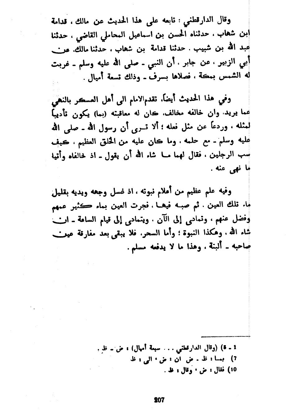 وَقَالَ الدَّارَقُطْنِيُّ تَابَعَهُ عَلَى هَذَا الْحَدِيثِ عَنْ مَالِكٍ قُدَامَةُ بْنُ شِهَابٍ حَدَّثَنَاهُ الْحَسَنُ بْنُ إِسْمَاعِيلَ الْمَحَامِلِيُّ الْقَاضِي حَدَّثَنَا عَبْدُ اللَّهِ بْنُ شَبِيبٍ حَدَّثَنَا قُدَامَةُ بْنُ شِهَابٍ حَدَّثَنَا مَالِكٌ عَنْ أَبِي الزُّبَيْرِ عَنْ جَابِرٍ أَنَّ النَّبِيَّ صَلَّى اللَّهُ عَلَيْهِ وَسَلَّمَ غَرَبَتْ لَهُ الشَّمْسُ بِمَكَّةَ فَصَلَّاهَا بِسَرِفَ وَذَلِكَ تِسْعَةٌ أَمْيَالٍ وَفِي هَذَا الْحَدِيثِ أَيْضًا تَقَدُّمُ الْإِمَامِ إِلَى أَهْلِ الْعَسْكَرِ بِالنَّهْيِ عَمَّا يُرِيدُ وَإِنْ خَالَفَهُ مُخَالِفٌ كَانَ لَهُ مُعَاقَبَتَهُ (بِمَا) يَكُونُ تَأْدِيبًا لِمِثْلِهِ وَرَدْعًا عَنْ مِثْلِ فِعْلِهِ أَلَا تَرَى أَنَّ رَسُولَ اللَّهِ صَلَّى اللَّهُ عَلَيْهِ وَسَلَّمَ مَعَ حِلْمِهِ وَمَا كَانَ عَلَيْهِ مِنَ الْخُلُقِ الْعَظِيمِ كَيْفَ سَبَّ الرَّجُلَيْنِ فَقَالَ لَهُمَا مَا شَاءَ اللَّهُ أَنْ يَقُولَ إِذْ خَالَفَاهُ وَأَتَيَا مَا نَهَى عَنْهُ وَفِيهِ عَلَمٌ عَظِيمٌ مِنْ أَعْلَامَ نُبُوَّتِهِ إِذْ غَسَلَ وَجْهَهُ وَيَدَيْهِ بِقَلِيلِ مَاءِ تِلْكَ الْعَيْنِ ثُمَّ صَبَّهُ فِيهَا فَجَرَتِ الْعَيْنُ بِمَاءٍ كَثِيرٍ عَمَّهُمْ وَفَضَلَ عَنْهُمْ وَتَمَادَى إِلَى الْآنِ وَيَتَمَادَى إِلَى قِيَامِ السَّاعَةِ إِنْ شَاءَ اللَّهُ وَهَكَذَا النُّبُوَّةُ وَأَمَّا السِّحْرُ فَلَا يَبْقَى بَعْدَ مُفَارَقَةِ عَيْنِ صَاحِبِهِ أَلْبَتَّةَ وَهَذَا مَا لَا يَدْفَعُهُ مُسْلِمٌ
