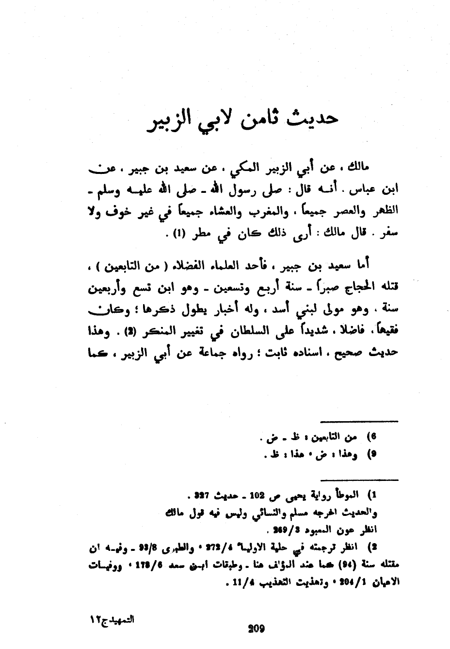 حَدِيثٌ ثَامِنٌ لِأَبِي الزُّبَيْرِ مَالِكٌ عَنْ أَبِي الزُّبَيْرِ الْمَكِّيِّ عَنْ سَعِيدِ بْنِ جُبَيْرٍ عَنِ ابْنِ عَبَّاسٍ أَنَّهُ قَالَ صَلَّى رَسُولُ اللَّهِ صَلَّى اللَّهُ عَلَيْهِ وَسَلَّمَ الظُّهْرَ وَالْعَصْرَ جَمِيعًا وَالْمَغْرِبَ وَالْعَشَاءَ جَمِيعًا فِي غَيْرِ خَوْفٍ وَلَا سَفَرٍ قَالَ مَالِكٌ أَرَى ذَلِكَ كَانَ فِي مَطَرٍ أَمَّا سَعِيدُ بْنُ جُبَيْرٍ فَأَحَدُ الْعُلَمَاءِ الْفُضَلَاءِ (مِنَ التَّابِعِينَ) قَتَلَهُ الْحَجَّاجُ صَبْرًا سَنَةَ أَرْبَعٍ وَتِسْعِينَ وَهُوَ ابْنُ تِسْعٍ وَأَرْبَعِينَ سَنَةً وَهُوَ مَوْلَى لِبَنِي أَسَدٍ وَلَهُ أَخْبَارٌ يَطُولُ ذِكْرُهَا وَكَانَ فَقِيهًا فَاضِلًا شَدِيدًا عَلَى السُّلْطَانِ فِي تَغْيِيرِ الْمُنْكِرِ وَهَذَا حَدِيثٌ صَحِيحٌ إِسْنَادُهُ ثَابِتٌ رَوَاهُ جَمَاعَةٌ عَنْ أَبِي الزُّبَيْرِ كَمَا