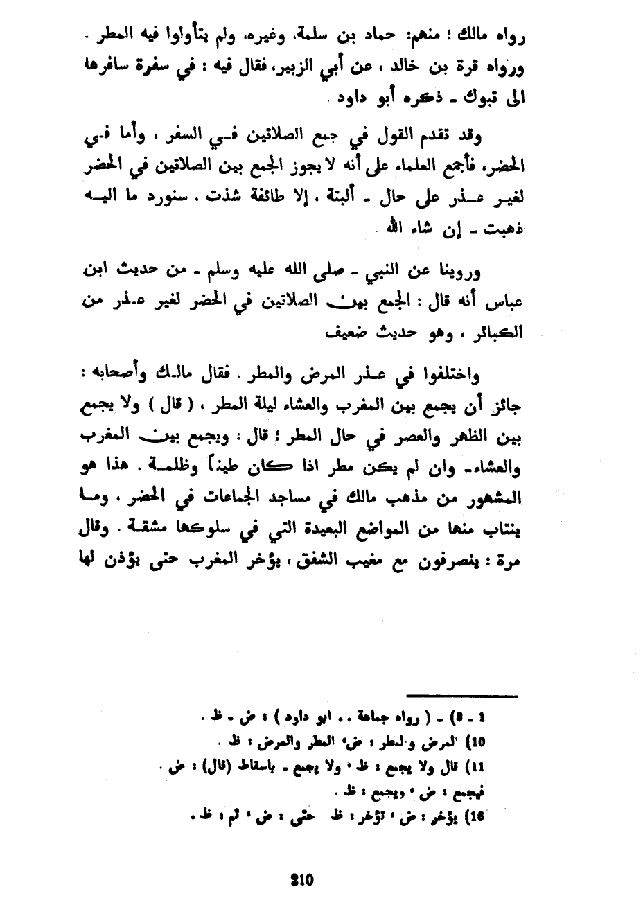 رَوَاهُ مَالِكٌ مِنْهُمْ حَمَّادُ بْنُ سَلَمَةَ وَغَيْرُهُ وَلِمَ يَتَأَوَّلُوا فِيهِ الْمَطَرَ وَرَوَاهُ قُرَّةُ بْنُ خَالِدٍ عَنْ أَبِي الزُّبَيْرِ فَقَالَ فِيهِ فِي سَفْرَةٍ سَافَرَهَا إِلَى تَبُوكَ ذَكَرَهُ أَبُو دَاوُدَ وَقَدْ تَقَدَّمَ الْقَوْلُ فِي جَمْعِ الصَّلَاتَيْنِ فِي السَّفَرِ وَأَمَّا فِي الْحَضَرِ فَأَجْمَعَ الْعُلَمَاءُ عَلَى أَنَّهُ لَا يَجُوزُ الْجَمْعُ بَيْنَ الصَّلَاتَيْنِ فِي الْحَضَرِ لِغَيْرِ عُذْرٍ عَلَى حَالٍ أَلْبَتَّةَ إِلَّا طَائِفَةٌ شَذَّتْ سَنُورِدُ مَا إِلَيْهِ ذَهَبَتْ إِنْ شَاءَ اللَّهُ وَرُوِّينَا عَنِ النَّبِيِّ صَلَّى اللَّهُ عَلَيْهِ وَسَلَّمَ مِنْ حَدِيثِ ابْنِ عَبَّاسٍ أَنَّهُ قَالَ الْجَمْعُ بَيْنَ الصَّلَاتَيْنِ فِي الْحَضَرِ لِغَيْرِ عُذْرٍ مِنَ الْكَبَائِرِ وَهُوَ حَدِيثٌ ضَعِيفٌ وَاخْتَلَفُوا فِي عُذْرِ الْمَرَضِ وَالْمَطَرِ فَقَالَ مَالِكٌ وَأَصْحَابُهُ جَائِزٌ أَنْ يُجْمَعَ بَيْنَ الْمَغْرِبِ وَالْعَشَاءِ لَيْلَةَ الْمَطَرِ (قَالَ) وَلَا يُجْمَعَ بَيْنَ الظُّهْرِ وَالْعَصْرِ فِي حَالِ الْمَطَرِ قَالَ وَيُجْمَعُ بَيْنَ الْمَغْرِبِ وَالْعَشَاءِ وَإِنْ لَمْ يَكُنْ مَطَرٌ إِذَا كَانَ طِينًا وَظُلْمَةً هَذَا هُوَ الْمَشْهُورُ مِنْ مَذْهَبِ مَالِكٍ فِي مَسَاجِدِ الْجَمَاعَاتِ فِي الْحَضَرِ وَمَا يَنْتَابُ مِنْهَا مِنَ الْمَوَاضِعِ الْبَعِيدَةِ الَّتِي فِي سُلُوكِهَا مَشَقَّةٌ وَقَالَ مَرَّةً يَنْصَرِفُونَ مَعَ مَغِيبِ الشَّفَقِ يُؤَخِّرُ الْمَغْرِبَ حَتَّى يُؤَذِّنَ لَهَا