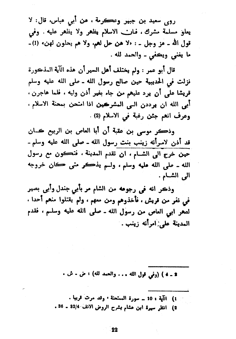 رَوَى سَعِيدُ بْنُ جُبَيْرٍ وَعِكْرِمَةُ عَنْ أَبِي عَبَّاسٍ قَالَ لَا يَعْلُو مُسْلِمَةً مُشْرِكٌ فَإِنَّ الْإِسْلَامَ يَظْهَرُ وَلَا يُظْهَرُ عَلَيْهِ وَفِي قَوْلِ اللَّهِ عَزَّ وَجَلَّ لَا هُنَّ حِلٌّ لَهُمْ وَلَا هُمْ يَحِلُّونَ لَهُنَّ مَا يُغْنِي وَيَكْفِي وَالْحَمْدُ لِلَّهِ قَالَ أَبُو عُمَرَ وَلَمْ يَخْتَلِفْ أَهْلُ السِّيَرِ أَنَّ هَذِهِ الْآيَةَ الْمَذْكُورَةَ نَزَلَتْ فِي الْحُدَيْبِيَةِ حِينَ صَالَحَ رَسُولُ اللَّهِ صَلَّى اللَّهُ عَلَيْهِ وَسَلَّمَ قُرَيْشًا عَلَى أَنْ يَرُدَّ عَلَيْهِمْ مَنْ جَاءَ بِغَيْرِ إِذْنِ وَلِيِّهِ فَلَمَّا هَاجَرْنَ أَبَى اللَّهُ أَنْ يُرْدَدْنَ إِلَى الْمُشْرِكِينَ إذا امتحن بمحنة الإسلام وعرف أنهم جِئْنَ رَغْبَةً فِي الْإِسْلَامِ وَذَكَرَ مُوسَى بْنُ عُقْبَةَ أَنَّ أَبَا الْعَاصِ بْنَ الرَّبِيعِ كَانَ قَدْ أَذِنَ لِامْرَأَتِهِ زَيْنَبَ بِنْتُ رَسُولِ اللَّهِ صَلَّى اللَّهُ عَلَيْهِ وَسَلَّمَ حِينَ خَرَجَ إِلَى الشَّامِ أَنْ تَقْدَمَ الْمَدِينَةَ فَتَكُونَ مَعَ رَسُولِ اللَّهِ صَلَّى اللَّهُ عَلَيْهِ وَسَلَّمَ وَلَمْ يَذْكُرْ مَتَى كَانَ خُرُوجُهُ إِلَى الشَّامِ وَذَكَرَ أَنَّهُ فِي رُجُوعِهِ مِنَ الشَّامِ مَرَّ بِأَبِي جَنْدَلٍ وَأَبِي بَصِيرٍ فِي نَفَرٍ مِنْ قُرَيْشٍ فَأَخَذُوهُمْ وَمَنْ مَعَهُمْ وَلَمْ يَقْتُلُوا مِنْهُمْ أَحَدًا لِصِهْرِ أَبِي الْعَاصِ مِنْ رَسُولِ اللَّهِ صَلَّى اللَّهُ عَلَيْهِ وَسَلَّمَ فَقَدِمَ الْمَدِينَةَ عَلَى امْرَأَتِهِ زَيْنَبَ