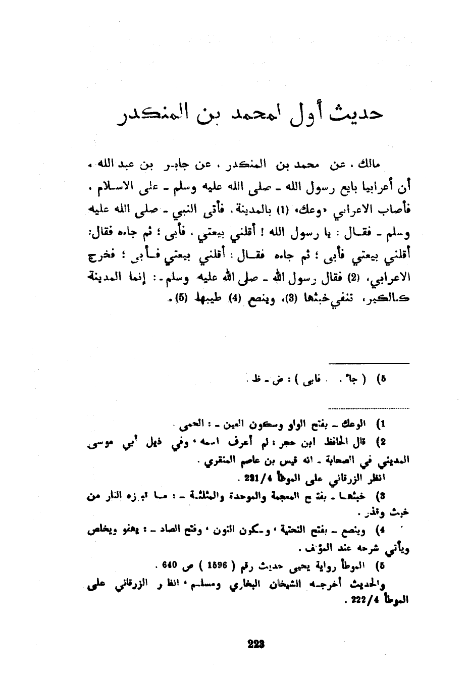 حديث أول لِمُحَمَّدِ بْنِ الْمُنْكَدِرِ مَالِكٌ عَنْ مُحَمَّدِ بْنِ الْمُنْكَدِرِ عَنْ جَابِرِ بْنِ عَبْدِ اللَّهِ أَنَّ أَعْرَابِيًّا بَايَعَ رَسُولَ اللَّهِ صَلَّى اللَّهُ عَلَيْهِ وَسَلَّمَ
