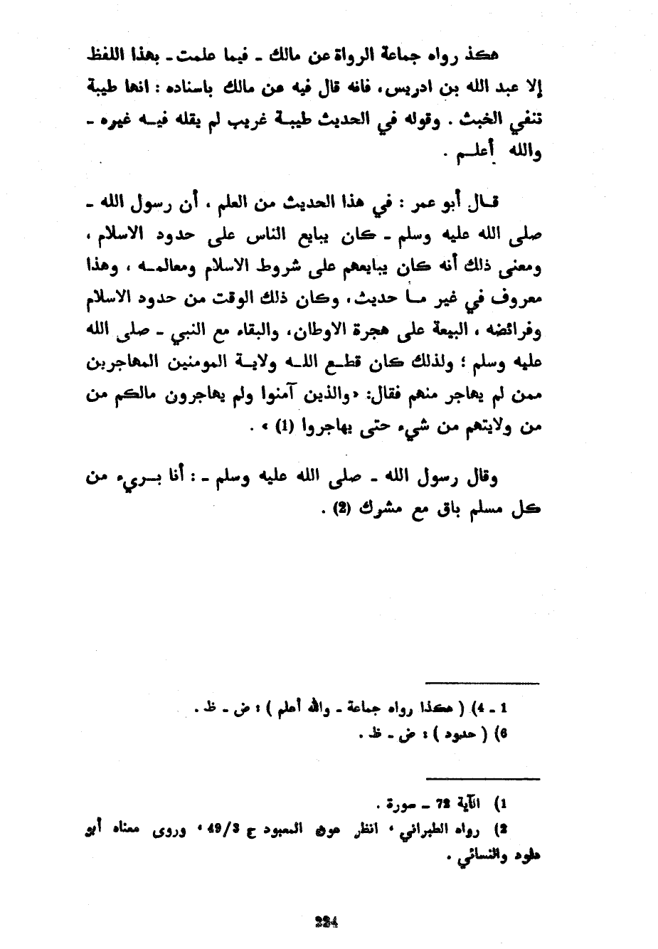 هَكَذَا رَوَاهُ جَمَاعَةُ الرُّوَاةِ عَنْ مَالِكٍ فِيمَا عَلِمْتُ بِهَذَا اللَّفْظِ إِلَّا عَبْدَ اللَّهِ بْنَ إِدْرِيسَ فَإِنَّهُ قَالَ فِيهِ عَنْ مَالِكٍ بِإِسْنَادِهِ إِنَّهَا طَيِّبَةٌ تَنْفِي الْخَبَثَ وَقَوْلُهُ فِي الْحَدِيثِ طَيِّبَةٌ غَرِيبٌ لَمْ يَقُلْهُ فِيهِ غَيْرُهُ وَاللَّهُ أَعْلَمُ قَالَ أَبُو عُمَرَ فِي هَذَا الْحَدِيثِ مِنَ الْعِلْمِ أَنَّ رَسُولَ اللَّهِ صَلَّى اللَّهُ عَلَيْهِ وَسَلَّمَ كَانَ يُبَايِعُ النَّاسَ عَلَى حُدُودِ الْإِسْلَامِ وَمَعْنَى ذَلِكَ أَنَّهُ كَانَ يُبَايِعُهُمْ عَلَى شُرُوطِ الْإِسْلَامِ وَمَعَالِمِهِ وَهَذَا مَعْرُوفٌ فِي غَيْرِ مَا حَدِيثٍ وَكَانَ ذَلِكَ الْوَقْتُ مِنْ حُدُودِ الْإِسْلَامِ وَفَرَائِضِهِ الْبَيْعَةَ عَلَى هِجْرَةِ الْأَوْطَانِ وَالْبَقَاءِ مَعَ النَّبِيِّ صَلَّى اللَّهُ عَلَيْهِ وَسَلَّمَ وَلِذَلِكَ كَانَ قَطَعَ اللَّهُ وِلَايَةَ الْمُؤْمِنِينَ الْمُهَاجِرِينَ مِمَّنْ لَمْ يُهَاجِرْ مِنْهُمْ فَقَالَ وَالَّذِينَ آمَنُوا وَلَمْ يهاجروا مالكم مِنْ وَلَايَتِهِمْ مِنْ شَيْءٍ حَتَّى يُهَاجِرُوا وَقَالَ رَسُولُ اللَّهِ صَلَّى اللَّهُ عَلَيْهِ وَسَلَّمَ أَنَا بَرِيءٌ مِنْ كُلِّ مُسْلِمٍ بَاقٍ مَعَ مُشْرِكٍ