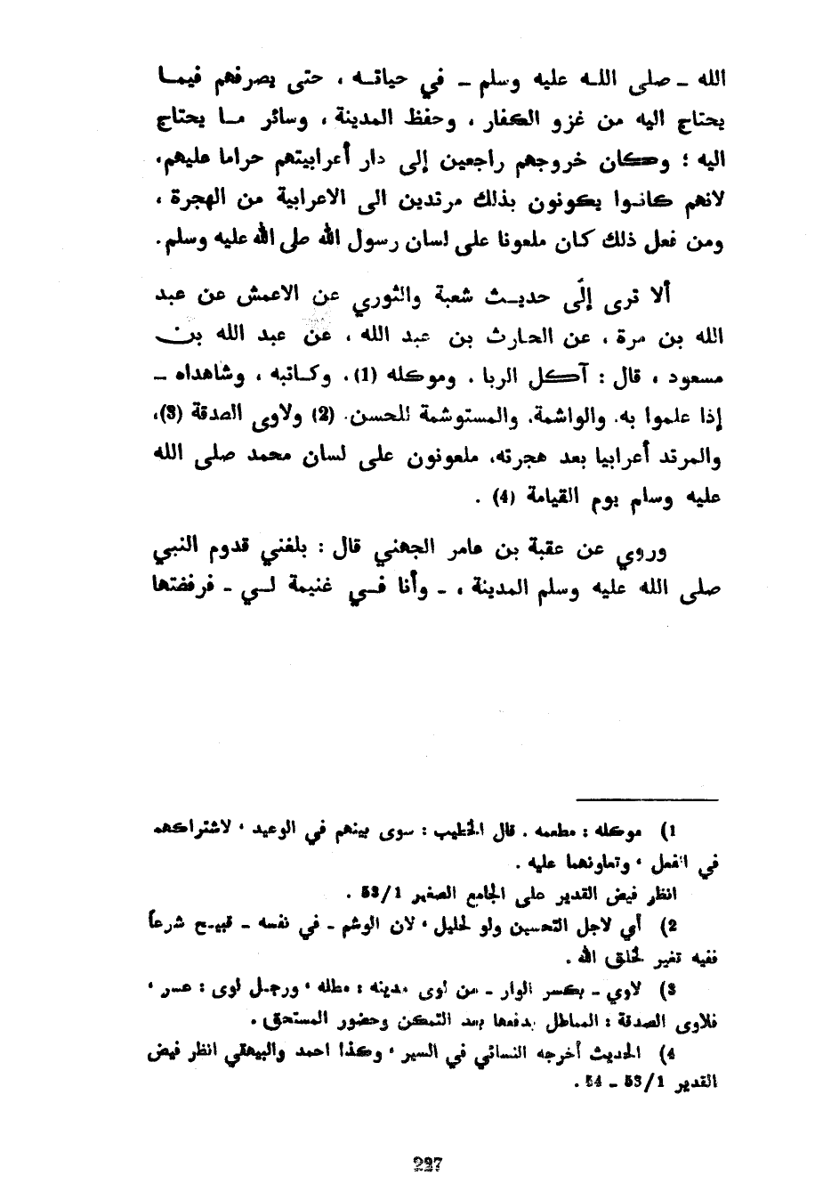 اللَّهِ صَلَّى اللَّهُ عَلَيْهِ وَسَلَّمَ فِي حَيَاتِهِ حَتَّى يَصْرِفَهُمْ فِيمَا يَحْتَاجُ إِلَيْهِ مِنْ غَزْوِ الْكُفَّارِ وَحِفْظِ الْمَدِينَةِ وَسَائِرِ مَا يُحْتَاجُ إِلَيْهِ وَكَانَ خُرُوجُهُمْ رَاجِعِينَ إِلَى دَارِ أَعْرَابِيَّتِهِمْ حَرَامًا عَلَيْهِمْ لِأَنَّهُمْ كَانُوا يَكُونُونَ بِذَلِكَ مُرْتَدِّينَ إِلَى الْأَعْرَابِيَّةِ مِنَ الْهِجْرَةِ وَمَنْ فَعَلَ ذَلِكَ كَانَ مَلْعُونًا عَلَى لِسَانِ رَسُولِ اللَّهِ صَلَّى اللَّهُ عَلَيْهِ وَسَلَّمَ أَلَا تَرَى إِلَى حَدِيثِ شُعْبَةَ وَالثَّوْرِيِّ عَنِ الْأَعْمَشِ عَنْ عَبْدِ اللَّهِ بْنِ مُرَّةَ عَنِ الْحَارِثِ بْنِ عَبْدِ اللَّهِ عَنْ عَبْدِ اللَّهِ بْنِ مَسْعُودٍ قَالَ آكِلُ الرِّبَا وَمُوَكِّلُهُ وَكَاتِبُهُ وَشَاهِدَاهُ إِذَا عَلِمُوا بِهِ وَالْوَاشِمَةُ وَالْمُسْتَوْشِمَةُ لِلْحُسْنِ وَلَاوِي الصَّدَقَةِ وَالْمُرْتَدُّ أَعْرَابِيًّا بَعْدَ هجرته معلونون عَلَى لِسَانِ مُحَمَّدٍ صَلَّى اللَّهُ عَلَيْهِ وَسَلَّمَ يَوْمَ الْقِيَامَةِ وَرُوِيَ عَنْ عُقْبَةَ بْنِ عَامِرٍ الْجُهَنِيِّ قَالَ بَلَغَنِي قُدُومُ النَّبِيُّ صَلَّى اللَّهُ عَلَيْهِ وَسَلَّمَ الْمَدِينَةَ وَأَنَا فِي غَنِيمَةٍ لِي فرفضتها
