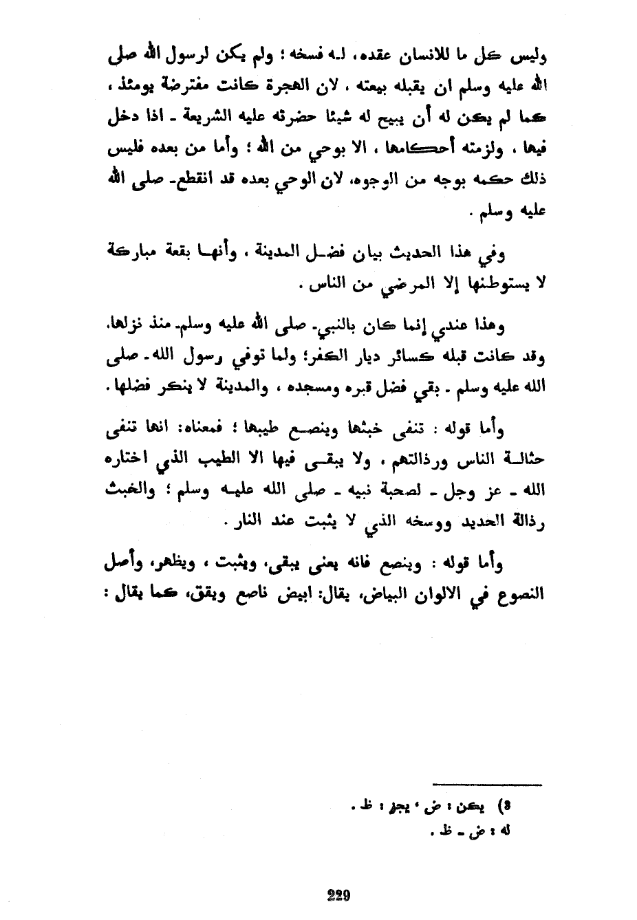 وَلَيْسَ كُلُّ مَا لِلْإِنْسَانِ عَقْدُهُ لَهُ فَسْخُهُ وَلَمْ يَكُنْ لِرَسُولِ اللَّهِ صَلَّى اللَّهُ عَلَيْهِ وَسَلَّمَ إِنَّ يَقْبَلَهُ بَيْعَتَهُ لِأَنَّ الْهِجْرَةَ كَانَتْ مُفْتَرَضَةً يَوْمَئِذٍ كَمَا لَمْ يَكُنْ لَهُ أَنْ يُبِيحَ لَهُ شَيْئًا حَظَرَتْهُ عَلَيْهِ الشَّرِيعَةُ إِذَا دَخَلَ فِيهَا وَلَزِمَتْهُ أَحْكَامُهَا إِلَّا بِوَحْيٍ مِنَ اللَّهِ وَأَمَّا مَنْ بَعْدَهُ فَلَيْسَ ذَلِكَ حُكْمَهُ بِوَجْهٍ مِنَ الْوُجُوهِ لِأَنَّ الْوَحْيَ بَعْدَهُ قَدِ انْقَطَعَ صَلَّى اللَّهُ عَلَيْهِ وَسَلَّمَ وَفِي هَذَا الْحَدِيثِ بَيَانُ فَضْلِ الْمَدِينَةِ وَأَنَّهَا بُقْعَةٌ مُبَارَكَةٌ لَا يَسْتَوْطِنُهَا إِلَّا الْمَرْضِيُّ مِنَ النَّاسِ وَهَذَا عِنْدِي إِنَّمَا كَانَ بِالنَّبِيِّ صَلَّى اللَّهُ عَلَيْهِ وَسَلَّمَ مُنْذُ نَزَلَهَا وَقَدْ كَانَتْ قَبْلَهُ كَسَائِرِ دِيَارِ الْكُفْرِ وَلَمَّا تُوُفِّيَ رَسُولُ اللَّهِ صَلَّى اللَّهُ عَلَيْهِ وَسَلَّمَ بَقِيَ فَضْلُ قَبْرِهِ وَمَسْجِدِهِ وَالْمَدِينَةُ لَا يُنْكَرُ فَضْلُهَا وَأَمَّا قَوْلُهُ تَنْفِي خَبَثَهَا وَيَنْصَعُ طِيبُهَا فَمَعْنَاهُ أَنَّهَا تَنْفِي حُثَالَةَ الناس ورذالتهم وَلَا يَبْقَى فِيهَا إِلَّا الطَّيِّبُ الَّذِي اخْتَارَهُ اللَّهُ عَزَّ وَجَلَّ لِصُحْبَةِ نَبِيِّهِ صَلَّى اللَّهُ عَلَيْهِ وَسَلَّمَ وَالْخَبَثُ رَذَالَةُ الْحَدِيدِ وَوَسَخُهُ الَّذِي لَا يَثْبُتُ عِنْدَ النَّارِ وَأَمَّا قَوْلُهُ وَيَنْصَعُ فَإِنَّهُ يَعْنِي يَبْقَى وَيَثْبُتُ وَيَظْهَرُ وَأَصْلُ النُّصُوعِ فِي الْأَلْوَانِ الْبَيَاضُ يُقَالُ أَبْيَضُ نَاصِعٌ وَيَقُقْ كما يقال