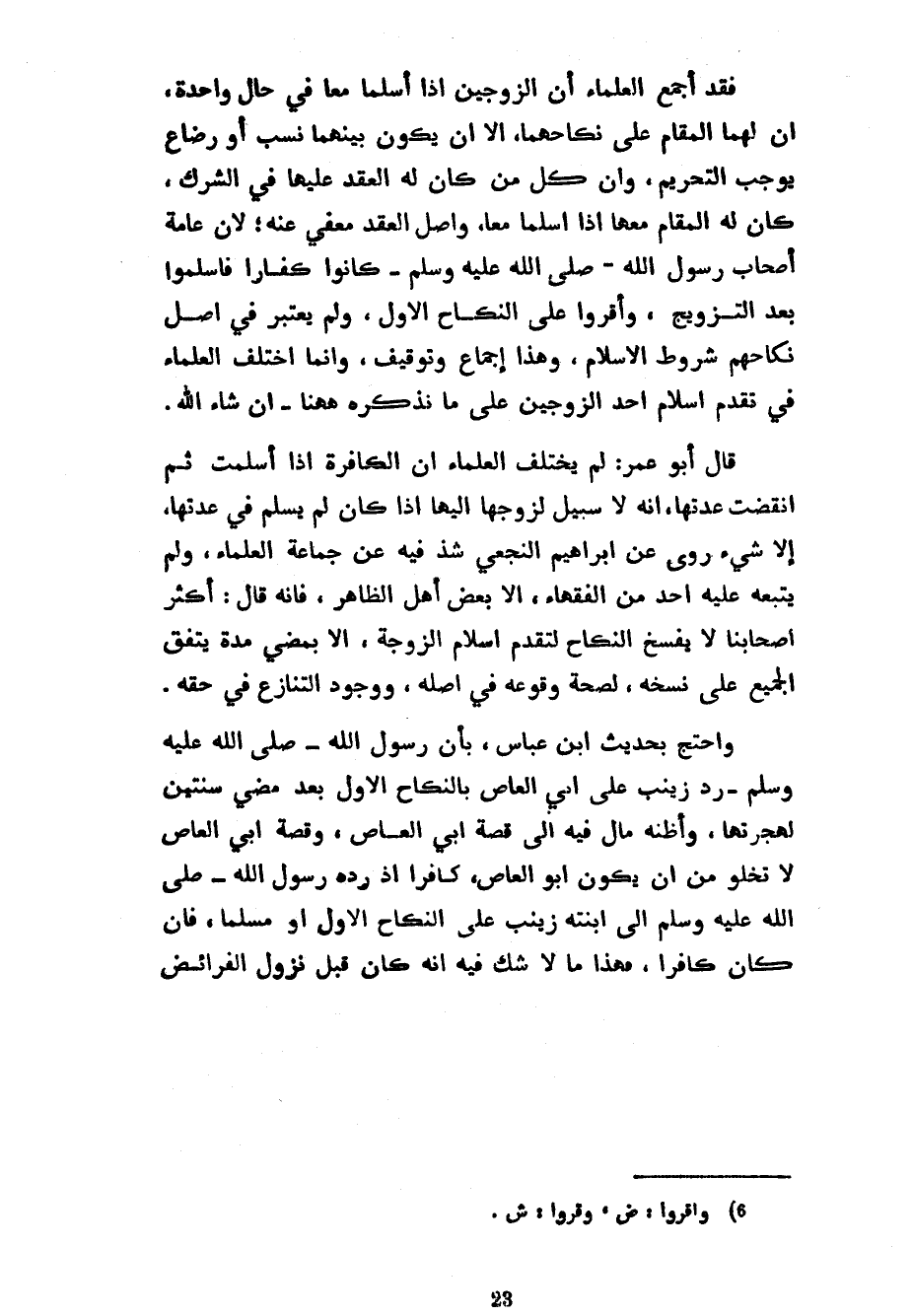 فَقَدْ أَجْمَعَ الْعُلَمَاءُ أَنَّ الزَّوْجَيْنِ إِذَا أَسْلَمَا مَعًا فِي حَالٍ وَاحِدَةٍ أَنَّ لَهُمَا الْمُقَامَ عَلَى نِكَاحِهِمَا إِلَّا أَنْ يَكُونَ بَيْنَهُمَا نَسَبٌ أَوْ رَضَاعٌ يُوجِبُ التَّحْرِيمَ وَأَنَّ كُلَّ مَنْ كَانَ لَهُ الْعَقْدُ عَلَيْهَا فِي الشِّرْكِ كَانَ لَهُ الْمُقَامُ مَعَهَا إِذَا أَسْلَمَا مَعًا وَأَصْلُ الْعَقْدِ مَعْفِيٌّ عَنْهُ لِأَنَّ عَامَّةِ أَصْحَابِ رَسُولِ اللَّهِ صَلَّى اللَّهُ عَلَيْهِ وَسَلَّمَ كَانُوا كُفَّارًا فَأَسْلَمُوا بَعْدَ التَّزْوِيجِ وَأُقِرُّوا عَلَى النِّكَاحِ الْأَوَّلِ وَلَمْ يُعْتَبَرْ فِي أَصْلِ نِكَاحِهِمْ شُرُوطُ الْإِسْلَامِ وَهَذَا إِجْمَاعٌ وَتَوْقِيفٌ وَإِنَّمَا اخْتَلَفَ الْعُلَمَاءُ فِي تَقَدُّمِ إِسْلَامِ أَحَدِ الزَّوْجَيْنِ عَلَى مَا نَذْكُرُهُ ههنا إِنْ شَاءَ اللَّهُ قَالَ أَبُو عُمَرَ لَمْ يَخْتَلِفِ الْعُلَمَاءُ أَنَّ الْكَافِرَةَ إِذَا أَسْلَمَتْ ثُمَّ انْقَضَتْ عِدَّتُهَا أَنَّهُ لَا سَبِيلَ لِزَوْجِهَا إِلَيْهَا إِذَا كَانَ لَمْ يُسْلِمْ فِي عِدَّتِهَا إِلَّا شَيْءٌ رُوِيَ عَنْ إِبْرَاهِيمَ النَّخَعِيِّ شَذَّ فِيهِ عَنْ جَمَاعَةِ الْعُلَمَاءِ وَلَمْ يَتْبَعْهُ عَلَيْهِ أَحَدٌ مِنَ الْفُقَهَاءِ إِلَّا بَعْضُ أَهْلِ الظَّاهِرِ فَإِنَّهُ قَالَ أَكْثَرُ أَصْحَابِنَا لَا يُفْسَخُ النِّكَاحُ لِتَقَدُّمِ إِسْلَامِ الزَّوْجَةِ إِلَّا بِمُضِيِّ مُدَّةٍ يَتَّفِقُ الْجَمِيعُ عَلَى نَسْخِهِ لِصِحَّةِ وُقُوعِهِ فِي أَصْلِهِ وَوُجُودِ التَّنَازُعِ فِي حَقِّهِ وَاحْتَجَّ بِحَدِيثِ ابْنِ عَبَّاسٍ بِأَنَّ رَسُولَ اللَّهِ صَلَّى اللَّهُ عَلَيْهِ وَسَلَّمَ رَدَّ زَيْنَبَ عَلَى أَبِي الْعَاصِ بِالنِّكَاحِ الْأَوَّلِ بَعْدَ مُضِيِّ سَنَتَيْنِ لِهِجْرَتِهَا وَأَظُنُّهُ مَالَ فِيهِ إِلَى قِصَّةِ أَبِي الْعَاصِ وَقِصَّةُ أَبِي الْعَاصِ لَا تَخْلُو مِنْ أَنْ يَكُونَ أَبُو الْعَاصِ كَافِرًا إِذْ رَدَّهُ رَسُولُ اللَّهِ صَلَّى اللَّهُ عَلَيْهِ وَسَلَّمَ إِلَى ابْنَتِهِ زَيْنَبَ عَلَى النِّكَاحِ الْأَوَّلِ أَوْ مُسْلِمًا فَإِنْ كَانَ كَافِرًا فَهَذَا مَا لَا شَكَّ فِيهِ أَنَّهُ كَانَ قَبْلَ نزول الفرائض