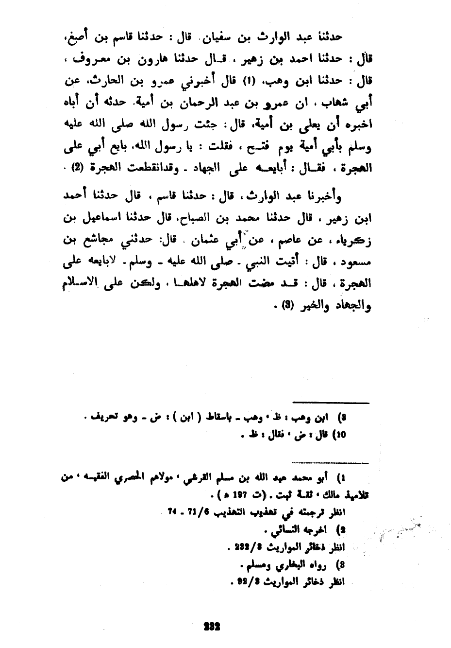 حَدَّثَنَا عَبْدُ الْوَارِثِ بْنُ سُفْيَانَ قَالَ حَدَّثَنَا قَاسِمُ بْنُ أَصْبَغَ قَالَ حَدَّثَنَا أَحْمَدُ بْنُ زُهَيْرٍ قَالَ حَدَّثَنَا هَارُونُ بْنُ مَعْرُوفٍ قَالَ حَدَّثَنَا ابْنُ وَهْبٍ قَالَ أَخْبَرَنِي عَمْرُو بْنُ الْحَارِثِ عَنْ أَبِي شِهَابٍ أَنَّ عَمْرَو بْنَ عبد الرحمان بْنِ أُمَيَّةَ حَدَّثَهُ أَنَّ أَبَاهُ أَخْبَرَهُ أَنَّ يَعْلَى بْنَ أُمَيَّةَ قَالَ جِئْتُ رَسُولَ اللَّهِ صَلَّى اللَّهُ عَلَيْهِ وَسَلَّمَ بِأَبِي أُمَيَّةَ يَوْمَ فَتَحَ فَقُلْتُ يَا رَسُولَ اللَّهِ بَايِعْ أَبِي عَلَى الْهِجْرَةِ فَقَالَ أُبَايِعُهُ عَلَى الْجِهَادِ وَقَدِ انْقَطَعَتِ الْهِجْرَةُ وَأَخْبَرَنَا عَبْدُ الْوَارِثِ قَالَ حَدَّثَنَا قَاسِمٌ قَالَ حَدَّثَنَا أَحْمَدُ بْنُ زُهَيْرٍ قَالَ حَدَّثَنَا مُحَمَّدُ بْنُ الصَّبَّاحِ قَالَ حَدَّثَنَا إِسْمَاعِيلُ بْنُ زَكَرِيَّاءَ عَنْ عَاصِمٍ عَنْ أَبِي عُثْمَانَ قَالَ حَدَّثَنِي مُجَاشِعُ بْنُ مَسْعُودٍ قَالَ أَتَيْتُ النَّبِيَّ صَلَّى اللَّهُ عَلَيْهِ وَسَلَّمَ لِأُبَايِعَهُ عَلَى الْهِجْرَةِ قَالَ قَدْ مَضَتِ الْهِجْرَةُ لِأَهْلِهَا وَلَكِنْ عَلَى الْإِسْلَامِ وَالْجِهَادِ وَالْخَيْرِ