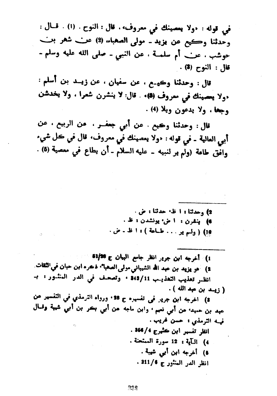 فِي قَوْلِهِ وَلَا يَعْصِينَكَ فِي مَعْرُوفٍ قَالَ النَّوْحُ قَالَ وَحَدَّثَنَا وَكِيعٌ عَنْ يَزِيدَ مَوْلَى الصَّهْبَاءِ عَنْ شَهْرِ بْنِ حَوْشَبٍ عَنْ أُمِّ سَلَمَةَ عَنِ النَّبِيِّ صَلَّى اللَّهُ عَلَيْهِ وَسَلَّمَ قَالَ النَّوْحُ قَالَ وَحَدَّثَنَا وَكِيعٌ عَنْ سُفْيَانَ عَنْ زَيْدِ بْنِ أَسْلَمَ وَلَا يَعْصِينَكَ فِي مَعْرُوفٍ قَالَ لَا يَنْشُرْنَ شَعْرًا وَلَا يَخْدِشْنَ وَجْهًا وَلَا يَدْعُونَ وَيْلًا قَالَ وَحَدَّثَنَا وَكِيعٌ عَنْ أَبِي جَعْفَرٍ عَنِ الرَّبِيعِ عَنْ أَبِي الْعَالِيَةِ فِي قَوْلِهِ وَلَا يَعْصِينَكَ فِي مَعْرُوفٍ قَالَ فِي كُلِّ شَيْءٍ وَافَقَ طَاعَةً (وَلَمْ يَرَ لِنَبِيِّهِ عَلَيْهِ السَّلَامُ أَنْ يُطَاعَ فِي معصية (5)