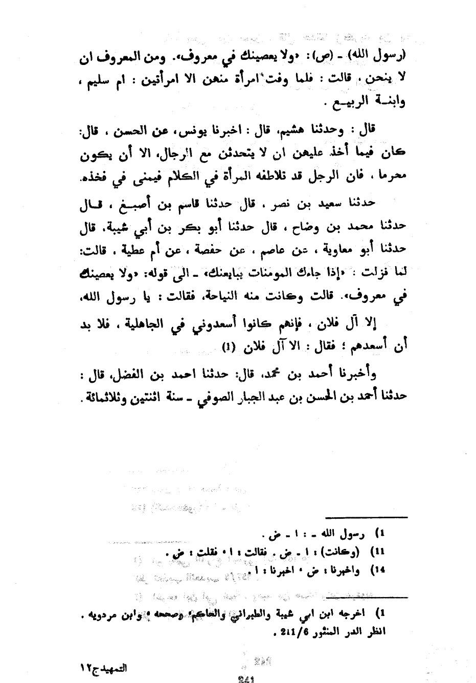 رَسُولَ اللَّهِ صَلَّى اللَّهُ عَلَيْهِ وَسَلَّمَ وَلَا يَعْصِينَكَ فِي مَعْرُوفٍ وَمِنَ الْمَعْرُوفِ أَنْ لَا يَنُحْنَ قَالَتْ فَلَمَّا وَفَّتِ امْرَأَةٌ مِنْهُنَّ إِلَّا امْرَأَتَيْنِ أَمَّ سَلِيمٍ وَابْنَةَ الرَّبِيعِ قَالَ وَحَدَّثَنَا هُشَيْمٌ قَالَ أَخْبَرَنَا يُونُسُ عَنِ الْحَسَنِ قَالَ كَانَ فِيمَا أُخِذَ عَلَيْهِنَّ أَنْ لَا يَتَحَدَّثْنَ مَعَ الرِّجَالِ إِلَّا أَنْ يَكُونَ مَحْرَمًا فَإِنَّ الرَّجُلَ قَدْ تُلَاطِفُهُ الْمَرْأَةُ فِي الْكَلَامِ فَيُمْنِي فِي فَخْذِهِ حَدَّثَنَا سَعِيدُ بْنُ نَصْرٍ قَالَ حَدَّثَنَا قَاسِمُ بْنُ أَصْبَغَ قَالَ حَدَّثَنَا مُحَمَّدُ بْنُ وَضَّاحٍ قَالَ حَدَّثَنَا أَبُو بَكْرِ بْنُ أَبِي شَيْبَةَ قَالَ حَدَّثَنَا أَبُو مُعَاوِيَةَ عَنْ عَاصِمٍ عَنْ حَفْصَةَ عَنْ أُمِّ عَطِيَّةَ قَالَتْ لَمَّا نَزَلَتْ إِذَا جَاءَكَ الْمُؤْمِنَاتُ يُبَايِعْنَكَ إِلَى قَوْلِهِ وَلَا يَعْصِينَكَ فِي مَعْرُوفٍ قَالَتْ وَكَانَتْ مِنْهُ النِّيَاحَةُ فَقَالَتْ يَا رَسُولَ اللَّهِ إِلَّا آلَ فُلَانٍ فَإِنَّهُمْ كَانُوا أَسْعَدُونِي فِي الْجَاهِلِيَّةِ فَلَا بُدَّ أَنْ أُسْعِدَهُمْ فَقَالَ إِلَّا آلَ فُلَانٍ وَأَخْبَرَنَا أَحْمَدُ بْنُ مُحَمَّدٍ قَالَ حَدَّثَنَا أَحْمَدُ بْنُ الْفَضْلِ قَالَ حَدَّثَنَا أَحْمَدُ بْنُ الْحَسَنِ بْنِ عَبْدِ الْجَبَّارِ الصُّوفِيُّ سَنَةَ اثْنَتَيْنِ وَثَلَاثِمِائَةٍ