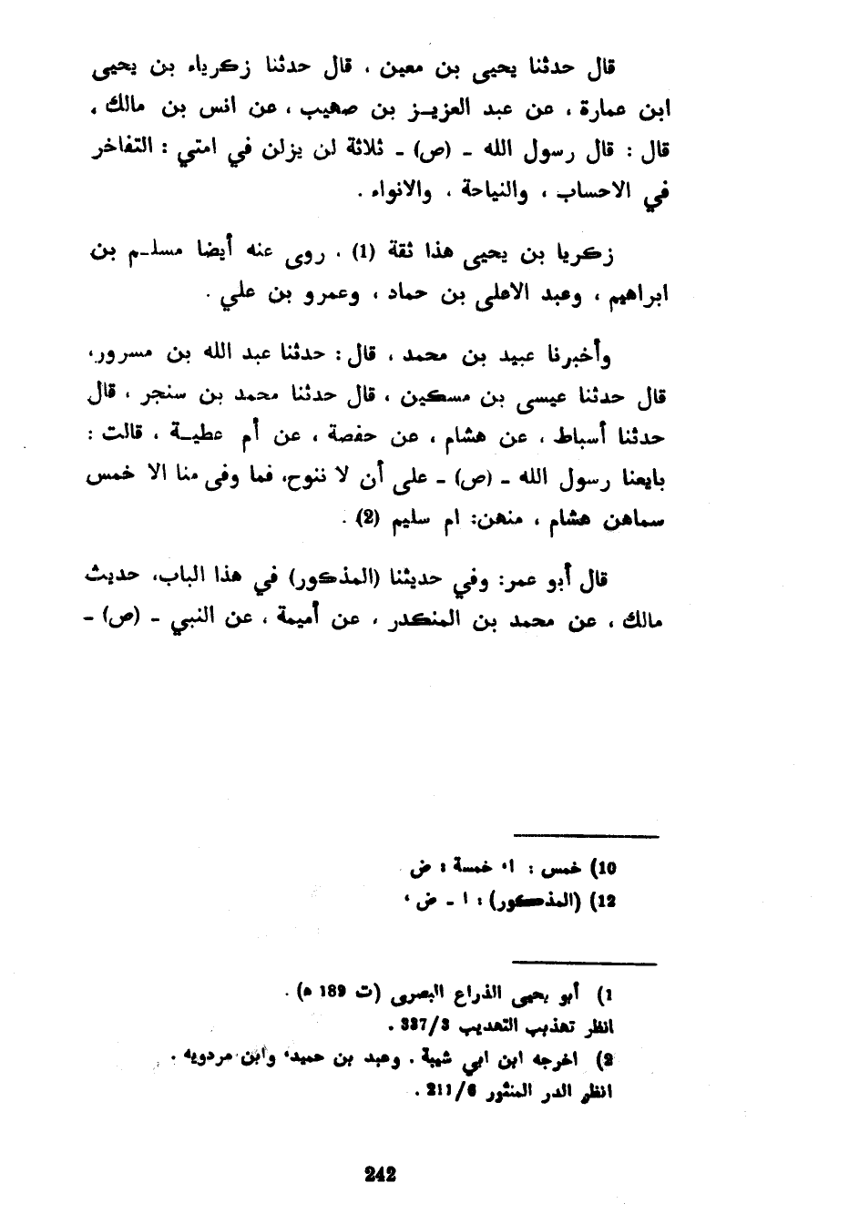 قَالَ حَدَّثَنَا يَحْيَى بْنُ مَعِينٍ قَالَ حَدَّثَنَا زَكَرِيَّاءُ بْنُ يَحْيَى بْنِ عُمَارَةَ عَنْ عَبْدِ الْعَزِيزِ بْنِ صُهَيْبٍ عَنْ أَنَسٍ بْنِ مَالِكٍ قَالَ قَالَ رَسُولُ اللَّهِ صَلَّى اللَّهُ عَلَيْهِ وَسَلَّمَ ثَلَاثَةٌ لَنْ يَزَلْنَ فِي أُمَّتِيَ التَّفَاخُرُ فِي الْأَحْسَابِ وَالنِّيَاحَةُ وَالْأَنْوَاءُ زَكَرِيَّا بْنُ يَحْيَى هَذَا ثِقَةٌ رَوَى عَنْهُ أَيْضًا مُسْلِمُ بْنُ إِبْرَاهِيمَ وَعَبْدُ الْأَعْلَى بْنُ حَمَّادٍ وَعَمْرُو بْنُ عَلِيٍّ وَأَخْبَرَنَا عُبَيْدُ بْنُ مُحَمَّدٍ قَالَ حَدَّثَنَا عَبْدُ اللَّهِ بْنُ مَسْرُورٍ قَالَ حَدَّثَنَا عِيسَى بْنُ مِسْكِينٍ قَالَ حَدَّثَنَا مُحَمَّدُ بْنُ سَنْجَرٍ قَالَ حَدَّثَنَا أَسْبَاطٌ عَنْ هِشَامٍ عَنْ حَفْصَةَ عَنْ أُمِّ عَطِيَّةَ قَالَتْ بَايَعْنَا رَسُولَ اللَّهِ صَلَّى اللَّهُ عَلَيْهِ وَسَلَّمَ عَلَى أَنْ لَا نَنُوحَ فَمَا وَفَّى مِنَّا إِلَّا خَمْسٌ سَمَّاهُنَّ هِشَامٌ مِنْهُنَّ أُمُّ سُلَيْمٍ قَالَ أَبُو عُمَرَ وَفِي حَدِيثِنَا (الْمَذْكُورِ) فِي هَذَا الْبَابِ حَدِيثِ مالك عن محمد بن المنكدر عن أميمة عَنِ النَّبِيِّ صَلَّى اللَّهُ عَلَيْهِ وَسَلَّمَ