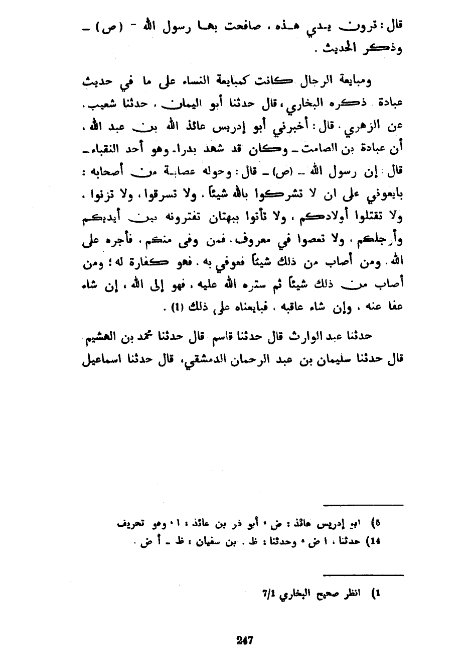 قَالَ تَرَوْنَ يَدِي هَذِهِ صَافَحْتُ بِهَا رَسُولُ اللَّهِ صَلَّى اللَّهُ عَلَيْهِ وَسَلَّمَ وَذَكَرَ الْحَدِيثَ وَمُبَايَعَةُ الرِّجَالِ كَانَتْ كَمُبَايَعَةِ النِّسَاءِ عَلَى مَا في حديث عبادة ذكر االبخاري قَالَ حَدَّثَنَا أَبُو الْيَمَانِ حَدَّثَنَا شُعَيْبٌ عَنِ الزُّهْرِيِّ قَالَ أَخْبَرَنِي أَبُو إِدْرِيسَ عَائِذُ اللَّهِ بْنُ عَبْدِ اللَّهِ أَنَّ عُبَادَةَ بْنَ الصَّامِتِ وَكَانَ قَدْ شَهِدَ بَدْرًا وَهُوَ أَحَدُ النُّقَبَاءِ قَالَ إِنَّ رَسُولَ اللَّهِ صَلَّى اللَّهُ عَلَيْهِ وَسَلَّمَ قَالَ وَحَوْلَهُ عِصَابَةٌ مِنْ أَصْحَابِهِ بَايِعُونِي عَلَى أَنْ لَا تُشْرِكُوا بِاللَّهِ شَيْئًا وَلَا تَسْرِقُوا وَلَا تَزْنُوا وَلَا تَقْتُلُوا أَوْلَادَكُمْ وَلَا تَأْتُوا بِبُهْتَانٍ تَفْتَرُونَهُ بَيْنَ أَيْدِيكُمْ وَأَرْجُلِكُمْ وَلَا تَعْصُوا فِي مَعْرُوفٍ فَمَنْ وَفَّى مِنْكُمْ فَأَجْرُهُ عَلَى اللَّهِ وَمَنْ أَصَابَ مِنْ ذَلِكَ شَيْئًا فَعُوفِيَ بِهِ فَهُوَ كَفَّارَةٌ لَهُ وَمَنْ أَصَابَ مِنْ ذَلِكَ شَيْئًا ثُمَّ سَتَرَهُ اللَّهُ عَلَيْهِ فَهُوَ إِلَى اللَّهِ إِنْ شَاءَ عَفَا عَنْهُ وَإِنْ شَاءَ عَاقَبَهُ فَبَايَعْنَاهُ عَلَى ذَلِكَ حَدَّثَنَا عَبْدُ الْوَارِثِ قَالَ حَدَّثَنَا قَاسِمٌ قَالَ حَدَّثَنَا مُحَمَّدُ بْنُ الْهُشَيْمِ قَالَ حَدَّثَنَا سُلَيْمَانُ بْنُ عبد الرحمان الدمشقي قال حدثنا إسماعيل