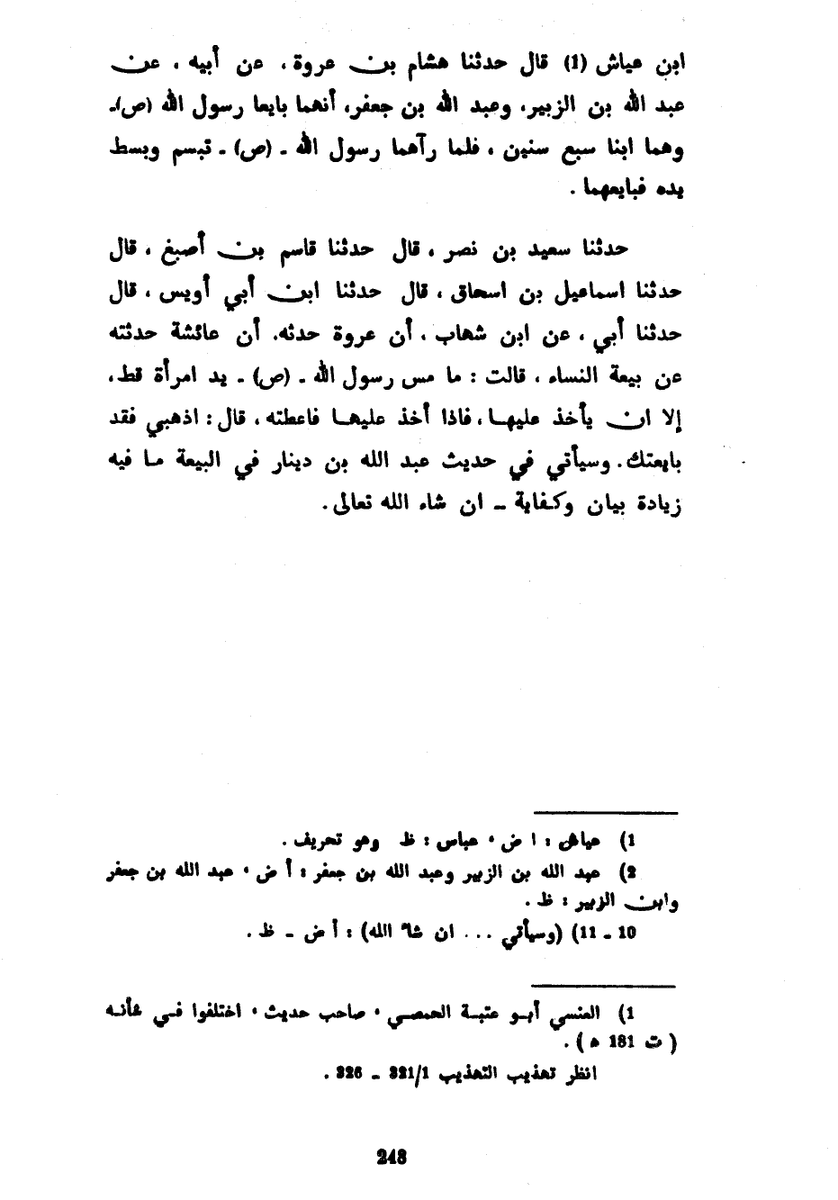 ابن عَيَّاشٍ قَالَ حَدَّثَنَا هِشَامُ بْنُ عُرْوَةَ عَنْ أَبِيهِ عَنْ عَبْدِ اللَّهِ بْنِ الزُّبَيْرِ وَعَبْدِ اللَّهِ بْنِ جَعْفَرٍ أَنَّهُمَا بَايَعَا رَسُولَ اللَّهِ صَلَّى اللَّهُ عَلَيْهِ وَسَلَّمَ وَهُمَا ابْنَا سَبْعِ سِنِينَ فَلَمَّا رَآهُمَا رَسُولُ اللَّهِ صَلَّى اللَّهُ عَلَيْهِ وَسَلَّمَ تَبَسَّمَ وَبَسَطَ يَدَهُ فَبَايَعَهُمَا حَدَّثَنَا سَعِيدُ بْنُ نَصْرٍ قَالَ حَدَّثَنَا قَاسِمُ بْنُ أَصْبَغَ قَالَ حَدَّثَنَا إِسْمَاعِيلُ بْنُ إِسْحَاقَ قَالَ حَدَّثَنَا ابْنُ أَبِي أُوَيْسٍ قَالَ حَدَّثَنَا أَبِي عَنِ ابْنِ شِهَابٍ أَنَّ عُرْوَةَ حَدَّثَهُ أَنَّ عَائِشَةَ حَدَّثَتْهُ عَنْ بَيْعَةِ النِّسَاءِ قَالَتْ مَا مَسَّ رَسُولِ اللَّهِ صَلَّى اللَّهُ عَلَيْهِ وَسَلَّمَ يَدٌ امْرَأَةٍ قَطُّ إِلَّا أَنْ يَأْخُذَ عَلَيْهَا فَإِذَا أَخَذَ عَلَيْهَا فَأَعْطَتْهُ قَالَ اذْهَبِي فَقَدْ بَايَعْتُكِ وَسَيَأْتِي فِي حَدِيثِ عَبْدِ اللَّهِ بْنِ دِينَارٍ فِي الْبَيْعَةِ مَا فِيهِ زِيَادَةُ بَيَانٍ وَكِفَايَةٌ إِنْ شَاءَ اللَّهُ تَعَالَى