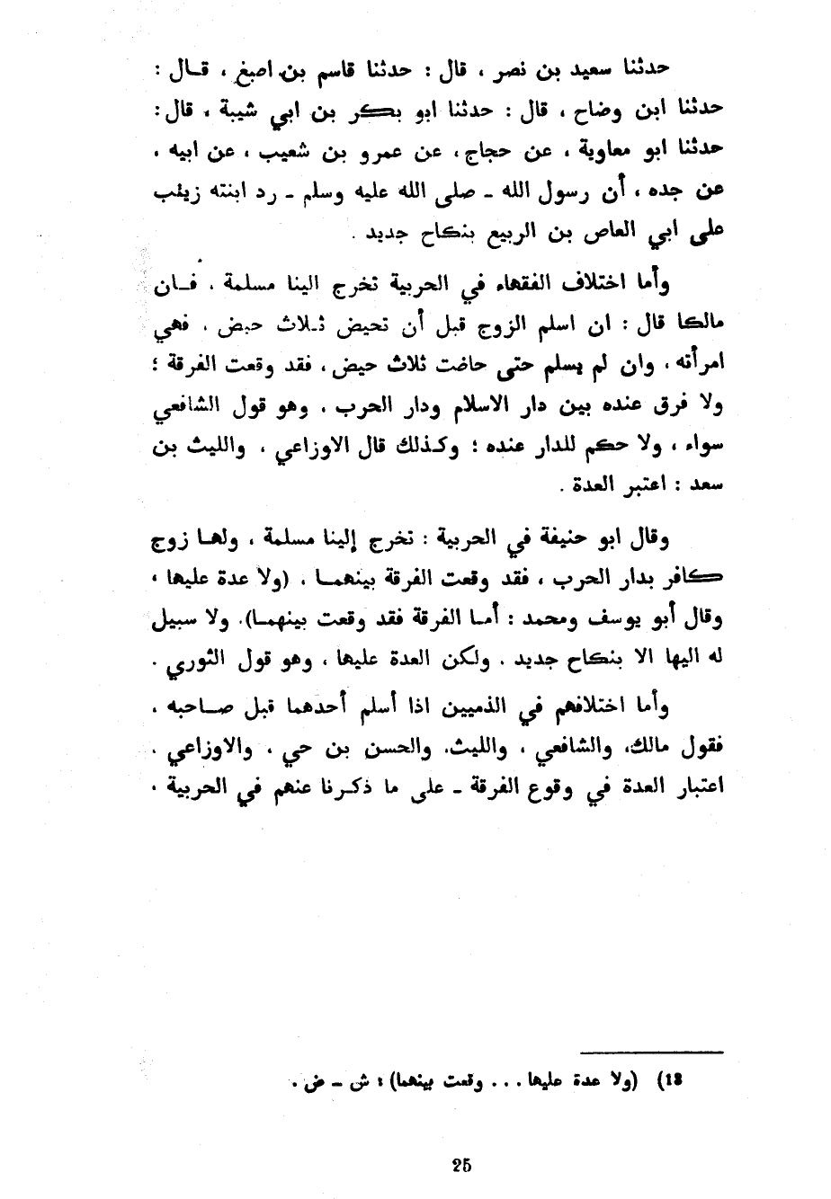 حَدَّثَنَا سَعِيدُ بْنُ نَصْرٍ قَالَ حَدَّثَنَا قَاسِمُ بْنُ أَصْبَغَ قَالَ حَدَّثَنَا ابْنُ وَضَّاحٍ قَالَ حَدَّثَنَا أَبُو بَكْرِ بْنُ أَبِي شَيْبَةَ قَالَ حَدَّثَنَا أَبُو مُعَاوِيَةَ عَنْ حَجَّاجٍ عَنْ عَمْرِو بْنِ شُعَيْبٍ عَنْ أَبِيهِ عَنْ جَدِّهِ أَنَّ رَسُولَ اللَّهِ صَلَّى اللَّهُ عَلَيْهِ وسلم رد ابْنَتَهُ زَيْنَبَ عَلَى أَبِي الْعَاصِ بْنِ الرَّبِيعِ بِنِكَاحٍ جَدِيدٍ وَأَمَّا اخْتِلَافُ الْفُقَهَاءِ فِي الْحَرْبِيَّةِ تَخْرُجُ إِلَيْنَا مُسْلِمَةً فَإِنَّ مَالِكًا قَالَ إِنْ أسلم الزوج قبل أن تتحيض ثَلَاثَ حِيَضٍ فَهِيَ امْرَأَتُهُ وَإِنْ لَمْ يُسْلِمْ حَتَّى حَاضَتْ ثَلَاثَ حِيَضٍ فَقَدْ وَقَعَتِ الْفُرْقَةُ وَلَا فَرْقَ عِنْدَهُ بَيْنَ دَارِ الْإِسْلَامِ وَدَارِ الْحَرْبِ وَهُوَ قَوْلُ الشَّافِعِيِّ سَوَاءٌ وَلَا حُكْمَ لِلدَّارِ عِنْدَهُ وَكَذَلِكَ قَالَ الْأَوْزَاعِيُّ وَاللَّيْثُ بْنُ سَعْدٍ اعْتَبَرَ الْعِدَّةَ وَقَالَ أَبُو حَنِيفَةَ فِي الْحَرْبِيَّةِ تَخْرُجُ إِلَيْنَا مُسْلِمَةً وَلَهَا زَوْجٌ كَافِرٌ بِدَارِ الْحَرْبِ فَقَدْ وَقَعَتِ الْفُرْقَةُ بَيْنَهُمَا (وَلَا عِدَّةَ عَلَيْهَا وَقَالَ أَبُو يُوسُفَ وَمُحَمَّدٌ أَمَّا الْفُرْقَةُ فَقَدْ وَقَعَتْ بَيْنَهُمَا) وَلَا سَبِيلَ لَهُ إِلَيْهَا إِلَّا بِنِكَاحٍ جَدِيدٍ وَلَكِنَّ الْعِدَّةَ عَلَيْهَا وَهُوَ قَوْلُ الثَّوْرِيِّ وَأَمَّا اخْتِلَافُهُمْ فِي الذِّمِّيَّيْنِ إِذَا أَسْلَمَ أَحَدُهُمَا قَبْلَ صَاحِبِهِ فَقَوْلُ مَالِكٍ وَالشَّافِعِيِّ وَاللَّيْثِ وَالْحَسَنِ بْنِ حَيٍّ وَالْأَوْزَاعِيِّ اعْتِبَارُ الْعِدَّةِ فِي وُقُوعِ الْفُرْقَةِ عَلَى مَا ذَكَرْنَا عَنْهُمْ فِي الْحَرْبِيَّةِ