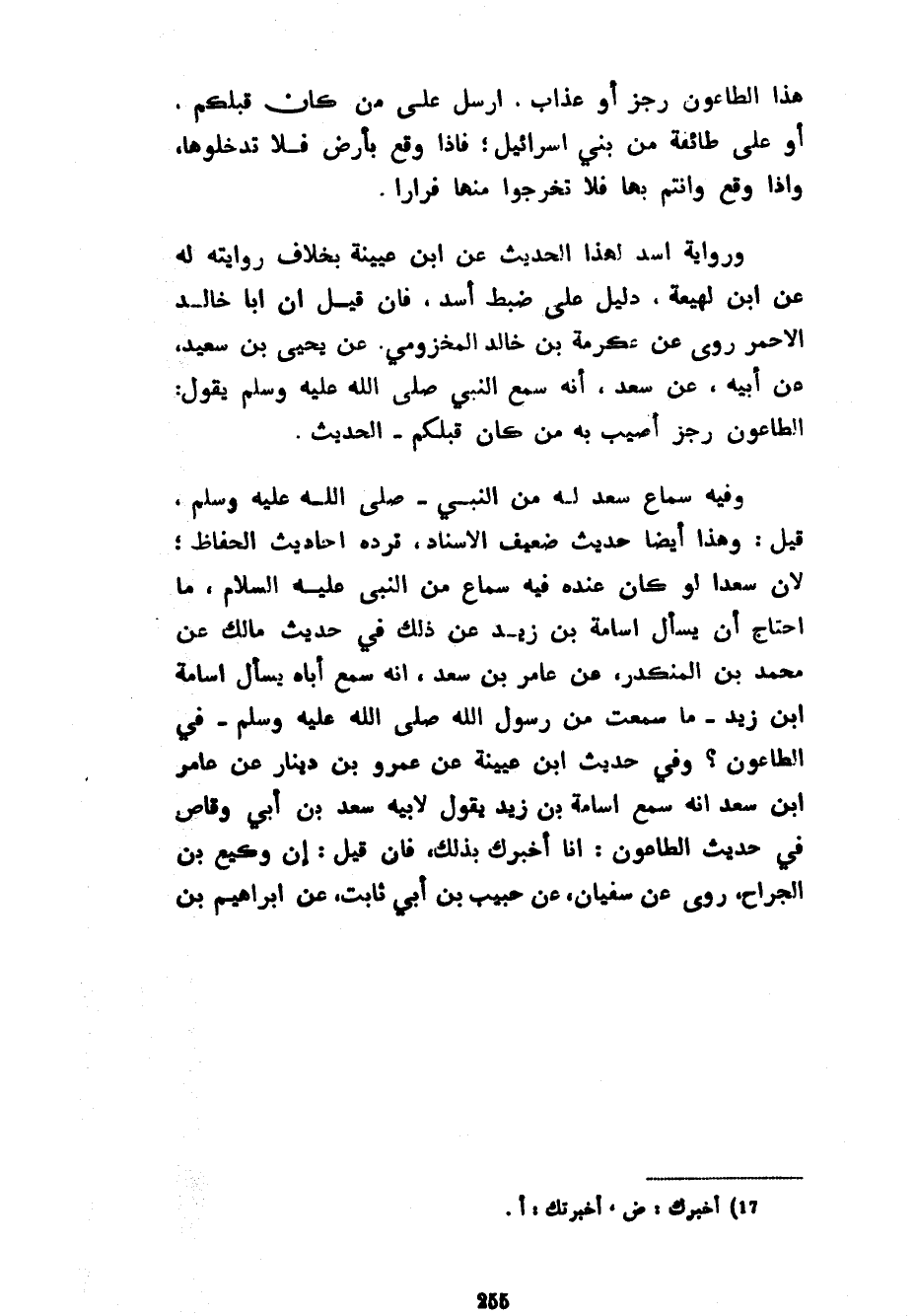 هَذَا الطَّاعُونَ رِجْزٌ أَوْ عَذَابٌ أُرْسِلَ عَلَى مَنْ كَانَ قَبْلَكُمْ أَوْ عَلَى طَائِفَةٍ مِنْ بَنِي إِسْرَائِيلَ فَإِذَا وَقَعَ بِأَرْضٍ فَلَا تَدْخُلُوهَا وَإِذَا وَقَعَ وَأَنْتُمْ بِهَا فَلَا تَخْرُجُوا مِنْهَا فِرَارًا وَرِوَايَةُ أَسَدٍ لِهَذَا الْحَدِيثِ عَنِ ابْنِ عُيَيْنَةَ بِخِلَافِ رِوَايَتِهِ لَهُ عَنِ ابْنِ لَهِيعَةَ دَلِيلٌ عَلَى ضَبْطِ أَسَدٍ فَإِنْ قِيلَ إِنَّ أَبَا خَالِدٍ الْأَحْمَرَ رَوَى عَنْ عِكْرِمَةَ بْنِ خَالِدٍ الْمَخْزُومِيِّ عَنْ يَحْيَى بْنِ سَعِيدٍ عَنْ أَبِيهِ عَنْ سَعْدٍ أَنَّهُ سَمِعَ النَّبِيَّ صَلَّى اللَّهُ عَلَيْهِ وَسَلَّمَ يَقُولُ الطَّاعُونُ رِجْزٌ أُصِيبَ بِهِ مَنْ كَانَ قَبْلَكُمُ الْحَدِيثَ وَفِيهِ سَمَاعُ سَعْدٍ لَهُ مِنَ النَّبِيِّ صَلَّى اللَّهُ عَلَيْهِ وَسَلَّمَ قِيلَ وَهَذَا أَيْضًا حَدِيثٌ ضَعِيفُ الْإِسْنَادِ تَرُدُّهُ أَحَادِيثُ الْحُفَّاظِ لِأَنَّ سَعْدًا لَوْ كَانَ عِنْدَهُ فِيهِ سَمَاعٌ مِنَ النَّبِيِّ عَلَيْهِ السَّلَامُ مَا احْتَاجَ أَنْ يَسْأَلَ أُسَامَةَ بْنَ زَيْدٍ عَنْ ذَلِكَ فِي حَدِيثِ مَالِكٍ عَنْ مُحَمَّدِ بْنِ الْمُنْكَدِرِ عَنْ عَامِرِ بْنِ سَعْدٍ أَنَّهُ سَمِعَ أَبَاهُ يَسْأَلُ أُسَامَةَ بْنَ زَيْدٍ مَا سَمِعْتُ مِنْ رَسُولِ اللَّهِ صَلَّى اللَّهُ عَلَيْهِ وَسَلَّمَ فِي الطَّاعُونِ وَفِي حَدِيثِ ابْنِ عُيَيْنَةَ عن عمرو بن دنيار عَنْ عَامِرِ بْنِ سَعْدٍ أَنَّهُ سَمِعَ أُسَامَةَ بْنَ زَيْدٍ يَقُولُ لِأَبِيهِ سَعْدِ بْنِ أَبِي وَقَّاصٍ فِي حَدِيثِ الطَّاعُونِ أَنَا أُخْبِرُكَ بِذَلِكَ فَإِنْ قِيلَ إِنَّ وَكِيعَ بْنَ الْجَرَّاحِ رَوَى عَنْ سُفْيَانُ عَنْ حَبِيبِ بْنِ أَبِي ثَابِتٍ عَنْ إِبْرَاهِيمَ بْنِ
