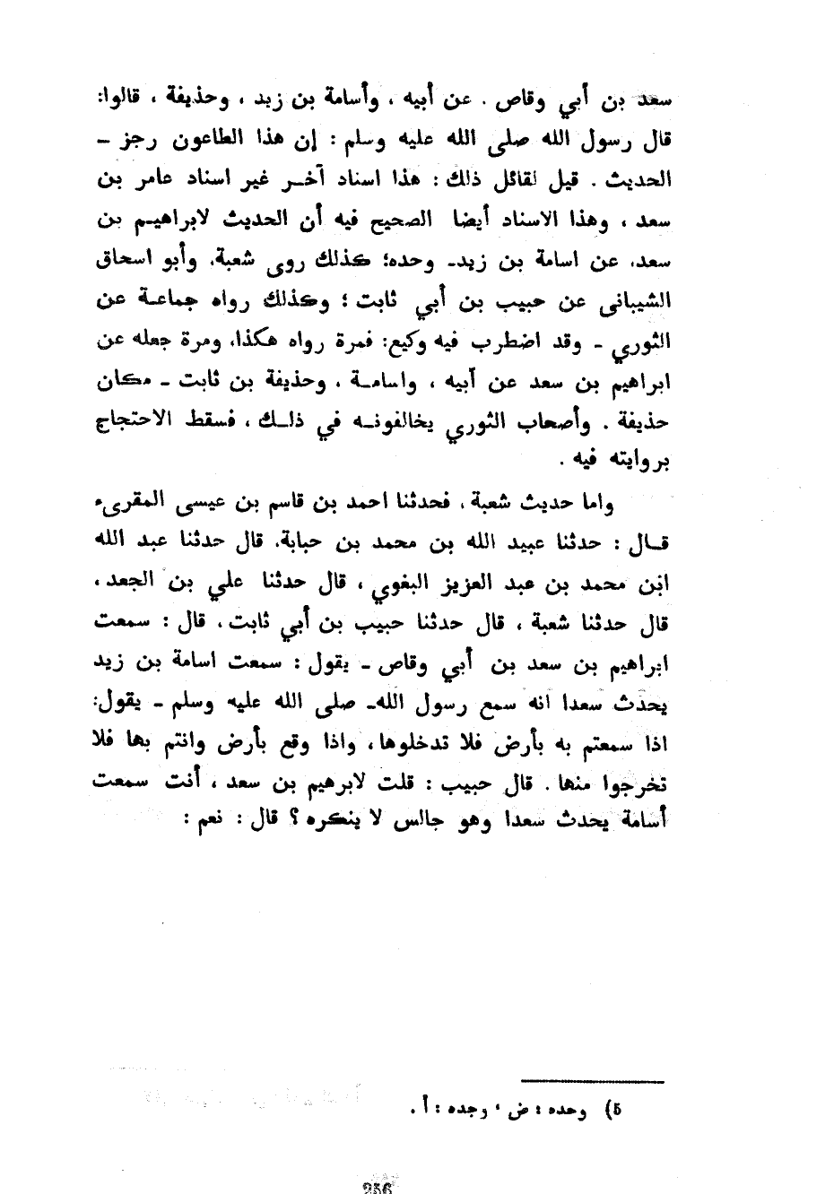 سَعْدِ بْنِ أَبِي وَقَّاصٍ عَنْ أَبِيهِ وَأُسَامَةَ بْنِ زَيْدٍ وَحُذَيْفَةَ قَالُوا قَالَ رَسُولُ اللَّهِ صَلَّى اللَّهُ عَلَيْهِ وَسَلَّمَ إِنَّ هَذَا الطَّاعُونَ رِجْزٌ الْحَدِيثَ قِيلَ لِقَائِلِ ذَلِكَ هَذَا إِسْنَادٌ آخَرُ غَيْرُ إِسْنَادِ عَامِرِ بْنِ سَعْدٍ وَهَذَا الْإِسْنَادُ أَيْضًا الصَّحِيحُ فِيهِ أَنَّ الْحَدِيثَ لِإِبْرَاهِيمَ بْنِ سَعْدٍ عَنْ أُسَامَةَ بْنِ زَيْدٍ وَحْدَهُ كَذَلِكَ رَوَى شُعْبَةُ وَأَبُو إِسْحَاقَ الشَّيْبَانِيُّ عَنْ حَبِيبِ بْنِ أَبِي ثَابِتٍ وَكَذَلِكَ رَوَاهُ جَمَاعَةٌ عَنِ الثَّوْرِيِّ وَقَدِ اضْطَرَبَ فِيهِ وَكِيعٌ فَمَرَّةً رواه هكذا ومرة جَعَلَهُ عَنْ إِبْرَاهِيمَ بْنِ سَعْدٍ عَنْ أَبِيهِ وَأُسَامَةَ وَحُذَيْفَةَ بْنِ ثَابِتٍ مَكَانَ حُذَيْفَةَ وَأَصْحَابُ الثَّوْرِيِّ يُخَالِفُونَهُ فِي ذَلِكَ فَسَقَطَ الِاحْتِجَاجُ بِرِوَايَتِهِ فِيهِ وَأَمَّا حَدِيثُ شُعْبَةَ فَحَدَّثَنَا أَحْمَدُ بْنُ قَاسِمِ بْنِ عِيسَى الْمُقْرِئُ قَالَ حَدَّثَنَا عُبَيْدُ اللَّهِ بْنُ مُحَمَّدِ بْنِ حَبَابَةَ قَالَ حَدَّثَنَا عَبْدُ اللَّهِ بْنُ مُحَمَّدِ بْنِ عَبْدِ الْعَزِيزِ الْبَغَوِيُّ قَالَ حَدَّثَنَا عَلِيُّ بْنُ الْجَعْدِ قَالَ حَدَّثَنَا شُعْبَةُ قَالَ حَدَّثَنَا حَبِيبُ بْنُ أَبِي ثَابِتٍ قَالَ سَمِعْتُ إِبْرَاهِيمَ بْنَ سَعْدِ بْنِ أَبِي وَقَّاصٍ يَقُولُ سَمِعْتُ أُسَامَةَ بْنَ زَيْدٍ يُحَدِّثُ سَعْدًا أَنَّهُ سَمِعَ رَسُولَ اللَّهِ صَلَّى اللَّهُ عَلَيْهِ وَسَلَّمَ يَقُولُ إِذَا سَمِعْتُمْ بِهِ بِأَرْضٍ فَلَا تدخلوها وَإِذَا وَقَعَ بِأَرْضٍ وَأَنْتُمْ بِهَا فَلَا تَخْرُجُوا مِنْهَا قَالَ حَبِيبٌ قُلْتُ لِإِبْرَاهِيمَ بْنِ سَعْدٍ أَنْتَ سَمِعْتَ أُسَامَةَ يُحَدِّثُ سَعْدًا وَهُوَ جَالِسٌ لَا يُنْكِرُهُ قَالَ نَعَمْ