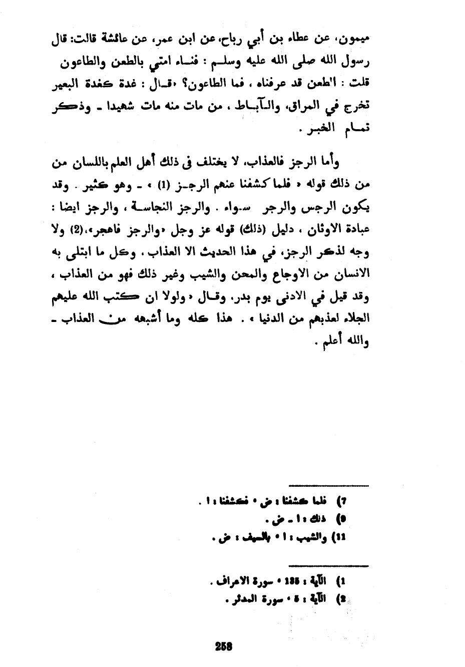 مَيْمُونٍ عَنْ عَطَاءِ بْنِ أَبِي رَبَاحٍ عَنِ ابْنِ عُمَرَ عَنْ عَائِشَةَ قَالَتْ قَالَ رَسُولُ اللَّهِ صَلَّى اللَّهُ عَلَيْهِ وَسَلَّمَ فَنَاءُ أُمَّتِي بِالطَّعْنِ وَالطَّاعُونِ قُلْتُ الطَّعْنُ قَدْ عَرَفْنَاهُ فَمَا الطَّاعُونُ قَالَ غُدَّةٌ كَغُدَّةِ الْبَعِيرِ تَخْرُجُ فِي الْمَرَاقِ وَالْآبَاطِ مَنْ مَاتَ مِنْهُ مَاتَ شَهِيدًا وَذَكَرَ تَمَامَ الْخَبَرِ وَأَمَّا الرِّجْزُ فَالْعَذَابُ لَا يَخْتَلِفُ فِي ذَلِكَ أَهْلُ الْعِلْمِ بِاللِّسَانِ مِنْ ذَلِكَ قَوْلُهُ فَلَمَّا كَشَفْنَا عَنْهُمُ الرِّجْزَ وَهُوَ كَثِيرٌ وَقَدْ يَكُونُ الرِّجْسُ وَالرِّجْزُ سَوَاءً وَالرِّجْزُ النَّجَاسَةُ وَالرُّجْزُ أَيْضًا عِبَادَةُ الْأَوْثَانِ دَلِيلُ (ذَلِكَ) قَوْلُهُ عَزَّ وَجَلَّ وَالرُّجْزَ فَاهْجُرْ وَلَا وَجْهَ لِذِكْرِ الرِّجْزِ فِي هَذَا الْحَدِيثِ إِلَّا الْعَذَابَ وَكُلُّ مَا ابْتُلِيَ بِهِ الْإِنْسَانُ مِنَ الْأَوْجَاعِ وَالْمِحَنِ وَالشَّيْبِ وَغَيْرِ ذَلِكَ فَهُوَ مِنَ الْعَذَابِ وَقَدْ قِيلَ فِي الْأَدْنَى يَوْمَ بَدْرٍ وَقَالَ وَلَوْلَا أَنْ كَتَبَ اللَّهُ عَلَيْهِمُ الْجَلَاءَ لعذبهم من الدُّنْيَا هَذَا كُلُّهُ وَمَا أَشْبَهَهُ مِنَ الْعَذَابِ والله أعلم