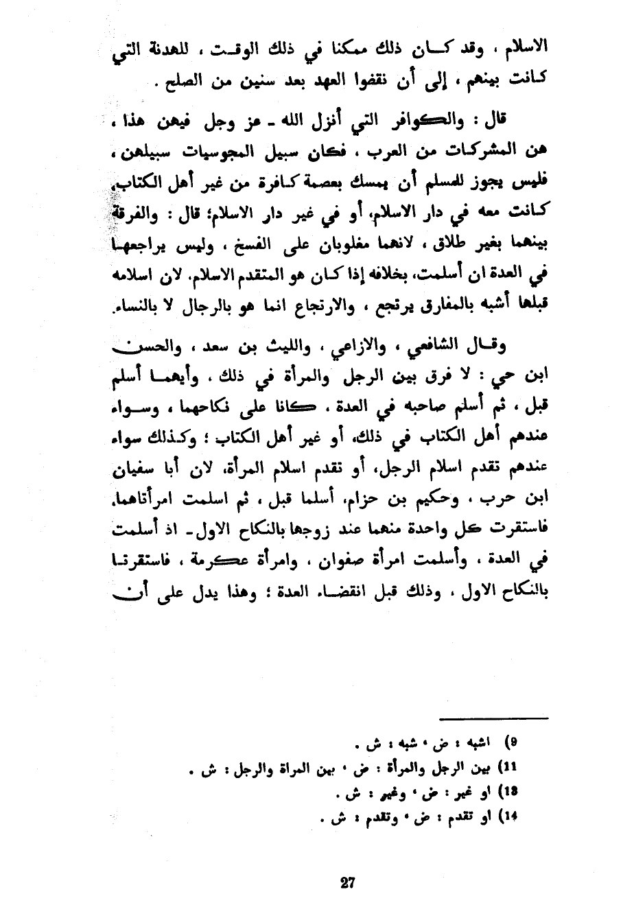 الْإِسْلَامُ وَقَدْ كَانَ ذَلِكَ مُمْكِنًا فِي ذَلِكَ الْوَقْتِ لِلْهُدْنَةِ الَّتِي كَانَتْ بَيْنَهُمْ إِلَى أَنْ نَقَضُوا الْعَهْدَ بَعْدَ سِنِينَ مِنَ الصُّلْحِ قَالَ وَالْكَوَافِرُ الَّتِي أَنْزَلَ اللَّهُ عَزَّ وَجَلَّ فِيهِنَّ هَذَا هُنَّ الْمُشْرِكَاتُ مِنَ الْعَرَبِ فَكَانَ سَبِيلُ المجوسيان سَبِيلَهُنَّ فَلَيْسَ يَجُوزُ لِلْمُسْلِمِ أَنْ يُمْسِكَ بِعِصْمَةِ كَافِرَةٍ مِنْ غَيْرِ أَهْلِ الْكِتَابِ كَانَتْ مَعَهُ فِي دَارِ الْإِسْلَامِ أَوْ فِي غَيْرِ دَارِ الْإِسْلَامِ قَالَ وَالْفُرْقَةُ بَيْنَهُمَا بِغَيْرِ طَلَاقٍ لِأَنَّهُمَا مَغْلُوبَانِ عَلَى الْفَسْخِ وَلَيْسَ يُرَاجِعُهَا فِي الْعِدَّةِ إِنْ أَسْلَمَتْ بِخِلَافِهِ إِذَا كَانَ هُوَ الْمُتَقَدِّمَ الْإِسْلَامِ لِأَنَّ إِسْلَامَهُ قَبْلَهَا أَشْبَهُ بِالْمُفَارِقِ يَرْتَجِعُ وَالِارْتِجَاعُ إِنَّمَا هُوَ بِالرِّجَالِ لَا بِالنِّسَاءِ وَقَالَ الشَّافِعِيُّ وَالْأَوْزَاعِيُّ وَاللَّيْثُ بْنُ سَعْدٍ وَالْحَسَنُ بْنُ حَيٍّ لَا فَرْقَ بَيْنَ الرَّجُلِ وَالْمَرْأَةِ فِي ذَلِكَ وَأَيُّهُمَا أَسْلَمَ قَبْلُ ثُمَّ أَسْلَمَ صَاحِبُهُ فِي الْعِدَّةِ كَانَا عَلَى نِكَاحِهِمَا وَسَوَاءٌ عِنْدَهُمْ أَهْلُ الْكِتَابِ فِي ذَلِكَ أَوْ غَيْرُ أَهْلِ الْكِتَابِ وَكَذَلِكَ سَوَاءٌ عِنْدَهُمْ تَقَدَّمَ إِسْلَامُ الرَّجُلِ أَوْ تَقَدَّمَ إِسْلَامُ الْمَرْأَةِ لِأَنَّ أَبَا سُفْيَانَ بْنَ حَرْبٍ وَحَكِيمَ بْنَ حِزَامٍ أَسْلَمَا قَبْلُ ثُمَّ أَسْلَمَتِ امْرَأَتَاهُمَا فَاسْتَقَرَّتْ كُلُّ وَاحِدَةٍ مِنْهُمَا عِنْدَ زَوْجِهَا بِالنِّكَاحِ الْأَوَّلِ إِذْ أَسْلَمَتْ فِي الْعِدَّةِ وَأَسْلَمَتِ امْرَأَةُ صَفْوَانَ وَامْرَأَةُ عِكْرِمَةَ فَاسْتَقَرَّتَا بِالنِّكَاحِ الْأَوَّلِ وَذَلِكَ قَبْلَ انْقِضَاءِ الْعِدَّةِ وَهَذَا يَدُلُّ عَلَى أَنَّ